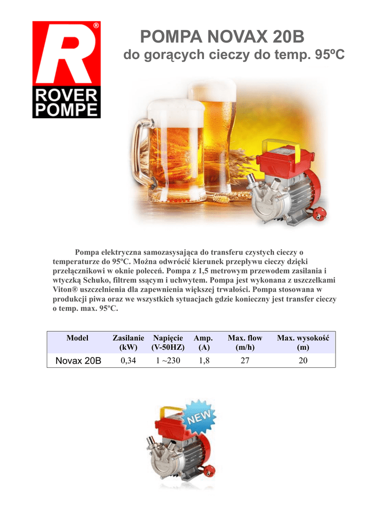 POMPA NOVAX 20B do gorących cieczy do temp. 95ºC Pompa elektryczna samozasysająca do transferu czystych cieczy o temperaturze do 95ºC. Można odwrócić kierunek przepływu cieczy dzięki przełącznikowi w oknie poleceń. Pompa z 1,5 metrowym przewodem zasilania i wtyczką Schuko, filtrem ssącym i uchwytem. Pompa jest wykonana z uszczelkami Viton® uszczelnienia dla zapewnienia większej trwałości. Pompa stosowana w produkcji piwa oraz we wszystkich sytuacjach gdzie konieczny jest transfer cieczy o temp. max. 95ºC. Model Novax 20B Zasilanie Napięcie (kW) (V-50HZ) 0,34 1 ~230 Amp. (A) Max. flow (m/h) Max. wysokość (m) 1,8 27 20