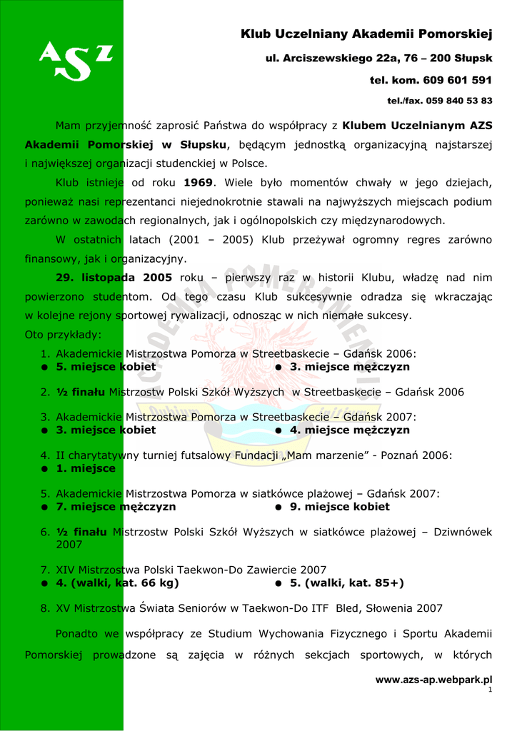 Klub Uczelniany Akademii Pomorskiej ul. Arciszewskiego 22a, 76 – 200 Słupsk tel. kom. 609 601 591 tel./fax. 059 840 53 83 Mam przyjemność zaprosić Państwa do współpracy z Klubem Uczelnianym AZS Akademii Pomorskiej w Słupsku, będącym jednostką organizacyjną najstarszej i największej organizacji studenckiej w Polsce. Klub istnieje od roku 1969. Wiele było momentów chwały w jego dziejach, ponieważ nasi reprezentanci niejednokrotnie stawali na najwyższych miejscach podium zarówno w zawodach regionalnych, jak i ogólnopolskich czy międzynarodowych. W ostatnich latach (2001 – 2005) Klub przeżywał ogromny regres zarówno finansowy, jak i organizacyjny. 29. listopada 2005 roku – pierwszy raz w historii Klubu, władzę nad nim powierzono studentom. Od tego czasu Klub sukcesywnie odradza się wkraczając w kolejne rejony sportowej rywalizacji, odnosząc w nich niemałe sukcesy. Oto przykłady: 1. Akademickie Mistrzostwa Pomorza w Streetbaskecie – Gdańsk 2006: ● 5. miejsce kobiet ● 3. miejsce mężczyzn 2. ½ finału Mistrzostw Polski Szkół Wyższych w Streetbaskecie – Gdańsk 2006 3. Akademickie Mistrzostwa Pomorza w Streetbaskecie – Gdańsk 2007: ● 3. miejsce kobiet ● 4. miejsce mężczyzn 4. II charytatywny turniej futsalowy Fundacji „Mam marzenie” - Poznań 2006: ● 1. miejsce 5. Akademickie Mistrzostwa Pomorza w siatkówce plażowej – Gdańsk 2007: ● 7. miejsce mężczyzn ● 9. miejsce kobiet 6. ½ finału Mistrzostw Polski Szkół Wyższych w siatkówce plażowej – Dziwnówek 2007 7. XIV Mistrzostwa Polski Taekwon-Do Zawiercie 2007 ● 4. (walki, kat. 66 kg) ● 5. (walki, kat. 85+) 8. XV Mistrzostwa Świata Seniorów w Taekwon-Do ITF Bled, Słowenia 2007 Ponadto we współpracy ze Studium Wychowania Fizycznego i Sportu Akademii Pomorskiej prowadzone są zajęcia w różnych sekcjach sportowych, w których www.azs-ap.webpark.pl 1 Klub Uczelniany Akademii Pomorskiej ul. Arciszewskiego 22a, 76 – 200 Słupsk tel. kom. 609 601 591 tel./fax. 059 840 53 83 uczestniczy duża liczba studentów oscylująca w granicach 400 – 500 osób. Klub uczestniczy aktywnie nie tylko w organizacji zadań sportowych, ale włącza się także w inne przedsięwzięcia, np. Juwenalia czy Bałtycki Festiwal Nauki. Latem tego roku (2007), wspólnie ze Słupskim Klubem TaeKwon-DO ITF „Sokdo” zorganizowaliśmy bezpłatną I Letnią Akademię TaeKwon-Do pod patronatem JM Rektor Akademii Pomorskiej prof. Danuty Gierczyńskiej, w której wzięło udział ponad 100 osób ze Słupska i okolic. Impreza była szeroko reklamowana w prasie regionalnej, a jej uwieńczeniem był pokaz na XIII Igrzyskach Polonijnych. Jak widać na powyższych przykładach, w Klubie naszym drzemie ogromny potencjał, a jego ogólnopolski zasięg umożliwia wykorzystanie go jako swoistej i oryginalnej platformy promocji produktu skierowanego do młodego, dynamicznego klienta. W tym roku akademickim planujemy jeszcze więcej imprez z naszym udziałem, w kolejnych zaś obchodzić będziemy 100 – lecie naszej organizacji oraz 40 – lecie powstania Klubu. Poniższe opracowanie zostało przygotowane w celu wskazania możliwości, jakie stwarza współpraca z naszym Klubem. Proszę zatem traktować je jako wstępną propozycję do negocjacji końcowych warunków zawartych w umowie. Przedstawiony poniżej pakiet jest tylko zarysem możliwości reklamowych i sponsorskich, jakie oferuje Klub Uczelniany AZS Akademii Pomorskiej w Słupsku. Dlatego zachęcamy do ścisłej współpracy w tworzeniu scenariusza reklamowo – promocyjnego, który w pełni usatysfakcjonuje Państwa firmę. Jesteśmy otwarci na wszelkie propozycje i sugestie, które pozwolą osiągnąć wspólny sukces sportowy oraz jednoczenie spełnić Państwa oczekiwania. Ze sportowym pozdrowieniem, Karol Winiszewski – prezes www.azs-ap.webpark.pl 2 Klub Uczelniany Akademii Pomorskiej ul. Arciszewskiego 22a, 76 – 200 Słupsk tel. kom. 609 601 591 tel./fax. 059 840 53 83 Korzyści dla Sponsora: • zyskanie zaufania najaktywniejszej grupy docelowej – społeczności studentów i pracowników, dla których sport jest stylem życia, ludzi młodych, pewnych siebie, otwartych na innych i poszukujących nowości, • skojarzenie Państwa Firmy ze wsparciem sportu akademickiego, dziedziny rozwojowej, oczekującej na stworzenie warunków do przyszłych sukcesów, • możliwość bezpośredniego dotarcia do kilku tysięcy odbiorców – kibiców, działaczy,itd. • zapewnienie stałej informacji i dystrybucji materiałów promocyjnych studentom i członkom AZS w siedzibie Klubu, podczas zajęć sekcji, osobom z zewnątrz podczas imprez i na Uczelni. Pakiet praw i przywilejów Sponsora: 1. wyłączność promocyjna w kategorii produktu lub usługi, 2. prawo do używania tytułu Sponsora Klubu Uczelnianego Pomorskiej w Słupsku wraz z jego logo AZS Akademii (gryf i nazwa Uczelni) do własnych celów reklamowych w uzgodnieniu z Klubem i Władzami Uczelni, 3. umieszczanie reklamy Sponsora w najbardziej atrakcyjnych miejscach, w dniach rozgrywania zawodów i innych wydarzeń, 4. umieszczenie reklamy Sponsora i informacji o Jego działalności na materiałach promujących imprezy (plakaty, ulotki, zaproszenia, programy, biuletyny, komunikaty, identyfikatory, koszulki, reklamy, ruchome i inne formy promocji), 5. przekazywanie uzgodnionych informacji o Sponsorze przez spikera podczas trwania zawodów, 6. reklama w internecie na stronach Klubu i Uczelni wraz z hiperłączem do strony Sponsora, 7. nadanie Sponsorowi przywileju „gościa honorowego” oraz umożliwienie uczestnictwa uzgodnionych ilości VIP podczas imprez towarzyszących zawodom, np. konferencje prasowe, spotkania towarzyskie, itp., www.azs-ap.webpark.pl 3 Klub Uczelniany Akademii Pomorskiej ul. Arciszewskiego 22a, 76 – 200 Słupsk tel. kom. 609 601 591 tel./fax. 059 840 53 83 8. umożliwienie Sponsorowi organizowania punktów informacyjno – promocyjnych, stoisk handlowych, 