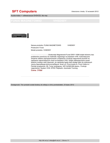 SFT Computers Utworzono: środa, 12 wrzesień 2012 Audio/video > odtwarzacze DVD/CD, blu-ray FUNAI MAGNETOWID VHSD50Y Nazwa produktu: FUNAI MAGNETOWID VHSD50Y Producent: Funai Model produktu: VHSD50Y Doskonały Magnetowid Funai D50Y-100M dzięki któremu bez problemów powrócisz do materiału nagranego na kasetach VHS. Automatyczne strojenie ułatwia zaprogramowanie urządzenia a funkcja nagrywania pozwoli na zapisanie najcenniejszych chwil na kasetach VHS. Dzięki zabezpieczeniu przed dziećmi możesz mieć pewność, że najmłodsi będą mieli dostęp tylko do wybranych rzeczy.Specyfikacja technicznaZłącza: Scart x2, Front-Audio-In, Front Video-In.Pamięć programów: 99- Tuner analogowy. HiFi A2/NICAM stereo,- Funkcja nagrywania- System VHS- NTSC Playback- Automatic Tunning Cena: 318zł Dostępność: Ten produkt został dodany do sklepu w dniu poniedziałek, 23 lipiec 2012 http://sft.net.pl | [email protected] | | Strona 1/1