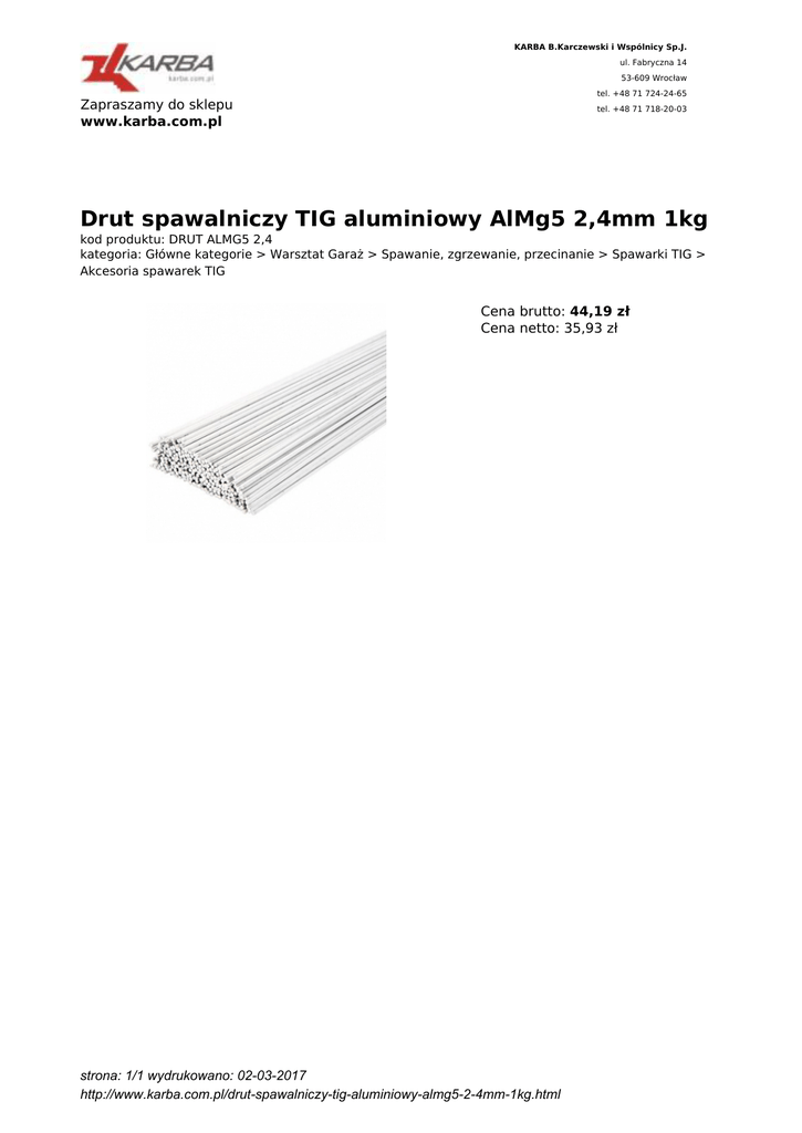 KARBA B.Karczewski i Wspólnicy Sp.J. ul. Fabryczna 14 53-609 Wrocław tel. +48 71 724-24-65 Zapraszamy do sklepu www.karba.com.pl tel. +48 71 718-20-03 Drut spawalniczy TIG aluminiowy AlMg5 2,4mm 1kg kod produktu: DRUT ALMG5 2,4 kategoria: Główne kategorie > Warsztat Garaż > Spawanie, zgrzewanie, przecinanie > Spawarki TIG > Akcesoria spawarek TIG Cena brutto: 44,19 zł Cena netto: 35,93 zł strona: 1/1 wydrukowano: 02-03-2017 http://www.karba.com.pl/drut-spawalniczy-tig-aluminiowy-almg5-2-4mm-1kg.html