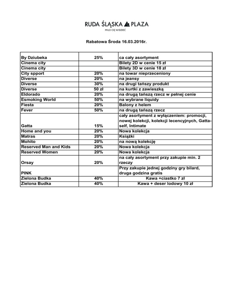 Rabatowa Środa 16.03.2016r. By Dziubeka Cinema city Cinema city City spport Diverse Diverse Diverse Eldorado Esmoking World Fiesta Fever 25% 20% 20% 30% 50 zł 20% 50% 20% 50% Gatta Home and you Matras Mohito Reserved Man and Kids Reserved Women 15% 20% 20% 20% 20% 20% Orsay 20% PINK Zielona Budka Zielona Budka 40% 40% ca cały asortyment Bilety 2D w cenie 15 zł Bilety 3D w cenie 18 zł na towar nieprzeceniony na jeansy na drugi tańszy produkt na kurtki z zawieszką na drugą tańszą rzecz w pełnej cenie na wybrane liquidy Balony z helem na drugą tańszą rzecz cały asortyment z wyłączeniem: promocji, nowej kolekcji, kolekcji lecencyjnych, Gattaself, Intimate Nowa kolekcja Książki na nową kolekcję Nowa kolekcja Nowa kolekcja na cały asortyment przy zakupie min. 2 rzeczy Przy zakupie jednej godziny gry bilard, druga godzina gratis Kawa +ciastko 7 zł Kawa + deser lodowy 10 zł