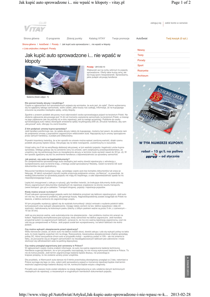Jak kupić auto sprowadzone i... nie wpaść w kłopoty - vitay.pl Page 1 of 2 zaloguj się Strona główna O programie Zbieraj punkty Katalog VITAY Twoje promocje AutoŚwiat załóż konto w serwisie Twój koszyk (0 szt.) Strona główna / AutoŚwiat / Porady / Jak kupić auto sprowadzone i... nie wpaść w kłopoty « Lista artykułów z kategorii: Porady Newsy Jak kupić auto sprowadzone i... nie wpaść w kłopoty Porady / 2013-02-13 Większość aut na rynku wtórnym to pojazdy sprowadzone. Oferty takie kuszą ceną, ale też kryją sporo niespodzianek. Sprawdzamy, jakie pułapki ukrywają handlarze Testy Porady Sport Rozrywka Archiwum Galeria (ilość zdjęć: 1) Kto ponosi koszty akcyzy i recyklingu? Często w ogłoszeniach aut sprowadzonych pojawia się wzmianka, że auto jest „do opłat”. Zanim wybierzemy się na oględziny takiego samochodu, warto ustalić, jakie koszty nas czekają. Informacja, że na kupującego zrzucone są wszelkie niezbędne opłaty, wróży kłopoty. Zgodnie z prawem podatek akcyzowy musi odprowadzić osoba sprowadzająca pojazd na terytorium Polski. Na złożenie zgłoszenia akcyzowego jest 14 dni od momentu wwiezienia samochodu na terytorium Polski, a miesiąc na jego zapłacenie (ale nie później niż w dniu rejestracji, jeśli ta nastąpi wcześniej). Podobnie do osoby sprowadzającej auto należy obowiązek wniesienia opłaty recyklingowej (500 zł). Zmuście handlarza, aby sam „akcyzował” auto, oferując mu zwrot kosztów. Z kim podpisać umowę kupna-sprzedaży? Jeśli handlarz poinformuje nas, że opłata akcyzy należy do kupującego, możemy być pewni, że podsunie nam do podpisania umowę z poprzednim zagranicznym właścicielem auta. Najczęściej są to umowy sporządzone przez samych handlarzy, a podpis jest sfałszowany. Prywatni importerzy twierdzą, że w ten sposób na umowie można wpisać zaniżoną wartość, dzięki czemu podatek akcyzowy będzie niższy. Decydując się na takie rozwiązanie, uczestniczymy w oszustwie. Urząd celny ma 5 lat na weryfikację deklaracji akcyzowej, w tym wartości pojazdu i legalności umów kupnasprzedaży. Dlatego godząc się na zaniżenie ceny na umowie, sami zwiększamy prawdopodobieństwo, że urzędnicy się nią zainteresują (kara za niezapłacenie akcyzy w terminie może wynieść nawet do 30 tys. zł). W ten sposób zgadzamy się też na zwolnienie handlarza z odpowiedzialności za sprzedany samochód. Jak poznać, czy auto ma legalnedokumenty? Do zarejestrowania sprowadzonego auta niezbędny jest ważny dowód rejestracyjny z adnotacją o wyrejestrowaniu auta na terenie kraju, z którego został sprowadzony! Niestety, nawet na terenie UE wzór dokumentów nie jest ujednolicony. Nieuczciwi handlarze korzystają z tego, sprzedając często auto bez kompletu dokumentów lub wręcz je fałszując. W takich sytuacjach oszuści zwykle proponują podpisanie umowy „na Niemca”, co powoduje, że według dokumentów ze sprzedażą pojazdu nie mają nic wspólnego, a cała odpowiedzialność spada na nic niepodejrzewającego kupca. Lepiej też zrezygnować z zakupu w sytuacji, gdy handlarz twierdzi, że brakujące dokumenty dośle później. Wzory zagranicznych dokumentów niezbędnych do rejestracji znajdziecie na stronie resortu transportu (www.transport. gov.pl) w zakładce: Transport drogowy, pojazdy i rejestracja pojazdów. Kiedy można wracać na kołach? Przed zakupem sprowadzonego pojazdu warto też dokładnie przyjrzeć się tablicom rejestracyjnym. Jeśli auto ich nie ma, nie stanowi to problemu, ale generuje koszty. Najprawdopodobniej zostało ściągnięte do Polski na lawecie, a tablice zwrócono do zagranicznego urzędu. W tym przypadku wystarczy zgłosić się do wydziału komunikacji i złożyć wniosek o wydanie polskich tablic tymczasowych oraz wykupić ubezpieczenie. Uwagę należy zwrócić na tzw. tablice wyjazdowe i datę ich ważności, nadrukowaną na kolorowym pasku (blachy z żółtym paskiem ważne są przez 5 dni, z czerwonym – 15 lub 30 dni). Jeśli są one jeszcze ważne, auto automatycznie ma ubezpieczenie – bez problemu można nim wracać na kołach. Najbardziej skomplikowana jest sytuacja, kiedy samochód ma tablice zagraniczne. Jeśli handlarz przyjechał autem na zagranicznych tablicach, oznacza to, że ma ono ważną rejestrację zagraniczną, czyli nie uda się go zarejestrować w Polsce. Jeśli pojazd został tam wyrejestrowany, na takich tablicach nie wolno jeździć. Czy można wykupić ubezpieczenie przed rejestracją? Wielu kierowców uważa, że skoro auto ma tablice (nawet obce), dowód zakupu i uda się wykupić polisę na takie auto, to może legalnie wyjechać nim na drogę. Rzeczywiście, towarzystwa ubezpieczeniowe chętnie sprzedają polisę OC, która rzeczywiście chroni auto w przypadku kolizji – wystarczy podać nr VIN – ale nie zmienia to faktu, że poruszanie się po drogach samochodem na niezalegalizowanych tablicach jest zabronione i może skończyć się odholowaniem auta na parking depozytowy. Czy ważny przegląd zagraniczny jest uznawany w Polsce? W ogłoszeniach często można znaleźć informacje, że auto ma ważne zagraniczne badanie techniczne. Handlarze sugerują klientom, że w tym przypadku oszczędzają, bo nie muszą wykonywać badania w Polsce. To nie do końca prawda. Jeśli termin zagranicznego badania będzie dłuższy, niż przewidują to krajowe przepisy, to nie zostanie uznany przez urzędnika. Dla przykładu, w Niemczech auta starsze niż 5-letnie przechodzą obowiązkowy przegląd co 2 lata, natomiast w Polsce wymaga się tego co roku, zatem jeśli sprowadzony pojazd w momencie rejestracji będzie miał termin ważności zagranicznego badania dłuższy niż rok, konieczna będzie wizyta u diagnosty. Ponadto auto zawsze może zostać odesłane na stację diagnostyczną w celu ustalenia danych technicznych niezbędnych do rejestracji, a niezawartych w oryginalnych niemieckich dokumentach pojazdu. http:/
