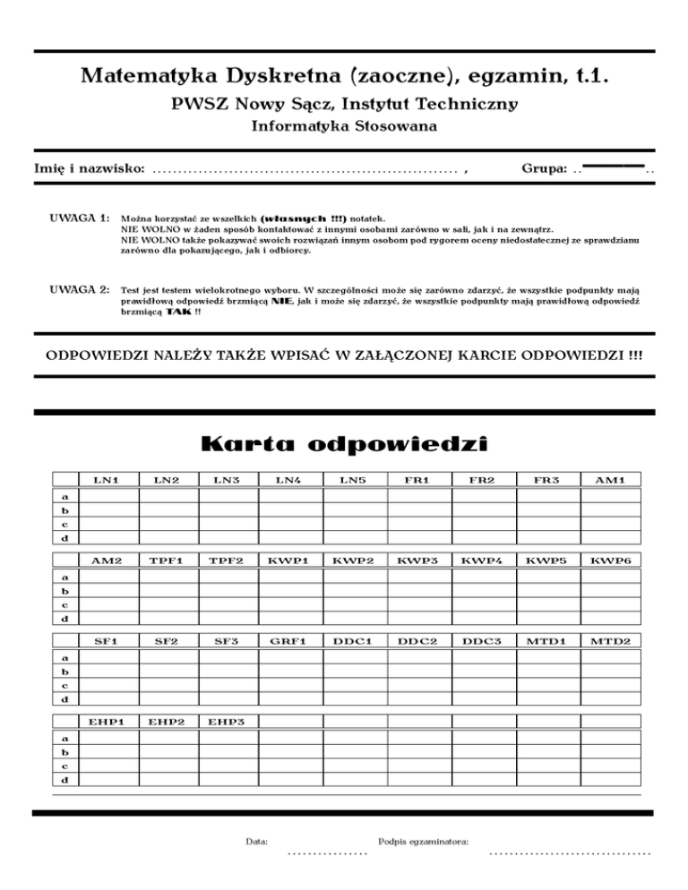 Matematyka Dyskretna (zaoczne), egzamin, t.1.