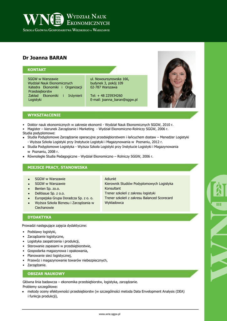 Dr Joanna BARAN KONTAKT SGGW w Warszawie Wydział Nauk Ekonomicznych Katedra Ekonomiki i Organizacji Przedsiębiorstw Zakład Ekonomiki i Inżynierii Logistyki ul. Nowoursynowska 166, budynek 3, pokój 109 02-787 Warszawa Tel: + 48 225934260 E-mail: [email protected] WYKSZTAŁCENIE • Doktor nauk ekonomicznych w zakresie ekonomii - Wydział Nauk Ekonomicznych SGGW, 2010 r. • Magister – kierunek Zarządzanie i Marketing - Wydział Ekonomiczno-Rolniczy SGGW, 2006 r. Studia podyplomowe: Studia Podyplomowe Zarządzanie operacyjne przedsiębiorstwem i łańcuchem dostaw – Menedżer Logistyki - Wyższa Szkoła Logistyki przy Instytucie Logistyki i Magazynowania w Poznaniu, 2012 r. Studia Podyplomowe Logistyka - Wyższa Szkoła Logistyki przy Instytucie Logistyki i Magazynowania w Poznaniu, 2008 r. Równoległe Studia Pedagogiczne - Wydział Ekonomiczno – Rolniczy SGGW, 2006 r. MIEJSCE PRACY, STANOWISKA SGGW w Warszawie SGGW w Warszawie Benten Sp. zo.o. Delitissue Sp. z o.o. Europejska Grupa Doradcza Sp. z o. o. Wyższa Szkoła Biznesu i Zarządzania w Ciechanowie Adiunkt Kierownik Studiów Podyplomowych Logistyka Konsultant Trener szkoleń z zakresu logistyki Trener szkoleń z zakresu Balanced Scorecard Wykładowca DYDAKTYKA Prowadzi następujące zajęcia dydaktyczne: • • • • • • • • Podstawy logistyki, Zarządzanie logistyczne, Logistyka zaopatrzenia i produkcji, Sterowanie zapasami w przedsiębiorstwie, Gospodarka magazynowa i opakowania, Planowanie sieci logistycznej, Przewóz i magazynowanie towarów niebezpiecznych, Zarządzanie. OBSZAR NAUKOWY Główna linia badawcza – ekonomika przedsiębiorstw, logistyka, zarządzanie. Problemy szczegółowe: metody oceny efektywności przedsiębiorstw (w szczególności metoda Data Envelopment Analysis (DEA) i funkcja produkcji), www.wne.sggw.pl systemy logistyczne w agrobiznesie, zarządzanie i planowanie logistyczne w przedsiębiorstwach, logistyka zaopatrzenia i produkcji, magazynowanie, zarządzanie strategiczne, w tym szczególnie koncepcja Balanced Scorecard, wielokryterialne metody wspomagania decyzji w przedsiębiorstwach. WYKAZ PUBLIKACJI Rozprawa doktorska: „Efektywność skali produkcji w sektorze przetwórstwa mleka” 1. Oryginalne opublikowane prace twórcze: 1. Baran J., 2013: Efficiency of the production scale of polish dairy companies based on Data Envelopment Analysis, Acta Scientiarum Oeconomia, 2013 nr 2, s. 5-13. 2. Baran J., Żak J., Multiple Criteria Evaluation of transportation performance for selected agribusiness companies, Procedia - Social and Behavioral Sciences, 2013 3. Baran J., Górecka A., Efficiency of air transport based on Data Envelopment Analysis, Logistics&Sustainable Transport Conference, 13-15 June 2013, Celje, Słowenia [Dokument elektroniczny] 4. Baran J., Mayer T., 2012: Aspekty ekonomiczne zmiany systemu dystrybucji w przedsiębiorstwie – studium przypadku, Total logistic management : XVI konferencja logistyki stosowanej: Zakopane 6 - 8 grudnia 2012 r. [Dokument elektroniczny]. - Zakopane, 2012, s. 1-8 5. Baran J., 2012: Differentiation of logistics excellence in selected agribusiness companies, Carpathian Logistics Congress: November 7th - 9th 2012, Priessnitz Spa, Jeseník, Czech Republic, EU [Dokument elektroniczny], Jesenik, 2012, s. 1-6 6. Baran J., 2012: The production scale of Polish dairy companies and their economic and financial result, Roczniki Naukowe Stowarzyszenia Ekonomistów Rolnictwa i Agrobiznesu 2012, T. 14, z. 6, s. 7-11 7. Baran J., 2012: Zastosowanie metody Data Envelopment Analysis do badania efektywności portów , Logistyka 2012, nr 4, CD nr 1, s. 21-30 8. Baran J., 2012: Organizacja transportu w wybranych branżach agrobiznesu, Logistyka 2012/4, CD2, s. 827-835 9. Baran J., Żak A., 2012: Logistyka w przedsiębiorstwach przetwórstwa mięsa, Logistyka 2012/2, CD 2, s. 353-364 10. Baran J., 2012: Skala działania a rozwiązania w zakresie magazynowania i transportu w przedsiębiorstwach przetwórstwa mleka, Logistyka 2012, nr 2, CD nr 2, s. 343-352 11. Helbrecht G., Baran J., 2012: Piaseczyńska Kolej Wąskotorowa jako element sieci komunikacji podmiejskiej miasta Warszawy, Logistyka 2012, nr 6, CD nr 2, s. 453-464 12. Palewicz J., Baran J., 2012: Organizacja łańcucha dostaw w branży odzieżowej, Logistyka 2012, nr 6, CD nr 2, s. 531-544 13. Pietrzak M., Baran J., 2012: Zastosowanie metody DEA do benchmarkingu spółdzielni mleczarskich na przykładzie uczestników V Rankingu FSM, Przegląd Mleczarski 2012, nr 4, s. 42-47 14. Szepietowska E., Baran J., 2012: Perspektywy rozwoju transportu intermodalnego w Polsce, Logistyka 2012, nr 6, CD nr 2, s. 603-612 15. Wysokiński M., Baran J., 2012: Automatyzacja doju krów mlecznych, Logistyka 2012, nr 2, CD nr 2, s. 1101-1110 16. Zych M., Baran J., 2012: Organizacja autobusowych przystanków „na żądanie” w Warszawie, Logistyka 2012, nr 6, CD nr 2, s. 647-652 17. Zych M., Baran J., 2012: Porównanie organizacji komunikacji miejskiej w wybranych miastach świata i Polski, Logistyka 2012, nr 6, CD nr 2, s. 637-645 18. Baran J., Chomicki T., 2011: Zastosowanie analizy ABC/XYZ w przedsiębiorstwie przetwórstwa mleka – studium przypadku, Logistyka 2011 nr 6, CD nr 4, s. 5150-5154. 19. Baran J.: Balanced Scorecard jako narzędzie implementacji strategii w kole naukowym logistyki, Logistyka 2011 nr 6, CD nr 4, s. 5144-5149. 20. Baran J., 2011: Logistyka w przedsiębiorstwach agrobiznesu, Logistyka 2011 nr 3, s. 17-22. 21. Baran J., Jałowiecki P., Wysokiński M., 2011: Rozwiązania w zakresie sterowania zapasami w wybranych branżach agrobiznesu, Logistyka 2011 nr 2, CD, s. 45-54. 22. Baran J., 2011: Korzyści skali a forma prawna przedsiębiorstw przetwórstwa mleka, Roczniki Naukowe Stowarzyszenia Ekonomistów Rolnictwa i Agrobiznesu, 2011, T. 13, z. 1, s. 32-36. 23. Baran J., 2011: Zastosowanie Balanced Scorecard do oceny efektywności fuzji i przejęć w sektorze mleczarskim, Zeszyty Naukowe Uniwersyt