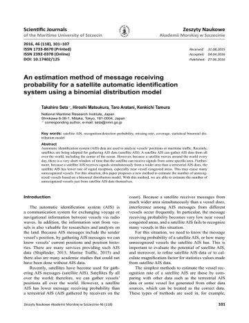 Scientific Journals of the Maritime University of Szczecin Zeszyty Naukowe Akademii Morskiej w Szczecinie 2016, 46 (118), 101–107 ISSN 1733-8670 (Printed) ISSN 2392-0378 (Online) DOI: 10.17402/125 Received: 31.08.2015 Accepted: 04.04.2016 Published: 27.06.2016 An estimation method of message receiving probability for a satellite automatic identification system using a binomial distribution model Takahiro Seta, Hiroshi Matsukura, Taro Aratani, Kenkichi Tamura National Maritime Research Institute, Japan Shinkawa 6-38-1, Mitaka, Tokyo, 181-0004, Japan corresponding author, e-mail: [email protected] Key words: satellite AIS, recognition/detection probability, missing rate, coverage, statistical binomial distribution model Abstract Automatic identification system (AIS) data are used to analyze vessels’ positions or maritime traffic. Recently, satellites are being adopted for gathering AIS data (satellite AIS). A satellite AIS can gather AIS data from all over the world, including the center of the ocean. However, because a satellite moves around the world every day, there is a very short window of time that the satellite can receive signals from some specific area. Furthermore, because a satellite AIS receives signals simultaneously from a wider area than a terrestrial AIS does, the satellite AIS has lower rate of signal reception, especially near vessel congested areas. This may cause many unrecognized vessels. For this situation, this paper proposes a new method to estimate the number of unrecognized vessels based on a binomial distribution model. With this method, we are able to estimate the number of unrecognized vessels just from satellite AIS data themselves. Introduction The automatic identification system (AIS) is a communication system for exchanging voyage or navigational information between vessels via radio waves. In addition, the information sent from vessels is also valuable for researchers and analysts on the land. Because AIS messages include the sender vessel’s position, by gathering AIS messages we can know vessels’ current positions and position histories. There are many services providing such AIS data (Shipfinder, 2013; Marine Traffic, 2015) and there also are many academic studies that could not have been done without AIS data. Recently, satellites have become used for gathering AIS messages (satellite AIS). Satellites fly all over the world; therefore, we can gather vessels’ positions all over the world. However, a satellite AIS has lower message receiving probability than a terrestrial AIS (AIS gathered by receivers on the Zeszyty Naukowe Akademii Morskiej w Szczecinie 46 (118) coast). Because a satellite receives messages from much wider area simultaneously than a vessel does, interference among AIS messages from different vessels occur frequently. In particular, the message receiving probability becomes very low near vessel congested areas, and a satellite AIS fails to recognize many vessels in this situation. For this situation, we need to know the message receiving probability of a satellite AIS, or how many unrecognized vessels the satellite AIS has. This is important to evaluate the potential of satellite AIS, and moreover, to refine satellite AIS data or to calculate magnification factor for statistics values made from satellite AIS data. The simplest methods to estimate the vessel recognition rate of a satellite AIS are those by comparing with other data such as the terrestrial AIS data or some vessel list generated from other data sources, which can be treated as the correct data. These types of methods are used in, for example, 101 Takahiro Seta, Hiroshi Matsukura, Taro Aratani, Kenkichi Tamura ExactEarth (2011), Larsen et al. (2012). However, such methods can only estimate the vessel recognition rate for areas where we can gather vessel information in other ways than satellite AIS. Hence these methods are useful only for evaluating satellite AIS’s potential, not for refining satellite AIS data. If we want to know information about areas where we can gather vessel position data only from satellite AIS, we need to develop some other method which does not use vessel data other than those from the satellite AIS. There are also methods which can estimate vessel recognition rate of a terrestrial AIS only from the gathered data themselves (Lapinski & Isenor, 2011; Hammond & Peters, 2012), however, those methods are designed for a terrestrial AIS because they implicitly assume a high message receiving probability or a long time span of gathering AIS data in the same area, both of which a satellite AIS does not have. There are also theoretical analyses of vessel detection probability for satellite AIS (Høye et al., 2008; Tunaley, 2011; Chen, 2014), however, these analyses are just theoretical models and do not appear to calculate the vessel detection probability from AIS data gathered in the real environment. In this paper, we focus on the distribution of the counts of messages from individual vessels received in one satellite pass-over (Figure 1) and propose a new estimation method of message receiving probability for satellite AIS which is based on a binomial distribution model. This method is only applicable for satellite AIS data. Problem The main purpose of this paper is to develop an estimation method for message receiving probability or vessel detection probability for a satellite AIS which is applicable only using the gathered satellite AIS data themselves. The data we target to estimate these probabilities are the log of the raw AIS messages received by the satellite with timestamps. The characteristics of a satellite AIS are as follows (Japan Aerospace Exploration Agency, 2015): • Moves all over the world and gathers AIS data from all over the world. • About 7000 m/s velocity and only 10~15 minutes to pass near one single vessel. • About 1000 km elevation above the sea surface. • About 1000 km radius footprint (sight). Because of these 