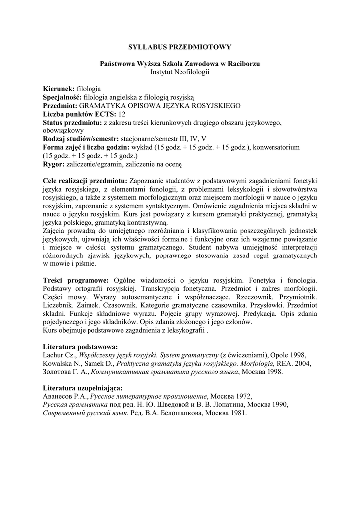SYLLABUS PRZEDMIOTOWY Państwowa WyŜsza Szkoła Zawodowa w Raciborzu Instytut Neofilologii Kierunek: filologia Specjalność: filologia angielska z filologią rosyjską Przedmiot: GRAMATYKA OPISOWA JĘZYKA ROSYJSKIEGO Liczba punktów ECTS: 12 Status przedmiotu: z zakresu treści kierunkowych drugiego obszaru językowego, obowiązkowy Rodzaj studiów/semestr: stacjonarne/semestr III, IV, V Forma zajęć i liczba godzin: wykład (15 godz. + 15 godz. + 15 godz.), konwersatorium (15 godz. + 15 godz. + 15 godz.) Rygor: zaliczenie/egzamin, zaliczenie na ocenę Cele realizacji przedmiotu: Zapoznanie studentów z podstawowymi zagadnieniami fonetyki języka rosyjskiego, z elementami fonologii, z problemami leksykologii i słowotwórstwa rosyjskiego, a takŜe z systemem morfologicznym oraz miejscem morfologii w nauce o języku rosyjskim, zapoznanie z systemem syntaktycznym. Omówienie zagadnienia miejsca składni w nauce o języku rosyjskim. Kurs jest powiązany z kursem gramatyki praktycznej, gramatyką języka polskiego, gramatyką kontrastywną. Zajęcia prowadzą do umiejętnego rozróŜniania i klasyfikowania poszczególnych jednostek językowych, ujawniają ich właściwości formalne i funkcyjne oraz ich wzajemne powiązanie i miejsce w całości systemu gramatycznego. Student nabywa umiejętność interpretacji róŜnorodnych zjawisk językowych, poprawnego stosowania zasad reguł gramatycznych w mowie i piśmie. Treści programowe: Ogólne wiadomości o języku rosyjskim. Fonetyka i fonologia. Podstawy ortografii rosyjskiej. Transkrypcja fonetyczna. Przedmiot i zakres morfologii. Części mowy. Wyrazy autosemantyczne i współznaczące. Rzeczownik. Przymiotnik. Liczebnik. Zaimek. Czasownik. Kategorie gramatyczne czasownika. Przysłówki. Przedmiot składni. Funkcje składniowe wyrazu. Pojęcie grupy wyrazowej. Predykacja. Opis zdania pojedynczego i jego składników. Opis zdania złoŜonego i jego członów. Kurs obejmuje podstawowe zagadnienia z leksykografii . Literatura podstawowa: Lachur Cz., Współczesny język rosyjski. System gramatyczny (z ćwiczeniami), Opole 1998, Kowalska N., Samek D., Praktyczna gramatyka języka rosyjskiego. Morfologia, REA. 2004, Золотова Г. А., Коммуникативная грамматика русского языка, Москва 1998. Literatura uzupełniająca: Аванесов Р.А., Русское литературное произношение, Москва 1972, Русская грамматика под ред. Н. Ю. Шведовой и В. В. Лопатина, Москва 1990, Современный русский язык. Ред. В.А. Белошапкова, Москва 1981.