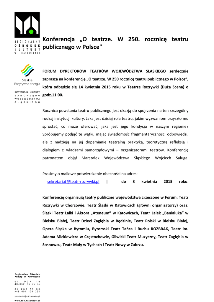 Konferencja „O teatrze. W 250. rocznicę teatru publicznego w Polsce" FORUM DYREKTORÓW TEATRÓW WOJEWÓDZTWA ŚLĄSKIEGO serdecznie zaprasza na konferencję „O teatrze. W 250 rocznicę teatru publicznego w Polsce”, która odbędzie się 14 kwietnia 2015 roku w Teatrze Rozrywki (Duża Scena) o godz.11:00. Rocznica powstania teatru publicznego jest okazją do spojrzenia na ten szczególny rodzaj instytucji kultury. Jaka jest dzisiaj rola teatru, jakim wyzwaniom przyszło mu sprostać, co może oferować, jaka jest jego kondycja w naszym regionie? Spróbujemy podjąć te wątki, mając świadomość fragmentaryczności odpowiedzi, ale z nadzieją na jej dopełnianie teatralną praktyką, teoretyczną refleksją i dialogiem z władzami samorządowymi – organizatorami teatrów. Konferencję patronatem objął Marszałek Województwa Śląskiego Wojciech Saługa. Prosimy o mailowe potwierdzenie obecności na adres: [email protected] | do 3 kwietnia 2015 roku. Konferencję organizują teatry publiczne województwa zrzeszone w Forum: Teatr Rozrywki w Chorzowie, Teatr Śląski w Katowicach (główni organizatorzy) oraz: Śląski Teatr Lalki i Aktora „Ateneum” w Katowicach, Teatr Lalek „Banialuka” w Bielsku Białej, Teatr Dzieci Zagłębia w Będzinie, Teatr Polski w Bielsku Białej, Opera Śląska w Bytomiu, Bytomski Teatr Tańca i Ruchu ROZBRAK, Teatr im. Adama Mickiewicza w Częstochowie, Gliwicki Teatr Muzyczny, Teatr Zagłębia w Sosnowcu, Teatr Mały w Tychach i Teatr Nowy w Zabrzu.