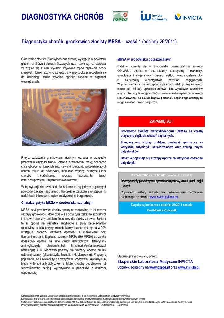 DIAGNOSTYKA CHORÓB Diagnostyka chorób: gronkowiec złocisty MRSA – część 1 (odcinek 26/2011) Gronkowiec złocisty (Staphylococcus aureus) występuje w powietrzu, glebie, na skórze i błonach śluzowych ludzi i zwierząt, co oznacza, Ŝe często się z nim stykamy. Wywołuje ropne zapalenie skóry, śluzówek, tkanki łącznej oraz kości, a w przypadku przedostania się do krwiobiegu moŜe wywołać ogniska zapalne w organach wewnętrznych. MRSA w środowisku pozaszpitalnym Ostatnio pojawiły się w środowisku pozaszpitalnym szczepy CO-MRSA, oporne na beta-laktamy, tetracyklinę i makrolidy, wywołujące infekcje skóry i tkanek miękkich oraz zapalenie płuc z bakteremią w następstwie powikłań pogrypowych. W przeciwieństwie do szczepów szpitalnych, atakują zwykle osoby młode (ok. 15 lat), uprzednio zdrowe, bez wyraźnych czynników ryzyka. Szczepy te mogą zostać przeniesione do szpitali przez osoby skolonizowane i na skutek błędów personelu szpitalnego szczepy te mogą zakaŜać innych pacjentów. . ZAPAMIĘTAJ ! Gronkowce złociste metycylinooporne (MRSA) są częstą przyczyną cięŜkich zakaŜeń szpitalnych. Stanowią one istotny problem, poniewaŜ oporne są na wszystkie antybiotyki beta-laktamowe oraz szereg innych antybiotyków. Ryzyko zakaŜenia gronkowcem złocistym wzrasta w przypadku przerwania ciągłości tkanek (otarcia, skaleczenia, rany), obecności ciała obcego w tkankach (np. cewniki, protezy), współistniejących chorób, takich jak nowotwory, marskość wątroby, cukrzyca i inne choroby metaboliczne, podczas stosowania terapii immunosupresyjnej lub przeciwnowotworowej. W tej sytuacji nie dziwi fakt, Ŝe bakterie te są jednym z głównych powodów zakaŜeń szpitalnych. Najczęściej zakaŜenia występują na oddziałach: intensywnej opieki medycznej, chirurgicznych. Charakterystyka MRSA w środowisku szpitalnym MRSA, czyli gronkowiec złocisty oporny na metycylinę, to lekooporne szczepy gronkowca, które często są przyczyną zakaŜeń szpitalnych i stanowią powaŜny problem finansowy dla słuŜby zdrowia. Bakterie te są oporne na wszystkie antybiotyki z grupy beta-laktamów (penicyliny, cefalosporyny, monobaktamy i karbapenemy), a w 90% występuje ponadto krzyŜowa oporność z makrolidami oraz fluorochinolonami. Szpitalne szczepy MRSA (HA-MRSA) są zwykle dodatkowo oporne na inne grupy antybiotyków: tetracykliny, aminoglikozydy, chloramfenikol, trimetoprim/sulfametoksazol, rifampicynę i in. Niedawno pojawiły się szczepy oporne na leki ostatniej szansy (glikopeptydy, linezolid i daptomycynę). Przyczyną pojawiania się i selekcji tych szczepów w środowisku szpitalnym są błędy w terapii antybiotykowej, a takŜe choroby podstawowe lub skomplikowane zabiegi wykonywane u pacjentów z obniŜoną odpornością. Ostatnio pojawiają się szczepy oporne na wszystkie dostępne antybiotyki. PYTANIE KONKURSOWE (do artykułu 25/2011) Dlaczego naleŜy pobrać wymaz z przedsionka pochwy, a nie z kanału szyjki macicy? Odpowiedzi naleŜy udzielić za pośrednictwem formularza dostępnego na stronie: www.invicta.pl/konkurs. Zwycięzcą konkursu z odcinka 24/2011 została Pani Monika Kończalik Materiał przygotowany przez: Eksperckie Laboratoria Medyczne INVICTA Odcinek dostępny na www.pzpoz.pl oraz www.invicta.pl Opracowanie: mgr Izabella Lipniewicz, specjalista mikrobiolog, Z-ca Kierownika Laboratoriów Medycznych Invicta. Konsultacja: mgr BoŜena Maj, diagnosta laboratoryjny, specjalista analityki klinicznej, Kierownik Laboratoriów Medycznych Invicta Materiał przygotowany na podstawie: Rekomendacji KORLD doboru testów do oznaczania wraŜliwości bakterii na antybiotyki i chemioterapeutyki 2010. D. śabicka, W. Hryniewicz Praktyczne zasady kontroli zakaŜeń szpitalnych. W. Staszkiewicz, W. Hryniewicz, P. Grzesiowski, T. Ozorowski