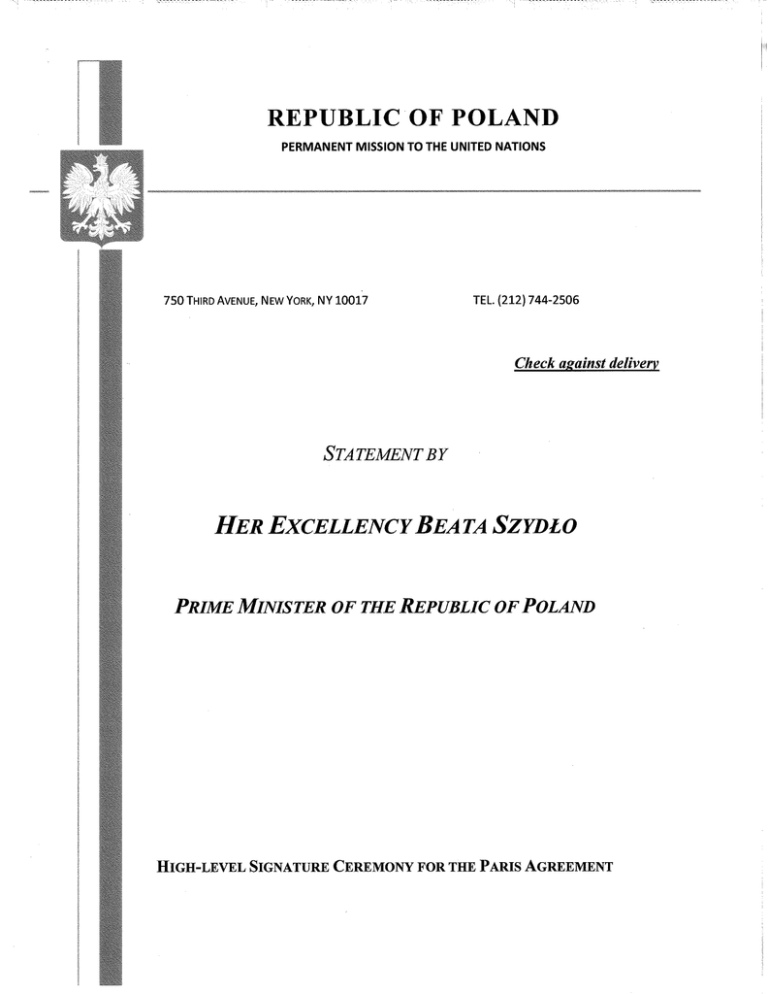 REPUBLIC OF POLAND PERMANENT MISSION TO THE UNITED NATIONS 750 THIRD AVENUE, NEW YORK, NY 10017 TEL. (212) 744-2506 Check against deliver;, STATEMENT B Y HER EXCELLENCY BEA TA SZYDLO PRIME MINISTER OF THE REPUBLIC OF POLAND HIGH-LEVEL SIGNATURE CEREMONY FOR THE PARIS AGREEMENT Mr. President, Ladies and Gentlemen, I am very happy to see here today so many fellow leaders commemorating the signing of this agreement. It was not so long ago that we all gathered in Paris to unite our efforts and orchestrate solutions that could stand a chance against one of the greatest threats facing mankind today climate change. Today, here in New York, we once again have the opportunity to voice our political and social will and continue to work towards climate neutrality and sustainable development. The foundations laid down in Paris are solid and cohesive, but the real work begins now - every party to the Agreement has before it a call to fulfill their pledged obligations and begin implementing them on a national level. The European Union and its member states are preparing for the ratification and implementation of the Paris Agreement, according to its provisions. It has been important to us to be fully party to the Agreement from its conception; however, we must be cognizant of the fact that the European Union is responsible for little more than 10% of global emissions. Effectively halting climate change is thus contingent on all parties to the Agreement undertaking their respective responsibilities. Now, as in Paris, Poland pledges its commitment to the Agreement provided that it will have truly global character, and will include, in particular, commitments of the world's largest economies. Parties that have committed to climate change reduction targets subject to external support, having received that support - including that from the European Union - must both fulfill these commitments and strengthen any adaptive measures serving as preconditions for sustainable development. Ladies and Gentlemen, The effective implementation of the Paris Agreement is a challenge to all countries. In Poland, we are familiar with how difficult it is to simultaneously reduce emissions while maintaining economic growth. The Paris Agreement nevertheless gives each country the opportunity to decide for itself the best possible legislation and technology that correspond to the criteria of environmental effectiveness and economic policy. The European Union, as the entire world, is not homogenous. Our economies, as well as the energy systems that serve as the foundations thereof, require the coordination of innovative solutions in order to facilitate the ambitious goals set out by the Agenda 2030. I am certain that the legislative work being done in this regard will soon be finalized and implemented. Poland is a strong advocate of effective and practical solutions. We are particularly pleased with the role given to carbon sinks and greenhouse gas repositories, forests included, as neutralizing factors in the global greenhouse gas account. Adequately utilizing natural resources such as forests can have a great effect in offsetting climate change. Poland is committed to support initiatives in this regard. We are also pleased that the Agreement affords an opportunity for the coordination and cooperation of innovative market instruments, as well as their standardization on a global scale. Together with the European Union, we have had years of experience in designing such instruments, the applications of which are increasingly relevant today. Ladies and Gentlemen, With the implementation of the Paris Agreement, I once again call for solidarity with those countries most affected by the negative impacts of climate change. In this context, we sincerely hope that the Green Climate Fund will be able to effectively utilize the financial resources allocated to climate aid. To conclude, we see a great deal of benefit in augmenting the level of synergy among all conventions directed at sustainable development and thus, by protecting the climate also contributing to poverty eradication and enhancing food security for all. I thank you.