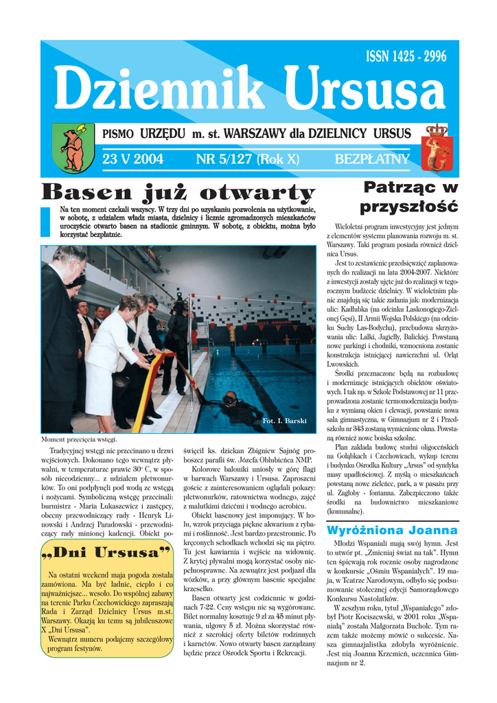 ISSN 1425 - 2996 Dziennik Ursusa PISMO URZĘDU m. st. WARSZAWY dla DZIELNICY URSUS 23 V 2004 NR 5/127 (Rok X) Basen już otwarty Na ten moment czekali wszyscy. W trzy dni po uzyskaniu pozwolenia na użytkowanie, w sobotę, z udziałem władz miasta, dzielnicy i licznie zgromadzonych mieszkańców uroczyście otwarto basen na stadionie gminnym. W sobotę, z obiektu, można było korzystać bezpłatnie. Fot. I. Barski Moment przecięcia wstęgi. Tradycyjnej wstęgi nie przecinano u drzwi wejściowych. Dokonano tego wewnątrz pływalni, w temperaturze prawie 30o C, w sposób niecodzienny... z udziałem płetwonurków. To oni podpłynęli pod wodą ze wstęgą i nożycami. Symboliczną wstęgę przecinali: burmistrz - Maria Łukaszewicz i zastępcy, obecny przewodniczący rady - Henryk Linowski i Andrzej Paradowski - przewodniczący rady minionej kadencji. Obiekt po- „Dni Ursusa” Na ostatni weekend maja pogoda została zamówiona. Ma być ładnie, ciepło i co najważniejsze... wesoło. Do wspólnej zabawy na terenie Parku Czechowickiego zapraszają Rada i Zarząd Dzielnicy Ursus m.st. Warszawy. Okazją ku temu są jubileuszowe X „Dni Ursusa”. Wewnątrz numeru podajemy szczegółowy program festynów. święcił ks. dziekan Zbigniew Sajnóg proboszcz parafii św. Józefa Oblubieńca NMP. Kolorowe baloniki uniosły w górę flagi w barwach Warszawy i Ursusa. Zaproszeni goście z zainteresowaniem oglądali pokazy: płetwonurków, ratownictwa wodnego, zajęć z malutkimi dziećmi i wodnego aerobicu. Obiekt basenowy jest imponujący. W holu, wzrok przyciąga piękne akwarium z rybami i roślinność. Jest bardzo przestronnie. Po kręconych schodkach wchodzi się na piętro. Tu jest kawiarnia i wejście na widownię. Z krytej pływalni mogą korzystać osoby niepełnosprawne. Na zewnątrz jest podjazd dla wózków, a przy głównym basenie specjalne krzesełko. Basen otwarty jest codziennie w godzinach 7-22. Ceny wstępu nie są wygórowane. Bilet normalny kosztuje 9 zł za 45 minut pływania, ulgowy 5 zł. Można skorzystać również z szerokiej oferty biletów rodzinnych i karnetów. Nowo otwarty basen zarządzany będzie przez Ośrodek Sportu i Rekreacji. BEZPŁATNY Patrz¹c w przysz³oœæ Wieloletni program inwestycyjny jest jednym z elementów systemu planowania rozwoju m. st. Warszawy. Taki program posiada również dzielnica Ursus. Jest to zestawienie przedsięwzięć zaplanowanych do realizacji na lata 2004-2007. Niektóre z inwestycji zostały ujęte już do realizacji w tegorocznym budżecie dzielnicy. W wieloletnim planie znajdują się takie zadania jak: modernizacja ulic: Kadłubka (na odcinku Laskonogiego-Zielonej Gęsi), II Armii Wojska Polskiego (na odcinku Suchy Las-Bodycha), przebudowa skrzyżowania ulic: Lalki, Jagiełły, Balickiej. Powstaną nowe parkingi i chodniki, wzmocniona zostanie konstrukcja istniejącej nawierzchni ul. Orląt Lwowskich. Środki przeznaczone będą na rozbudowę i modernizacje istniejących obiektów oświatowych. I tak np. w Szkole Podstawowej nr 11 przeprowadzona zostanie termomodernizacja budynku z wymianą okien i elewacji, powstanie nowa sala gimnastyczna, w Gimnazjum nr 2 i Przedszkolu nr 343 zostaną wymienione okna. Powstaną również nowe boiska szkolne. Plan zakłada budowę studni oligoceńskich na Gołąbkach i Czechowicach, wykup terenu i budynku Ośrodka Kultury „Arsus” od syndyka masy upadłościowej. Z myślą o mieszkańcach powstaną nowe zieleńce, park, a w pasażu przy ul. Zagłoby - fontanna. Zabezpieczono także środki na budownictwo mieszkaniowe (komunalne). Wyró¿niona Joanna Młodzi Wspaniali mają swój hymn. Jest to utwór pt. „Zmieniaj świat na tak”. Hymn ten śpiewają rok rocznie osoby nagrodzone w konkursie „Ośmiu Wspaniałych”. 19 maja, w Teatrze Narodowym, odbyło się podsumowanie stołecznej edycji Samorządowego Konkursu Nastolatków. W zeszłym roku, tytuł „Wspaniałego” zdobył Piotr Kociszewski, w 2001 roku „Wspaniałą” została Małgorzata Bucholc. Tym razem także możemy mówić o sukcesie. Nasza gimnazjalistka zdobyła wyróżnienie. Jest nią Joanna Krzemień, uczennica Gimnazjum nr 2. II Dziennik Spo³eczny Komitet Budowy Basenu koñczy dzia³alnoœæ Z chwilą oddania do użytkowania basenu na stadionie gminnym, Społeczny Komitet Budowy Basenu zaakończył swoją działalność. Społeczny Komitet Budowy Basenu rozpoczął działalność w 1996 r. Przewodniczącym komitetu był ś. p. Romuald Okrasa. Niestety, nie doczekał chwili oddania do użytkowania basenu, śmierć przerwała działalność Romana między innymi na rzecz S. K. B. B. Komitet w okresie swojego funkcjonowania prowadził wiele akcji, których celem była zbiórka funduszy i promocja przedsięwzięcia. Pieniądze zgromadzone na rachunku bankowym pochodzą ze sprzedaży cegiełek i wpłat sponsorów. Przez te lata, udało się zebrać 44.822 zł (w tym 2.125,85 stanowią cegiełki). Dziękuję wszystkim, którzy przyczynili się do zgromadzenia tej kwoty. Ponieważ basen został wybudowany i wyposażony ze środków Gminy Warszawa Ursus i m. st. Warszawy, decyzją członków komitetu w/w kwotę wydatkowano w następujący spo- sób: 23.330 zł przeznaczono na wykonanie akwarium o wymianach 3x0,60x0,65 m (usytuowane w holu basenu), 6.924 zł to wartość umowy podpisanej na serwisowanie akwarium przez okres jednego roku. Zakupiono zieleń, w kwocie 3.400 zł - stanowi ona wystrój holu basenu. Wykonano również tablicę pamiątkową w cenie 1.700 zł. Pozostałe środki przeznaczone będą na zakup ponad 100 karnetów, które otrzyma Ośrodek Pomocy Społecznej. Karnety przekazane zostaną dzieciom z biednych rodzin i dzieciom niepełnosprawnym. Komitet Budowy Basenu osiągnął założony cel i dziś kończy działalność. Dziękuję jego członkom za udział i wsparcie. Wiesław Krzemień z-ca Przewodniczącego Społecznego Komitetu Budowy Basenu Niezapominajki w „14” Sprostowanie W numerze 3/12