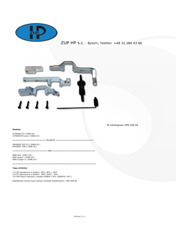 ZUP HP s.c. - Bytom, Telefon: +48 32 280 43 66 Nr katalogowy: 905 450 00 Modele: CITROEN C4 ( 2008-10 ) CITROEN Picasso ( 2008-10 ) ===================== PEUGEOT ======================== PEUGEOT 207 CC ( 2006-10 ) PEUGEOT 308 ( 2006-10 ) ====================== MINI =========================== MINI One (2007-10 ) MIN Cooper ( 2006-10 ) MINI Cooper S ( 2006-10 ) ===================================================== Typy silników: 1.4 VTi Valvetronic o kodach: EP3 ( 8FS ) ; N12 1.6 VTi Valvetronic o kodach: EP6 ( 5FW ) ; N14 1.6 THP Direct Injection o kodach EP6DT ( 5FX ) EP6DTS ( 5FY ) Dodatkowo można kupić zestaw narzędzi dodatkowych : 903 468 00 Strona 1 z 1