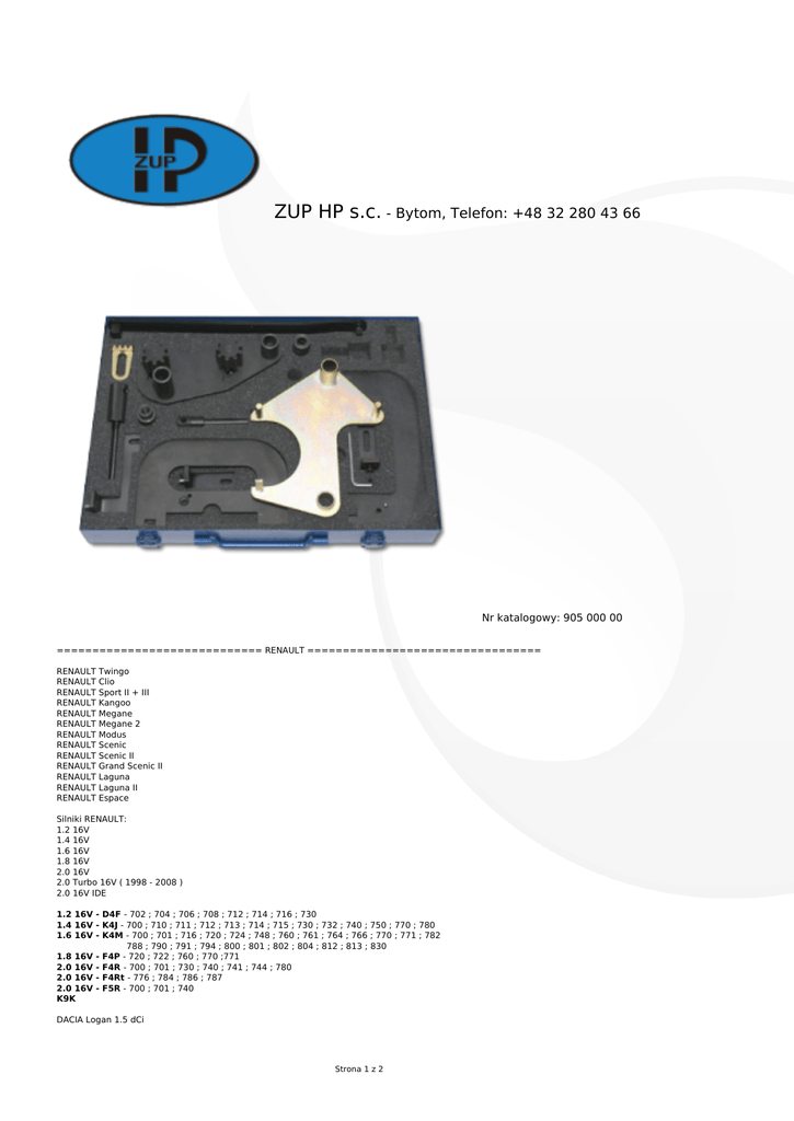 ZUP HP s.c. - Bytom, Telefon: +48 32 280 43 66 Nr katalogowy: 905 000 00 ============================= RENAULT ================================= RENAULT RENAULT RENAULT RENAULT RENAULT RENAULT RENAULT RENAULT RENAULT RENAULT RENAULT RENAULT RENAULT Twingo Clio Sport II + III Kangoo Megane Megane 2 Modus Scenic Scenic II Grand Scenic II Laguna Laguna II Espace Silniki RENAULT: 1.2 16V 1.4 16V 1.6 16V 1.8 16V 2.0 16V 2.0 Turbo 16V ( 1998 - 2008 ) 2.0 16V IDE 1.2 16V - D4F - 702 ; 704 ; 706 ; 708 ; 712 ; 714 ; 716 ; 730 1.4 16V - K4J - 700 ; 710 ; 711 ; 712 ; 713 ; 714 ; 715 ; 730 ; 732 ; 740 ; 750 ; 770 ; 780 1.6 16V - K4M - 700 ; 701 ; 716 ; 720 ; 724 ; 748 ; 760 ; 761 ; 764 ; 766 ; 770 ; 771 ; 782 788 ; 790 ; 791 ; 794 ; 800 ; 801 ; 802 ; 804 ; 812 ; 813 ; 830 1.8 16V - F4P - 720 ; 722 ; 760 ; 770 ;771 2.0 16V - F4R - 700 ; 701 ; 730 ; 740 ; 741 ; 744 ; 780 2.0 16V - F4Rt - 776 ; 784 ; 786 ; 787 2.0 16V - F5R - 700 ; 701 ; 740 K9K DACIA Logan 1.5 dCi Strona 1 z 2 ============================= NISSAN ================================= NISSAN Micra 1.5 dCi Kubistar 1.6 16V ( 2003 - 2008 ) Silniki NISSAN o kodach: K9K ; K4M ============================= OPEL =================================== OPEL Vivaro 2.0 16v ( 2001 - 2008 ) Silniki OPEL o kodzie: FR4 720 ====================================================================== Zestaw ten zawiera w sobie zestawy i narzędzia o numerach: 905 100 00 905 110 00 905 120 00 905 130 00 905 140 00 905 150 00 Strona 2 z 2