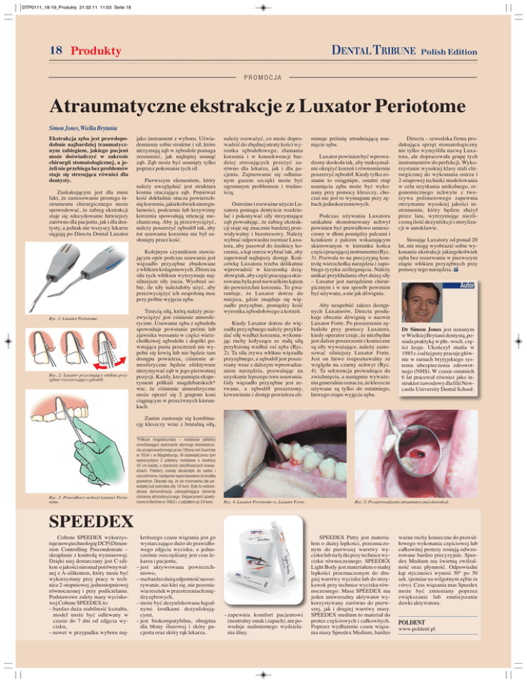 DTP0111_18-19_Produkty 21.02.11 11:03 Seite 18 DENTAL TRIBUNE 18 Produkty Polish Edition PROMOCJA Atraumatyczne ekstrakcje z Luxator Periotome Simon Jones, Wielka Brytania Ekstrakcja zęba jest prawdopodobnie najbardziej traumatycznym zabiegiem, jakiego pacjent może doświadczyć w zakresie chirurgii stomatologicznej, a jeżeli nie przebiega bez problemów staje się stresująca również dla dentysty. Zaskakującym jest dla mnie fakt, że zastosowanie prostego instrumentu chirurgicznego może spowodować, że zabieg ekstrakcji staje się zdecydowanie łatwiejszy zarówno dla pacjenta, jak i dla dentysty, a jednak nie wszyscy lekarze sięgają po Directa Dental Luxator jako instrument z wyboru. Uświadomienie sobie struktur i sił, które utrzymują ząb w zębodole pomaga zrozumieć, jak najlepiej usunąć ząb. Ząb może być usunięty tylko poprzez pokonanie tych sił. Pierwszym elementem, który należy uwzględnić jest struktura kostna otaczająca ząb. Ponieważ kość dokładnie otacza powierzchnię korzenia, jakiekolwiek nieregularności, podcienie lub krzywizny korzenia spowodują retencję mechaniczną. Aby ją przezwyciężyć, należy poszerzyć zębodół tak, aby tor usuwania korzenia nie był zasłonięty przez kość. Kolejnym czynnikiem stawiającym opór podczas usuwania jest więzadło przyzębne zbudowane z włókien kolagenowych. Zbiorcza siła tych włókien wytrzymuje najsilniejsze siły żucia. Wyobraź sobie, ile siły należałoby użyć, aby przezwyciężyć ich zespoloną moc przy próbie wyjęcia zęba. Ryc. 1: Luxator Periotome. Ryc. 2: Luxator przecinający włókna przyzębne i rozszerzający zębodół. Trzecią siłą, którą należy przezwyciężyć jest ciśnienie atmosferyczne. Usuwanie zęba z zębodołu spowoduje powstanie próżni lub zjawiska wessania w części wierzchołkowej zębodołu i dopóki powstająca pusta przestrzeń nie wypełni się krwią lub nie będzie tam dostępu powietrza, ciśnienie atmosferyczne będzie efektywnie utrzymywać ząb w jego pierwotnej pozycji. Każdy, kto pamięta eksperyment półkuli magdeburskich* wie, że ciśnienie atmosferyczne może oprzeć się 2 grupom koni ciągnącym w przeciwnych kierunkach. należy rozważyć, co może doprowadzić do zbędnej utraty kości wyrostka zębodołowego, złamania korzenia i w konsekwencji bardziej stresujących przeżyć zarówno dla lekarza, jak i dla pacjenta. Zajmowanie się odłamanym guzem szczęki może być ogromnym problemem i trudnością. Ostrożne i rozważne użycie Luxatora pomaga dentyście rozdzielać i pokonywać siły utrzymujące ząb powodując, że zabieg ekstrakcji staje się znacznie bardziej przewidywalny i bezstresowy. Należy wybrać odpowiedni rozmiar Luxatora, aby pasował do średnicy korzenia, a kąt ostrza wybrać tak, aby zapewniał najlepszy dostęp. Końcówkę Luxatora trzeba delikatnie wprowadzić w kieszonkę dziąsłową tak, aby część pracująca skierowana była pod niewielkim kątem do powierzchni korzenia. To gwarantuje, że Luxator dotrze do miejsca, gdzie znajduje się więzadło przyzębne, pomiędzy kość wyrostka zębodołowego a korzeń. Kiedy Luxator dotrze do więzadła przyzębnego należy przykładać siłę wzdłuż korzenia, wykonując ruchy kołyszące ze stałą siłą przyłożoną wzdłuż osi zęba (Ryc. 2). Ta siła zrywa włókna więzadła przyzębnego, a zębodół jest poszerzany wraz z dalszym wprowadzaniem narzędzia, pozwalając na uzyskanie lepszego toru usuwania. Gdy więzadło przyzębne jest zerwane, a zębodół poszerzony, krwawienie i dostęp powietrza eli- minuje próżnię utrudniającą usunięcie zęba. Luxator powinien być wprowadzony dookoła tak, aby maksymalnie okrążyć korzeń i równomiernie poszerzyć zębodół. Kiedy tylko zostanie to osiągnięte, ostatni etap usunięcia zęba może być wykonany przy pomocy kleszczy, chociaż nie jest to wymagane przy zębach jednokorzeniowych. Podczas używania Luxatora unikalnie skonstruowany uchwyt powinien być prawidłowo umieszczony w dłoni pomiędzy palcami i kciukiem z palcem wskazującym skierowanym w kierunku końca części pracującej instrumentu (Ryc. 3). Pozwala to na precyzyjną kontrolę wierzchołka narzędzia i zapobiega ryzyku ześlizgnięcia. Należy unikać przykładania zbyt dużej siły – Luxator jest narzędziem chirurgicznym i w ten sposób powinien być używany, a nie jak dźwignia. Aby uzupełnić zakres dostępnych Luxatorów, Directa produkuje obecnie dźwignię o nazwie Luxator Forte. Po poszerzeniu zębodołu przy pomocy Luxatora, kiedy operator czuje, że niezbędne jest dalsze poszerzenie i konieczne są siły wyważające, należy zastosować silniejszy Luxator Forte. Jest on łatwo rozpoznawalny ze względu na czarny uchwyt (Ryc. 4). Ta sekwencja prowadząca do zwichnięcia, a następnie wyważenia generalnie oznacza, że kleszcze używane są tylko do ostatniego, łatwego etapu wyjęcia zęba. Directa – szwedzka firma produkująca sprzęt stomatologiczny nie tylko wymyśliła nazwę Luxatora, ale dopracowała grupę tych instrumentów do perfekcji. Wykorzystanie wysokiej klasy stali chirurgicznej do wykonania ostrza i 2-etapowej techniki modelowania w celu uzyskania unikalnego, ergonomicznego uchwytu z tworzywa polimerowego zapewnia otrzymanie wysokiej jakości instrumentu, który będzie służył przez lata, wytrzymując niezliczoną ilość dezynfekcji i sterylizacji w autoklawie. Stosując Luxatory od ponad 20 lat, nie mogę wyobrazić sobie wykonania ekstrakcji jakiegokolwiek zęba bez rozerwania w pierwszym etapie włókien przyzębnych przy pomocy tego narzędzia. DT Autor Dr Simon Jones jest uznanym w Wielkiej Brytanii dentystą, posiada praktykę w płn.-wsch. części kraju. Ukończył studia w 1985 r. i od tej pory pracuje głównie w ramach brytyjskiego systemu ubezpieczenia zdrowotnego (NHS). W czasie ostatnich 6 lat pracował również jako instruktor zawodowy dla filii Newcastle Univers