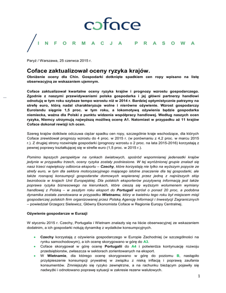 I N F O R M A C J A P R A S O W A Paryż / Warszawa, 25 czerwca 2015 r. Coface zaktualizował oceny ryzyka krajów. Obniżenie oceny dla Chin. Gospodarki dotknięte spadkiem cen ropy wpisano na listę obserwacyjną ze wskazaniem ujemnym. Coface zaktualizował kwartalne oceny ryzyka krajów i prognozy wzrostu gospodarczego. Zgodnie z naszymi przewidywaniami polska gospodarka i jej główni partnerzy handlowi odnotują w tym roku szybsze tempo wzrostu niż w 2014 r. Bardziej optymistycznie patrzymy na strefę euro, którą nadal charakteryzuje wolne i nierówne ożywienie. Wzrost gospodarczy Eurolandu sięgnie 1,5 proc. w tym roku, a lokomotywą ożywienia będzie gospodarka niemiecka, ważna dla Polski z punktu widzenia współpracy handlowej. Według naszych ocen ryzyka, Niemcy utrzymują najwyższą możliwą ocenę A1. Natomiast w przypadku aż 11 krajów Coface dokonał rewizji ich ocen. Szereg krajów dotkliwie odczuwa ciężar spadku cen ropy, szczególnie kraje wschodzące, dla których Coface zrewidował prognozy wzrostu do 4 proc. w 2015 r. (w porównaniu z 4,2 proc. w marcu 2015 r.). Z drugiej strony rozwinięte gospodarki (prognozy wzrostu o 2 proc. na lata 2015-2016) korzystają z pewnej poprawy kształtującej się w strefie euro (1,5 proc. w 2015 r.). Pomimo lepszych perspektyw na rynkach światowych, spośród wspomnianej jedenastki krajów jedynie w przypadku trzech, oceny ryzyka zostały podniesione. W tej wyróżnionej grupie znalazł się nasz trzeci największy odbiorca eksportu – Czechy, które korzystają nie tylko na wyższym popycie ze strefy euro, w tym dla sektora motoryzacyjnego mającego istotne znaczenie dla tej gospodarki, ale także rosnącej konsumpcji gospodarstw domowych wspieranej przez jedną z najniższych stóp bezrobocia w krajach Unii Europejskiej. Dla polskich eksporterów pozytywną informacją jest także poprawa ryzyka biznesowego na kierunkach, które cieszą się wyższym wolumenem wymiany handlowej z Polską – w zeszłym roku eksport do Portugali wzrósł o ponad 20 proc, a podobna dynamika została zanotowana w przypadku Wietnamu, który w kwietniu tego roku był miejscem misji gospodarczej polskich firm organizowanej przez Polską Agencję Informacji i Inwestycji Zagranicznych – powiedział Grzegorz Sielewicz, Główny Ekonomista Coface w Regionie Europy Centralnej. Ożywienie gospodarcze w Eurazji W styczniu 2015 r. Czechy, Portugalia i Wietnam znalazły się na liście obserwacyjnej ze wskazaniem dodatnim, a ich gospodarki notują dynamikę z wydatków konsumpcyjnych. Czechy korzystają z ożywienia gospodarczego w Europie Zachodniej (w szczególności na rynku samochodowym), a ich ocenę skorygowano w górę do A3. Coface skorygował w górę ocenę Portugalii do A4 i potwierdza kontynuację rozwoju przedsiębiorstw, zwłaszcza w sektorach zorientowanych na eksport. W Wietnamie, dla którego ocenę skorygowano w górę do poziomu B, nastąpiło przyśpieszenie konsumpcji prywatnej w związku z niską inflacją i poprawą zaufania konsumentów. Zmniejszyło się ryzyko zewnętrzne, a na rachunku bieżącym pojawiły się nadwyżki i odnotowano poprawę sytuacji w zakresie rezerw walutowych. 1 Kanada, Algieria i Gabon nadal zmagają się z konsekwencjami spadku cen ropy naftowej Kraje eksportujące produkty węglowodorowe boleśnie odczuwają konsekwencje uzależnienia od sektora naftowego: Kanada z oceną A1 znalazła się na liście obserwacyjnej ze wskazaniem ujemnym, w związku z wpływem spadku cen ropy naftowej na inwestycje, ryzykiem obciążającym sektor nieruchomości i ujemnym wzrostem w I kw. 2015 r. Algieria z oceną A4 znalazła się na liście obserwacyjnej ze wskazaniem ujemnym. Spadek cen ropy miał negatywny wpływ na rachunki publiczne i rachunki bieżące kraju. Jeśli ceny nie wzrosną, aktywność ekonomiczna w kraju utrzyma swój niski poziom. Ocena B dla Gabonu znalazła się na liście obserwacyjnej ze wskazaniem ujemnym. Prognozuje się spowolnienie aktywności gospodarczej do 4 proc. w 2015 r. (w porównaniu do średniej wartości 5,4 proc. w ostatnich latach). Tanzania odnotowuje szybki spadek kursu swojej waluty wobec dolara amerykańskiego. Deprecjacja szylinga budzi niepokój i może przynieść spółkom znaczące straty. Spowolnienie wzrostu zbiega się z pogłębieniem deficytu publicznego. Coface umieszcza kraj na liście obserwacyjnej ze wskazaniem ujemnym z oceną B. Gospodarka Madagaskaru odczuwa konsekwencje utrzymującej się niestabilności politycznej. Ocena C również została umieszczona na liście obserwacyjnej ze wskazaniem ujemnym. Zadłużenie przedsiębiorstw w gospodarce chińskiej stanowi powód do niepokoju Umieszczona w styczniu 2015 r. na liście obserwacyjnej ze wskazaniem ujemnym ocena Chin została skorygowana w dół do poziomu A4. W kraju wzrasta poziom długu prywatnego, do czego w pierwszym rzędzie przyczynia się sektor przedsiębiorstw. W 2014 r. wynosił on 207 proc. PKB, w porównaniu do 130 proc. w 2008 r. (według MFW). Poziom ten uznaje się za niepokojący i jest on znacznie wyższy niż wartości odnotowane w innych rozwijających się gospodarkach. W konsekwencji może dojść do zakłócenia wypłacalności spółek w sektorach wrażliwych. Branże cementu, produktów chemicznych i stali, które ponoszą wydatki na infrastrukturę, zostały osłabione przez nadwyżkę możliwości produkcyjnych. 2 ZAŁĄCZNIK OCENA PODWYŻSZONA, USUNIĘTA Z LISTY OBSERWACYJNEJ ZE WSKAZANIEM UJEMNYM LUB UMIESZCZONA NA LIŚCIE OBSERWACYJNEJ ZE WSKAZANIEM DODATNIM OCENA OBNIŻONA, USUNIĘTA Z LISTY OBSERWACYJNEJ ZE WSKAZANIEM DODATNIM LUB UMIESZCZONA NA LIŚCIE OBSERWACYJNEJ ZE WSKAZANIEM UJEMNYM KONTAKT DLA MEDIÓW: Anna A. GUZIK – T. +48 22 465 02 22, M. +48 509 467 531 – E. [email protected] Informacje o Coface Grupa Coface, światowy lider w obszarze ubezpieczeń należności, oferuje firmom na całym świecie rozwiązania w zakresie ochrony przed ryzykiem niewypłacalnoś
