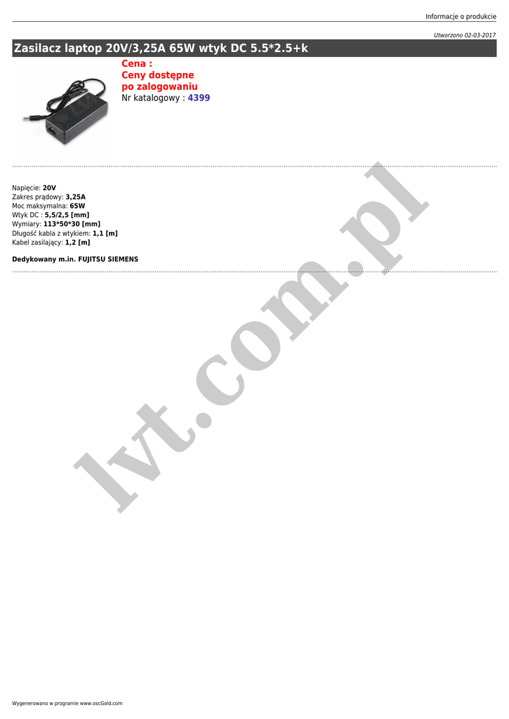 Informacje o produkcie Utworzono 02-03-2017 Zasilacz laptop 20V/3,25A 65W wtyk DC 5.5*2.5+k Cena : Ceny dostępne po zalogowaniu lv t. co Dedykowany m.in. FUJITSU SIEMENS m .p Napięcie: 20V Zakres prądowy: 3,25A Moc maksymalna: 65W Wtyk DC : 5,5/2,5 [mm] Wymiary: 113*50*30 [mm] Długość kabla z wtykiem: 1,1 [m] Kabel zasilający: 1,2 [m] l Nr katalogowy : 4399 Wygenerowano w programie www.oscGold.com