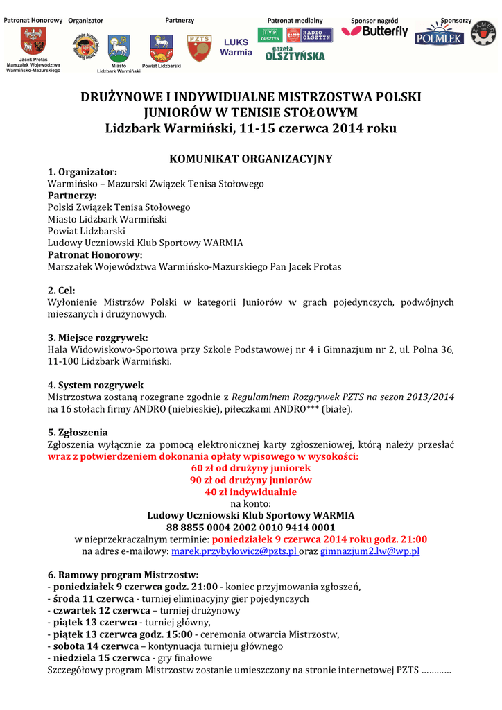 DRUŻYNOWE I INDYWIDUALNE MISTRZOSTWA POLSKI JUNIORÓW W TENISIE STOŁOWYM Lidzbark Warmiński, 11-15 czerwca 2014 roku KOMUNIKAT ORGANIZACYJNY 1. Organizator: Warmińsko – Mazurski Związek Tenisa Stołowego Partnerzy: Polski Związek Tenisa Stołowego Miasto Lidzbark Warmiński Powiat Lidzbarski Ludowy Uczniowski Klub Sportowy WARMIA Patronat Honorowy: Marszałek Województwa Warmińsko-Mazurskiego Pan Jacek Protas 2. Cel: Wyłonienie Mistrzów Polski w kategorii Juniorów w grach pojedynczych, podwójnych mieszanych i drużynowych. 3. Miejsce rozgrywek: Hala Widowiskowo-Sportowa przy Szkole Podstawowej nr 4 i Gimnazjum nr 2, ul. Polna 36, 11-100 Lidzbark Warmiński. 4. System rozgrywek Mistrzostwa zostaną rozegrane zgodnie z Regulaminem Rozgrywek PZTS na sezon 2013/2014 na 16 stołach firmy ANDRO (niebieskie), piłeczkami ANDRO*** (białe). 5. Zgłoszenia Zgłoszenia wyłącznie za pomocą elektronicznej karty zgłoszeniowej, którą należy przesłać wraz z potwierdzeniem dokonania opłaty wpisowego w wysokości: 60 zł od drużyny juniorek 90 zł od drużyny juniorów 40 zł indywidualnie na konto: Ludowy Uczniowski Klub Sportowy WARMIA 88 8855 0004 2002 0010 9414 0001 w nieprzekraczalnym terminie: poniedziałek 9 czerwca 2014 roku godz. 21:00 na adres e-mailowy: [email protected] oraz [email protected] 6. Ramowy program Mistrzostw: - poniedziałek 9 czerwca godz. 21:00 - koniec przyjmowania zgłoszeń, - środa 11 czerwca - turniej eliminacyjny gier pojedynczych - czwartek 12 czerwca – turniej drużynowy - piątek 13 czerwca - turniej główny, - piątek 13 czerwca godz. 15:00 - ceremonia otwarcia Mistrzostw, - sobota 14 czerwca – kontynuacja turnieju głównego - niedziela 15 czerwca - gry finałowe Szczegółowy program Mistrzostw zostanie umieszczony na stronie internetowej PZTS ………… 7. Biuro zawodów: Hala Widowiskowo-Sportowa przy Szkole Podstawowej nr 4 i Gimnazjum nr 2, ul. Polna 36, 11-100 Lidzbark Warmiński. 8. Zakwaterowanie i wyżywienie: HOTEL KRASICKI Plac Zamkowy 1/7 tel. +48 89 537 17 00, +48 89 537 17 01 [email protected] www.hotelkrasicki.pl Liczba miejsc noclegowych: 250 Pokoje wyposażone w łazienkę, Internet, tv hd, telefon, minibar. Do dyspozycji gości pokoje przyjazne osobom niepełnosprawnym oraz rodzinie. Restauracja, Roomservice, Centrum Wellness, biblioteka z czytelnią, sala klubowa z winiarnią, parking. W hotelu akceptowane są zwierzęta. HOTEL GÓRECKI ul. Olsztyńska 4 tel. +48 89 767 32 92 [email protected] www.hotelgorecki.pl Liczba miejsc noclegowych: 70 Pokoje wyposażone w łazienkę, TV, suszarki do włosów. W całym hotelu bezpłatny dostęp do Internetu. Do dyspozycji gości pokoje przyjazne rodzinom oraz sale: restauracyjna, konferencyjne i wielofunkcyjne. Restauracja, Chata Warmińska, plac zabaw, garaże, basen odkryty, boiska rekreacyjne, sauna fińska, wypożyczalnia rowerów, parking. W hotelu akceptowane są zwierzęta. HOTELIK KOPERNIK PRZY ZAMKU ul. Zielona 1 tel. +48 89 767 50 10 [email protected] www.kopernikhotel.pl Liczba miejsc noclegowych: 44 Pokoje wyposażone w łazienkę, Internet, tv, czajnik. Do dyspozycji gości pokoje przyjazne rodzinom, parking. W hotelu akceptowane są zwierzęta. HOTELIK PRZY BRAMIE ul. Konstytucji 3-go Maja 18 tel. +48 89 767 20 99 [email protected] www.hoteli24.pl Liczba miejsc noclegowych: 18 + 3 dostawki Pokoje wyposażone w łazienkę, Internet, tv. Do dyspozycji gości aneks kuchenny, sauna, możliwość skorzystania z usług kosmetycznych w salonie Eleonora. Bezpłatny garaż na motocykle i rowery oraz parking. W hotelu akceptowane są zwierzęta. HOTELIK WARMIA ul. Konstytucji 3-go Maja 22 tel. +48 89 767 02 10 kom. +48 723 714 920 [email protected] www.hotelikwarmia.pl Liczba miejsc noclegowych: ok. 15 Pokoje wyposażone w łazienkę, Internet, tv, radio. Do dyspozycji gości kuchnia, lodówka, mikrofalówka. Możliwość skorzystania z murowanego lub gazowego grilla. W hotelu akceptowane są zwierzęta (jeśli nie jest to pobyt długi). GOŚCINIEC MYŚLIWSKI ul. Spółdzielców 2b tel. +48 89 767 52 59 goś[email protected] www.organizacjawesel.go3.pl Liczba miejsc noclegowych: ok. 8 Do dyspozycji gości łazienka, telewizja, restauracja, parking. Zwierzęta nie są akceptowane. PERŁA WARMII ul. Dąbrowskiego 22c tel. +48 601 254 282, 693 431 393 [email protected] [email protected] www.perlawarmii.pl Liczba miejsc noclegowych: ok. 16 Do dyspozycji gości pokoje z łazienkami, restauracja, Internet, parking. POKOJE GOŚCINNE CYTOWICZ DARIUSZ ul. Dąbrowskiego 24 tel. +48 89 767 29 13 kom. +48 601 254 282 Liczba miejsc noclegowych: 10 Do dyspozycji gości łazienka, kuchnia, Internet, parking. Możliwość rozpalenia grilla. POKOJE GOŚCINNE KRYSTYNA TOMASZEWSKA ul. XXX-lecia 4 tel. +48 89 767 33 78 [email protected] www.pokojenoclegowe.net Liczba miejsc noclegowych: 10 Do dyspozycji gości łazienka, kuchnia, Internet, parking. Możliwość skorzystania z grilla. Akceptowane są zwierzęta. ZAJAZD ULURU ul. Bartoszycka 29 tel. +48 89 767 32 64 [email protected] Liczba miejsc noclegowych: 18-20 Pokoje wyposażone w łazienkę. Do dyspozycji gości Internet, tv, restauracja, parking. OŚRODEK WYPOCZYNKOWY ZACISZE LEŚNE Medyny 4 (2 km od miasta) tel. +48 89 767 24 27 [email protected] www.zaciszelesne.pl Liczba miejsc noclegowych: 100 Do dyspozycji gości ogólnodostępna łazienka, aneks kuchenny, Internet, sala telewizyjna, boiska. Grupy zorganizowane mają możliwość zamówienia noclegu z pełnym wyżywieniem. Wymagana wcześniejsza rezerwacja. OSTRÓW KIERWIŃSKI Kierwiny 54 (8 km od miasta) tel. +48 89 766 01 45 kom. +48 510 655 286 [email protected] www.ostrowkierwinski.pl Liczba miejsc noclegowych: 12 Do dyspozycji gości 4 pokoje. Wszystkie z łazienkami i tv. Na terenie gospodarstwa Internet. Jedzenie jest serwowane, istnieje możliwość korzystania z aneksu kuchennego. Świetlica w osobnym budynku. Bezpłatnie dostępne rowery. STADNINA KONI DOM TRAKEŃSKI Kie