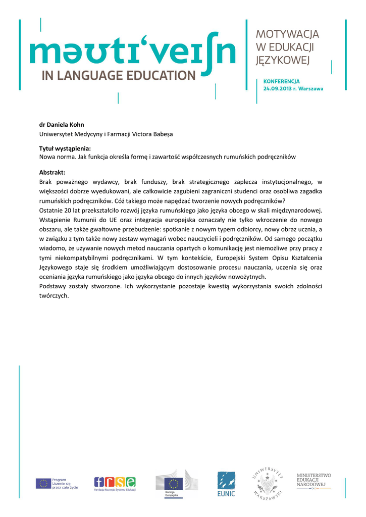 dr Daniela Kohn Uniwersytet Medycyny i Farmacji Victora Babeșa Tytuł wystąpienia: Nowa norma. Jak funkcja określa formę i zawartość współczesnych rumuńskich podręczników Abstrakt: Brak poważnego wydawcy, brak funduszy, brak strategicznego zaplecza instytucjonalnego, w większości dobrze wyedukowani, ale całkowicie zagubieni zagraniczni studenci oraz osobliwa zagadka rumuńskich podręczników. Cóż takiego może napędzać tworzenie nowych podręczników? Ostatnie 20 lat przekształciło rozwój języka rumuńskiego jako języka obcego w skali międzynarodowej. Wstąpienie Rumunii do UE oraz integracja europejska oznaczały nie tylko wkroczenie do nowego obszaru, ale także gwałtowne przebudzenie: spotkanie z nowym typem odbiorcy, nowy obraz ucznia, a w związku z tym także nowy zestaw wymagań wobec nauczycieli i podręczników. Od samego początku wiadomo, że używanie nowych metod nauczania opartych o komunikację jest niemożliwe przy pracy z tymi niekompatybilnymi podręcznikami. W tym kontekście, Europejski System Opisu Kształcenia Językowego staje się środkiem umożliwiającym dostosowanie procesu nauczania, uczenia się oraz oceniania języka rumuńskiego jako języka obcego do innych języków nowożytnych. Podstawy zostały stworzone. Ich wykorzystanie pozostaje kwestią wykorzystania swoich zdolności twórczych.
