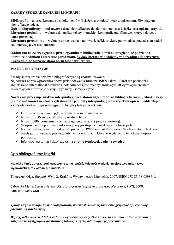 ZASADY SPORZĄDZANIA BIBLIOGRAFII Bibliografia – uporządkowany spis dokumentów (książek, artykułów) wraz z opisem umożliwiającym identyfikację dzieła. Opis bibliograficzny – podstawowe dane identyfikujące dzieło piśmiennicze: książkę, czasopismo, artykuł. Literatura podmiotu – wybrane do analizy teksty literackie, ikonograficzne, filmowe, których dotyczy temat prezentacji. Literatura przedmiotu – wybrane opracowania naukowe, książki, artykuły pozwalające poznać stan badań nad interesującym nas tematem. Oddawana na cztery tygodnie przed egzaminem bibliografia powinna uwzględniać podział na literaturę podmiotu i literaturę przedmiotu. Wykaz literatury podajemy w porządku alfabetycznym uwzględniając pierwsze słowo opisu bibliograficznego. WAŻNE INFORMACJE Zasady sporządzania opisów bibliograficznych są znormalizowane. Najnowsza norma wprowadza obowiązek podawania numeru ISBN książki. Skrót ten pochodzi z angielskiego International Standard Book Number i jest międzynarodowym 10-cyfrowym znakiem zawierającym informację o kraju, wydawcy i samej książce. Norma nie precyzuje znaków interpunkcyjnych stosowanych w opisie bibliograficznym, jednak należy je stosować konsekwentnie, czyli stosować jednolitą interpunkcję we wszystkich opisach, oddzielając każdy element od poprzedniego, np. kropką lub przecinkiem. Opis piszemy w linii ciągłej – od marginesu od marginesu. Numeru ISBN nie przedzielamy na dwie linijki. Numer ISBN pomijamy w opisie fragmentu książki ( pracy zbiorowej). W opisie autora pomijamy informacje o jego stopniach naukowych i funkcjach. Nazwę wydawcy możemy skracać, pisząc np. PWN zamiast Państwowe Wydawnictwo Naukowe. Jeżeli jest to wydanie pierwsze lub nie ma informacji, które to wydanie, to ten element opiso pomijamy. Informacji na temat książki szukaj na stronie tytułowej, a nie na okładce! Opis bibliograficzny książki Nazwisko i imię autora, tytuł, oznaczenie tomu (części), kolejność wydania, miejsce wydania, nazwa wydawnictwa, rok wydania, numer ISBN. Tokarczuk Olga, Bieguni, Wyd. 2, Kraków, Wydawnictwo Literackie, 2007, ISBN 978-83-08-03986-1. Cytowska Maria, Szelest Hanna, Literatura grecka i rzymska w zarysie, Warszawa, PWN, 2000, ISBN 83-01-02224-8. Tytuły książek podaje się bez cudzysłowów, można stosować wyróżnienie graficzne np. czcionkę pogrubioną lub kursywę. W przypadku książki 2 lub 3 autorów wymieniamy wszystkie nazwiska i imiona autorów zgodnie z kolejnością występującą na stronie tytułowej książki, oddzielając je przecinkami. 1 Książka wielotomowa: Prus Bolesław, Lalka, t. 1-3, Warszawa, Świat Książki, 2002, ISBN 83-7311-26-85. W opisie książki autora obcojęzycznego można podać nazwisko tłumacza. William Szekspir, Hamlet, przekład Józef Paszkowski, Kraków, Wydawnictwo Literackie, 2008, ISBN 978-83-7327-023-7. Opis bibliograficzny fragmentu książki Nazwisko i imię autora, tytuł, oznaczenie tomu (części), kolejność wydania, miejsce wydania, nazwa wydawnictwa, rok wydania, lokalizacja w obrębie dokumentu (zakresu stron). Jarosiński Zbigniew, Literatura lat 1945-1975, Wyd.2, Warszawa, PWN, 1996, s. 82-122. Uwaga: w opisie fragmentu pomijamy numer ISBN Opis bibliograficzny wiersza, opowiadania, rozdziału książki , (gdy cała książka jest tego samego autora) Nazwisko i imię autora, tytuł dokumentu macierzystego, oznaczenie tomu (części), kolejność wydania, miejsce wydania, nazwa wydawnictwa, rok wydania, tytuł wiersza (opowiadania lub rozdziału), lokalizacja w obrębie dokumentu (zakres stron). Borowski Tadeusz, Wspomnienia, Wiersze, Opowiadania, Warszawa, Czytelnik, 1985, U nas w Auschwitzu, s. 89-129. Miłosz Czesław, Wiersze, t.1, Kraków, Znak, 1993, Do polityka, s. 238. Opis bibliograficzny fragmentu Biblii Tytuł, miejsce wydania, nazwa wydawnictwa, rok wydania, tytuł Księgi (wszystkie człony tytułu piszemy wielką literą), lokalizacja w obrębie dokumentu (podajemy wersety nie strony). Pismo Święte Starego i Nowego Testamentu, Poznań, Pallottinum, 2009, Księga Hioba, 19,3-21,7. Pismo Święte Starego i Nowego Testamentu, Poznań, Pallottinum, 1990, Ewangelia według św. Łukasza, 1,9-2,13. Uwaga: Biblii i tytułów jej części się nie piszemy kursywą. 2 Opis bibliograficzny pracy zbiorowej (pracą zbiorową jest książką napisana przez więcej niż trzech autorów) Tytuł, pod. red. imię i nazwisko redaktora, oznaczenie tomu (części) gdy praca jest wielotomowa, kolejność wydania, miejsce wydania, nazwa wydawnictwa, rok wydania, numer ISBN. Okresy literackie, pod. red. Jana Majdy, Wyd. 3, Warszawa, WSiP, 1983, ISBN 83-02-00452-9. Poezja polska 1914-1939, antologia, wybór i oprac. Ryszard Matuszewski, Seweryn Pollak, cz. 1, Warszawa, Czytelnik, 1984, ISBN 83-07-00395-4 . Opis pracy zbiorowej rozpoczynamy od tytułu, w informacje o redaktorze pomijamy jego stopnie naukowe ( np. mgr, dr, prof. itp.). Opis bibliograficzny rozdziału (artykułu) pracy zbiorowej Nazwisko i imię autora rozdziału, tytuł rozdziału, w: tytuł dokumentu macierzystego, pod. red. imię i nazwisko redaktora, oznaczenie tomu, miejsce wydania, kolejność wydania, nazwa wydawnictwa, rok wydania, lokalizacja w obrębie dokumentu (zakresu stron). Królikiewicz Grażyna, Romantyzm, w: Okresy literackie, pod. red. Jana Majdy, Wyd. 3, Warszawa, WSiP, 1983, s. 171-215. Ile Stanisław, Legenda Żeromskiego, w: Z problemów literatury polskiej XX wieku, t.1, Warszawa, PIW, 1965, s. 262-278. Opis bibliograficzny hasła w encyklopedii, słowniku Hasło, w: tytuł encyklopedii, miejsce wydania, wydawnictwo, rok wydania, zakres stron. Romantyzm, w: Literatura i nauka o języku, encyklopedia szkolna, red. Andrzej Z. Makowiecki, Warszawa, WSiP, 1995, s. 662-671. W przypadku hasła autorskiego podajemy nazwisko i imię autora hasła. Lam Andrzej, Dadaizm w: Literatura polska XX wieku, przewodnik encyklopedyczny, t.1, red. nauk. Artur 