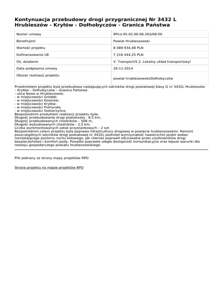Kontynuacja przebudowy drogi przygranicznej Nr 3432 L Hrubieszów - Kryłów - Dołhobyczów - Granica Państwa Numer umowy RPLU.05.02.00-06-263/08-00 Beneficjent Powiat Hrubieszowski Wartość projektu 8 489 934,48 PLN Dofinansowanie UE 7 216 444,25 PLN Oś, działanie V. Transport/5.2. Lokalny układ transportowy/ Data podpisania umowy 26-11-2014 Obszar realizacji projektu powiat hrubieszowski/Dołhobyczów Przedmiotem projektu była przebudowa następujących odcinków drogi powiatowej klasy G nr 3432L Hrubieszów – Kryłów – Dołhobyczów – Granica Państwa: - ulica Nowa w Hrubieszowie; - w miejscowości Gródek; - w miejscowości Kosmów; - w miejscowości Kryłów; - w miejscowości Prehoryłe; - w miejscowości Siekierzyńce. Bezpośrednim produktem realizacji projektu była: Długość przebudowanej drogi powiatowej - 8,5 km, Długość przebudowanych chodników – 508 m, Długość wybudowanych chodników - 2,5 km, Liczba wyremontowanych zatok przystankowych – 2 szt. Bezpośrednim celem projektu była poprawa infrastruktury drogowej w powiecie hrubieszowskim. Remont poszczególnych odcinków drogi powiatowej nr 3432L podniósł wytrzymałość nawierzchni jezdni wobec rozrastającego poziomu ruchu kołowego, jak również poprawił odczuwalne przez użytkowników drogi bezpieczeństwo i komfort jazdy. Ponadto poprawie uległa dostępność komunikacyjna oraz lepsze warunki dla rozwoju gospodarczego powiatu hrubieszowskiego. Plik pobrany ze strony mapy projektów RPO Strona projektu na mapie projektów RPO
