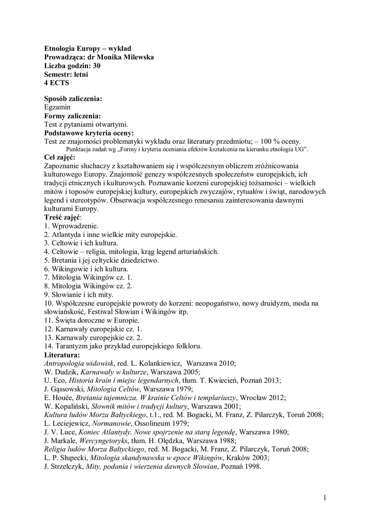 Etnologia Europy – wykład Prowadząca: dr Monika Milewska Liczba godzin: 30 Semestr: letni 4 ECTS Sposób zaliczenia: Egzamin Formy zaliczenia: Test z pytaniami otwartymi. Podstawowe kryteria oceny: Test ze znajomości problematyki wykładu oraz literatury przedmiotu; – 100 % oceny. Punktacja zadań wg „Formy i kryteria oceniania efektów kształcenia na kierunku etnologia UG”. Cel zajęć: Zapoznanie słuchaczy z kształtowaniem się i współczesnym obliczem zróżnicowania kulturowego Europy. Znajomość genezy współczesnych społeczeństw europejskich, ich tradycji etnicznych i kulturowych. Poznawanie korzeni europejskiej tożsamości – wielkich mitów i toposów europejskiej kultury, europejskich zwyczajów, rytuałów i świąt, narodowych legend i stereotypów. Obserwacja współczesnego renesansu zainteresowania dawnymi kulturami Europy. Treść zajęć: 1. Wprowadzenie. 2. Atlantyda i inne wielkie mity europejskie. 3. Celtowie i ich kultura. 4. Celtowie – religia, mitologia, krąg legend arturiańskich. 5. Bretania i jej celtyckie dziedzictwo. 6. Wikingowie i ich kultura. 7. Mitologia Wikingów cz. 1. 8. Mitologia Wikingów cz. 2. 9. Słowianie i ich mity. 10. Współczesne europejskie powroty do korzeni: neopogaństwo, nowy druidyzm, moda na słowiańskość, Festiwal Słowian i Wikingów itp. 11. Święta doroczne w Europie. 12. Karnawały europejskie cz. 1. 13. Karnawały europejskie cz. 2. 14. Tarantyzm jako przykład europejskiego folkloru. Literatura: Antropologia widowisk, red. L. Kolankiewicz, Warszawa 2010; W. Dudzik, Karnawały w kulturze, Warszawa 2005; U. Eco, Historia krain i miejsc legendarnych, tłum. T. Kwiecień, Poznań 2013; J. Gąssowski, Mitologia Celtów, Warszawa 1979; E. Houée, Bretania tajemnicza. W krainie Celtów i templariuszy, Wrocław 2012; W. Kopaliński, Słownik mitów i tradycji kultury, Warszawa 2001; Kultura ludów Morza Bałtyckiego, t.1., red. M. Bogacki, M. Franz, Z. Pilarczyk, Toruń 2008; L. Leciejewicz, Normanowie, Ossolineum 1979; J. V. Luce, Koniec Atlantydy. Nowe spojrzenie na starą legendę, Warszawa 1980; J. Markale, Wercyngetoryks, tłum. H. Olędzka, Warszawa 1988; Religia ludów Morza Bałtyckiego, red. M. Bogacki, M. Franz, Z. Pilarczyk, Toruń 2008; L. P. Słupecki, Mitologia skandynawska w epoce Wikingów, Kraków 2003; J. Strzelczyk, Mity, podania i wierzenia dawnych Słowian, Poznań 1998. 1