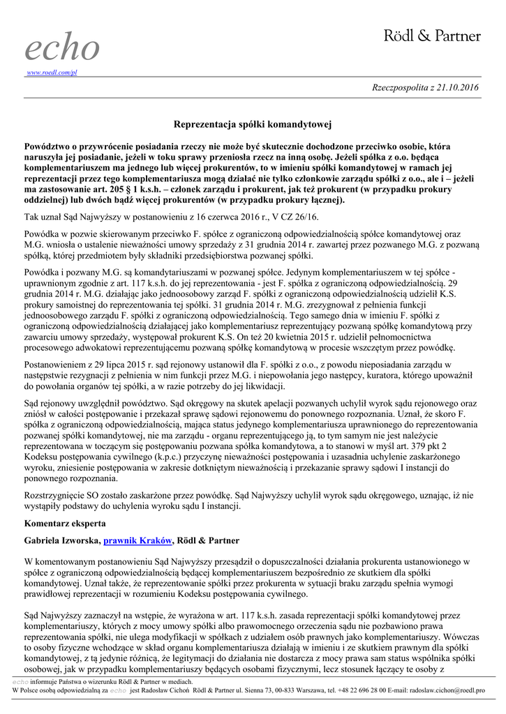 echo www.roedl.com/pl Rzeczpospolita z 21.10.2016 Reprezentacja spółki komandytowej Powództwo o przywrócenie posiadania rzeczy nie może być skutecznie dochodzone przeciwko osobie, która naruszyła jej posiadanie, jeżeli w toku sprawy przeniosła rzecz na inną osobę. Jeżeli spółka z o.o. będąca komplementariuszem ma jednego lub więcej prokurentów, to w imieniu spółki komandytowej w ramach jej reprezentacji przez tego komplementariusza mogą działać nie tylko członkowie zarządu spółki z o.o., ale i – jeżeli ma zastosowanie art. 205 § 1 k.s.h. – członek zarządu i prokurent, jak też prokurent (w przypadku prokury oddzielnej) lub dwóch bądź więcej prokurentów (w przypadku prokury łącznej). Tak uznał Sąd Najwyższy w postanowieniu z 16 czerwca 2016 r., V CZ 26/16. Powódka w pozwie skierowanym przeciwko F. spółce z ograniczoną odpowiedzialnością spółce komandytowej oraz M.G. wniosła o ustalenie nieważności umowy sprzedaży z 31 grudnia 2014 r. zawartej przez pozwanego M.G. z pozwaną spółką, której przedmiotem były składniki przedsiębiorstwa pozwanej spółki. Powódka i pozwany M.G. są komandytariuszami w pozwanej spółce. Jedynym komplementariuszem w tej spółce uprawnionym zgodnie z art. 117 k.s.h. do jej reprezentowania - jest F. spółka z ograniczoną odpowiedzialnością. 29 grudnia 2014 r. M.G. działając jako jednoosobowy zarząd F. spółki z ograniczoną odpowiedzialnością udzielił K.S. prokury samoistnej do reprezentowania tej spółki. 31 grudnia 2014 r. M.G. zrezygnował z pełnienia funkcji jednoosobowego zarządu F. spółki z ograniczoną odpowiedzialnością. Tego samego dnia w imieniu F. spółki z ograniczoną odpowiedzialnością działającej jako komplementariusz reprezentujący pozwaną spółkę komandytową przy zawarciu umowy sprzedaży, występował prokurent K.S. On też 20 kwietnia 2015 r. udzielił pełnomocnictwa procesowego adwokatowi reprezentującemu pozwaną spółkę komandytową w procesie wszczętym przez powódkę. Postanowieniem z 29 lipca 2015 r. sąd rejonowy ustanowił dla F. spółki z o.o., z powodu nieposiadania zarządu w następstwie rezygnacji z pełnienia w nim funkcji przez M.G. i niepowołania jego następcy, kuratora, którego upoważnił do powołania organów tej spółki, a w razie potrzeby do jej likwidacji. Sąd rejonowy uwzględnił powództwo. Sąd okręgowy na skutek apelacji pozwanych uchylił wyrok sądu rejonowego oraz zniósł w całości postępowanie i przekazał sprawę sądowi rejonowemu do ponownego rozpoznania. Uznał, że skoro F. spółka z ograniczoną odpowiedzialnością, mająca status jedynego komplementariusza uprawnionego do reprezentowania pozwanej spółki komandytowej, nie ma zarządu - organu reprezentującego ją, to tym samym nie jest należycie reprezentowana w toczącym się postępowaniu pozwana spółka komandytowa, a to stanowi w myśl art. 379 pkt 2 Kodeksu postępowania cywilnego (k.p.c.) przyczynę nieważności postępowania i uzasadnia uchylenie zaskarżonego wyroku, zniesienie postępowania w zakresie dotkniętym nieważnością i przekazanie sprawy sądowi I instancji do ponownego rozpoznania. Rozstrzygnięcie SO zostało zaskarżone przez powódkę. Sąd Najwyższy uchylił wyrok sądu okręgowego, uznając, iż nie wystąpiły podstawy do uchylenia wyroku sądu I instancji. Komentarz eksperta Gabriela Izworska, prawnik Kraków, Rödl & Partner W komentowanym postanowieniu Sąd Najwyższy przesądził o dopuszczalności działania prokurenta ustanowionego w spółce z ograniczoną odpowiedzialnością będącej komplementariuszem bezpośrednio ze skutkiem dla spółki komandytowej. Uznał także, że reprezentowanie spółki przez prokurenta w sytuacji braku zarządu spełnia wymogi prawidłowej reprezentacji w rozumieniu Kodeksu postępowania cywilnego. Sąd Najwyższy zaznaczył na wstępie, że wyrażona w art. 117 k.s.h. zasada reprezentacji spółki komandytowej przez komplementariuszy, których z mocy umowy spółki albo prawomocnego orzeczenia sądu nie pozbawiono prawa reprezentowania spółki, nie ulega modyfikacji w spółkach z udziałem osób prawnych jako komplementariuszy. Wówczas to osoby fizyczne wchodzące w skład organu komplementariusza działają w imieniu i ze skutkiem prawnym dla spółki komandytowej, z tą jedynie różnicą, że legitymacji do działania nie dostarcza z mocy prawa sam status wspólnika spółki osobowej, jak w przypadku komplementariuszy będących osobami fizycznymi, lecz stosunek łączący te osoby z echo informuje Państwa o wizerunku Rödl & Partner w mediach. W Polsce osobą odpowiedzialną za echo jest Radosław Cichoń Rödl & Partner ul. Sienna 73, 00-833 Warszawa, tel. +48 22 696 28 00 E-mail: [email protected] komplementariuszem. Oznacza to, że w imieniu spółki komandytowej działać mogą osoby fizyczne reprezentujące komplementariusza, tj. w zależności od przyjętego przez komplementariusza sposobu reprezentacji – członkowie zarządu samodzielnie, wspólnie bądź łącznie z prokurentami, jak również – co istotne w analizowanej sprawie – sami prokurenci. Jak wyraźnie podkreślił Sąd Najwyższy, ustanowiona w spółce z o.o. będącej komplementariuszem prokura obejmuje swym zakresem również kompetencję do działania w imieniu i na rzecz spółki komandytowej. W omawianym stanie faktycznym brak organu zarządzającego spowodowany rezygnacją jedynego członka zarządu komplementariusza wywołał wątpliwość dotyczącą dopuszczalności prowadzenia postępowania cywilnego przeciwko spółce komandytowej reprezentowanej jedynie przez prokurenta i ustanowionego przez niego pełnomocnika. Stosownie bowiem do art. 379 pkt 2 k.p.c., brak organu powołanego do reprezentowania strony w postępowaniu cywilnym stanowi przesłankę nieważności postępowania (przy czym w spółce komandytowej, niebędącej osobą prawną i nieposiadającą organów, wspomniane 