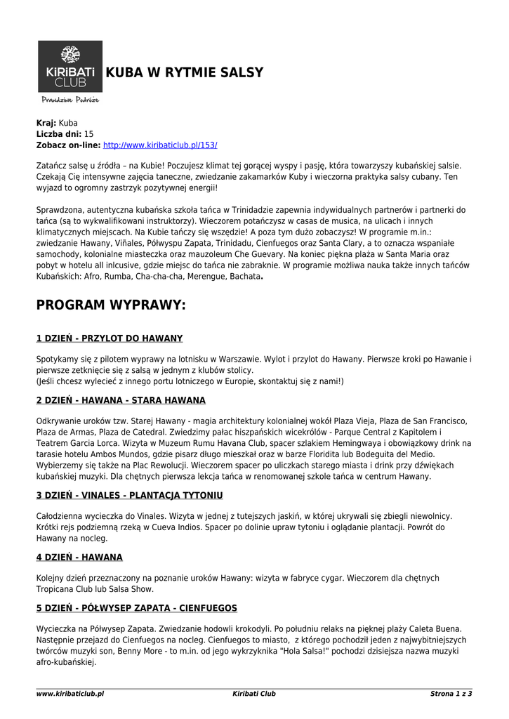KUBA W RYTMIE SALSY Kraj: Kuba Liczba dni: 15 Zobacz on-line: http://www.kiribaticlub.pl/153/ Zatańcz salsę u źródła – na Kubie! Poczujesz klimat tej gorącej wyspy i pasję, która towarzyszy kubańskiej salsie. Czekają Cię intensywne zajęcia taneczne, zwiedzanie zakamarków Kuby i wieczorna praktyka salsy cubany. Ten wyjazd to ogromny zastrzyk pozytywnej energii! Sprawdzona, autentyczna kubańska szkoła tańca w Trinidadzie zapewnia indywidualnych partnerów i partnerki do tańca (są to wykwalifikowani instruktorzy). Wieczorem potańczysz w casas de musica, na ulicach i innych klimatycznych miejscach. Na Kubie tańczy się wszędzie! A poza tym dużo zobaczysz! W programie m.in.: zwiedzanie Hawany, Viñales, Półwyspu Zapata, Trinidadu, Cienfuegos oraz Santa Clary, a to oznacza wspaniałe samochody, kolonialne miasteczka oraz mauzoleum Che Guevary. Na koniec piękna plaża w Santa Maria oraz pobyt w hotelu all inlcusive, gdzie miejsc do tańca nie zabraknie. W programie możliwa nauka także innych tańców Kubańskich: Afro, Rumba, Cha-cha-cha, Merengue, Bachata. PROGRAM WYPRAWY: 1 DZIEŃ - PRZYLOT DO HAWANY Spotykamy się z pilotem wyprawy na lotnisku w Warszawie. Wylot i przylot do Hawany. Pierwsze kroki po Hawanie i pierwsze zetknięcie się z salsą w jednym z klubów stolicy. (Jeśli chcesz wylecieć z innego portu lotniczego w Europie, skontaktuj się z nami!) 2 DZIEŃ - HAWANA - STARA HAWANA Odkrywanie uroków tzw. Starej Hawany - magia architektury kolonialnej wokół Plaza Vieja, Plaza de San Francisco, Plaza de Armas, Plaza de Catedral. Zwiedzimy pałac hiszpańskich wicekrólów - Parque Central z Kapitolem i Teatrem Garcia Lorca. Wizyta w Muzeum Rumu Havana Club, spacer szlakiem Hemingwaya i obowiązkowy drink na tarasie hotelu Ambos Mundos, gdzie pisarz długo mieszkał oraz w barze Floridita lub Bodeguita del Medio. Wybierzemy się także na Plac Rewolucji. Wieczorem spacer po uliczkach starego miasta i drink przy dźwiękach kubańskiej muzyki. Dla chętnych pierwsza lekcja tańca w renomowanej szkole tańca w centrum Hawany. 3 DZIEŃ - VINALES - PLANTACJA TYTONIU Całodzienna wycieczka do Vinales. Wizyta w jednej z tutejszych jaskiń, w której ukrywali się zbiegli niewolnicy. Krótki rejs podziemną rzeką w Cueva Indios. Spacer po dolinie upraw tytoniu i oglądanie plantacji. Powrót do Hawany na nocleg. 4 DZIEŃ - HAWANA Kolejny dzień przeznaczony na poznanie uroków Hawany: wizyta w fabryce cygar. Wieczorem dla chętnych Tropicana Club lub Salsa Show. 5 DZIEŃ - PÓŁWYSEP ZAPATA - CIENFUEGOS Wycieczka na Półwysep Zapata. Zwiedzanie hodowli krokodyli. Po południu relaks na pięknej plaży Caleta Buena. Następnie przejazd do Cienfuegos na nocleg. Cienfuegos to miasto, z którego pochodził jeden z najwybitniejszych twórców muzyki son, Benny More - to m.in. od jego wykrzyknika "Hola Salsa!" pochodzi dzisiejsza nazwa muzyki afro-kubańskiej. www.kiribaticlub.pl Kiribati Club Strona 1 z 3 6 DZIEŃ - EL NICHO - TRINIDAD Rano pobyt w delfinarium – kąpiele z delfinami! Po południu przejazd do El Nicho, dla chętnych kąpiele w wodospadach. Wieczorem przyjazd do Trinidadu – miasta skansenu na nocleg. 7 DZIEŃ - TRINIDAD (KURS TAŃCA: DZIEŃ 1) Zwiedzanie Trinidadu. Na dobry początek tradycyjny drink La Canchanchara i spotkanie z instruktorami sprawdzonej przez nas szkoły tańca (zajęcia po 1,5 godz.). Po południu chętni mogą podjechać na plażę lub powłóczyć się po miasteczku. Wieczorne wspólne wyjście do Casa de La Musica i próba swoich sił na parkiecie. Dodatkowo istnieje możliwość nauki języka hiszpańskiego. 8 DZIEŃ - TRINIDAD (KURS TAŃCA: DZIEŃ 2) Rano dla chętnych wyjazd w góry Sierra de Escambray i lekki trekking po porastającym je podzwrotnikowym lesie z kąpielą pod wodospadem lub wycieczka konna do źródełka na kąpiel i posiłek w domu wiejskim u guajiro. Nocleg w Trinidadzie. Wieczorem lekcja salsy. 9 DZIEŃ - TRINIDAD (KURS TAŃCA: DZIEŃ 3) Zajęcia w szkole salsy. Dla chętnych wizyta u Babalawo („ojciec sekretów” w afroamerykańskim kulcie Santeria), który wróży ze specjalnych muszelek kauri. Wieczorem wspólne wyjście z instruktorami do Casa de La Trova. 10 DZIEŃ - TRINIDAD (KURS TAŃCA: DZIEŃ 4) Zajęcia w szkole salsy. Czas wolny na odkrywanie miasteczka. Wieczorem wspólne wyjście z instruktorami do Casa de La Trova. 11 DZIEŃ - TRINIDAD (KURS TAŃCA: DZIEŃ 5) Zajęcia w szkole salsy. Pożegnanie z instruktorami i wspólne wyjście do Casa de La Musica. 12 DZIEŃ - PRZEJAZD DO CAYO SANTA MARIA Przejazd do Cayo Santa Maria. Po drodze zwiedzanie mauzoleum Che Guevary w Santa Clara. Zakwaterowanie w hotelu 4* w opcji all inlcusive przy samej plaży. 13 DZIEŃ - CAYO SANTA MARIA Pobyt w Santa Maria, odpoczynek na plaży. 14-15 DZIEŃ - POWRÓT Transfer na lotnisko, wylot do Europy. Pożegnanie z pilotem na lotnisku w Warszawie i zakończenie wyprawy. CENA OBEJMUJE: ● ● ● ● ● ● ● ● ● bilety lotnicze na trasie: Warszawa - Hawana - Warszawa transfery z/na lotnisko na Kubie 11 noclegów w casas particulares (kwatery prywatne) 2 noclegi w hotelu 4* all inclusive w Cayo Santa Maria prywatny transport wynajętym busem na całej trasie zgodnie z programem kurs tańca salsy zgodnie z programem opiekę pilota Kiribati Club ubezpieczenie Signal Iduna KL 30000 EUR i NNW 15000 PLN, bagaż podróżny 1000 PLN zestaw podróżnika Kiribati Club: koszulka klubowa worek sportowy etui na bilet karta ubezpieczeniowa ❍ ❍ ❍ ❍ www.kiribaticlub.pl Kiribati Club Strona 2 z 3 CENA NIE OBEJMUJE: ● ● ● ● ● ● opłaty wylotowej, biletów wstępu do miejsc wymienionych w programie oraz transportu na miejscu: taxi, ryksze itp. - ok. 95 EUR/os wyżywienia: ok. 20-25 EUR dziennie na osobę dodatkowych lekcji salsy: ok. 10 EUR/45 min obowiązkowej składki na turystyczny fundusz gwarancyjny: 13 PLN/os. atrakcji dla chętnych opłaty wizowej ZALICZKA: 1000 pln Jeśli chcesz wylecieć z i