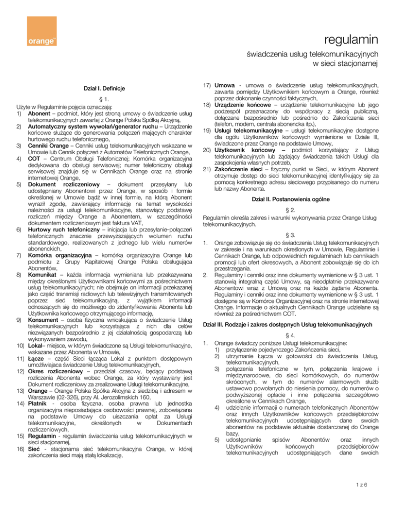 regulamin świadczenia usług telekomunikacyjnych w sieci stacjonarnej Dział I. Definicje § 1. Użyte w Regulaminie pojęcia oznaczają: 1) Abonent – podmiot, który jest stroną umowy o świadczenie usług telekomunikacyjnych zawartej z Orange Polska Spółką Akcyjną, 2) Automatyczny system wywołań/generator ruchu – Urządzenie końcowe służące do generowania połączeń mających charakter hurtowego ruchu telefonicznego, 3) Cenniki Orange – Cenniki usług telekomunikacyjnych wskazane w Umowie lub Cennik połączeń z Automatów Telefonicznych Orange, 4) COT – Centrum Obsługi Telefonicznej; Komórka organizacyjna dedykowana do obsługi serwisowej; numer telefoniczny obsługi serwisowej znajduje się w Cennikach Orange oraz na stronie internetowej Orange, 5) Dokument rozliczeniowy – dokument przesyłany lub udostępniany Abonentowi przez Orange, w sposób i formie określonej w Umowie bądź w innej formie, na którą Abonent wyraził zgodę, zawierający informację na temat wysokości należności za usługi telekomunikacyjne, stanowiący podstawę rozliczeń między Orange a Abonentem, w szczególności dokumentem rozliczeniowym jest faktura VAT, 6) Hurtowy ruch telefoniczny – inicjacja lub przesyłanie połączeń telefonicznych znacznie przewyższających wolumen ruchu standardowego, realizowanych z jednego lub wielu numerów abonenckich, 7) Komórka organizacyjna – komórka organizacyjna Orange lub podmiotu z Grupy Kapitałowej Orange Polska obsługująca Abonentów, 8) Komunikat – każda informacja wymieniana lub przekazywana między określonymi Użytkownikami końcowymi za pośrednictwem usług telekomunikacyjnych; nie obejmuje on informacji przekazanej jako część transmisji radiowych lub telewizyjnych transmitowanych poprzez sieć telekomunikacyjną, z wyjątkiem informacji odnoszących się do możliwego do zidentyfikowania Abonenta lub Użytkownika końcowego otrzymującego informację, 9) Konsument – osoba fizyczna wnioskująca o świadczenie Usług telekomunikacyjnych lub korzystająca z nich dla celów niezwiązanych bezpośrednio z jej działalnością gospodarczą lub wykonywaniem zawodu, 10) Lokal– miejsce, w którym świadczone są Usługi telekomunikacyjne, wskazane przez Abonenta w Umowie, 11) Łącze – część Sieci łącząca Lokal z punktem dostępowym umożliwiajaca świadczenie Usług telekomunikacyjnych, 12) Okres rozliczeniowy – przedział czasowy, będący podstawą rozliczenia Abonenta wobec Orange, za który wystawiany jest Dokument rozliczeniowy za zrealizowane Usługi telekomunikacyjne, 13) Orange – Orange Polska Spółka Akcyjna z siedzibą i adresem w Warszawie (02-326), przy Al. Jerozolimskich 160, 14) Płatnik - osoba fizyczna, osoba prawna lub jednostka organizacyjna nieposiadająca osobowości prawnej, zobowiązana na podstawie Umowy do uiszczania opłat za Usługi telekomunikacyjne, określonych w Dokumentach rozliczeniowych, 15) Regulamin - regulamin świadczenia usług telekomunikacyjnych w sieci stacjonarnej, 16) Sieć - stacjonarna sieć telekomunikacyjna Orange, w której zakończenia sieci mają stałą lokalizację, 17) Umowa - umowa o świadczenie usług telekomunikacyjnych, zawarta pomiędzy Użytkownikiem końcowym a Orange, również poprzez dokonanie czynności faktycznych, 18) Urządzenie końcowe – urządzenie telekomunikacyjne lub jego podzespół przeznaczony do współpracy z siecią publiczną, dołączane bezpośrednio lub pośrednio do Zakończenia sieci (telefon, modem, centrala abonencka itp.), 19) Usługi telekomunikacyjne – usługi telekomunikacyjne dostępne dla ogółu Użytkowników końcowych wymienione w Dziale III, świadczone przez Orange na podstawie Umowy, 20) Użytkownik końcowy – podmiot korzystający z Usług telekomunikacyjnych lub żądający świadczenia takich Usługi dla zaspokojenia własnych potrzeb, 21) Zakończenie sieci – fizyczny punkt w Sieci, w którym Abonent otrzymuje dostęp do sieci telekomunikacyjnej identyfikujący się za pomocą konkretnego adresu sieciowego przypisanego do numeru lub nazwy Abonenta. Dział II. Postanowienia ogólne § 2. Regulamin określa zakres i warunki wykonywania przez Orange Usług telekomunikacyjnych. 1. 2. § 3. Orange zobowiązuje się do świadczenia Usług telekomunikacyjnych w zakresie i na warunkach określonych w Umowie, Regulaminie i Cennikach Orange, lub odpowiednich regulaminach lub cennikach promocji lub ofert okresowych, a Abonent zobowiązuje się do ich przestrzegania. Regulaminy i cenniki oraz inne dokumenty wymienione w § 3 ust. 1 stanowią integralną część Umowy, są nieodpłatnie przekazywane Abonentowi wraz z Umową oraz na każde żądanie Abonenta. Regulaminy i cenniki oraz inne dokumenty wymienione w § 3 ust. 1 dostępne są w Komórce Organizacyjnej oraz na stronie internetowej Orange. Informacje o aktualnych Cennikach Orange udzielane są również za pośrednictwem COT. Dział III. Rodzaje i zakres dostępnych Usług telekomunikacyjnych 1. § 4. Orange świadczy poniższe Usługi telekomunikacyjne: 1) przyłączenie pojedynczego Zakończenia sieci, 2) utrzymanie Łącza w gotowości do świadczenia Usług, telekomunikacyjnych, 3) połączenia telefoniczne w tym, połączenia krajowe i międzynarodowe, do sieci komórkowych, do numerów skróconych, w tym do numerów alarmowych służb ustawowo powołanych do niesienia pomocy, do numerów o podwyższonej opłacie i inne połączenia szczegółowo określone w Cennikach Orange, 4) udzielanie informacji o numerach telefonicznych Abonentów oraz innych Użytkowników końcowych przedsiębiorców telekomunikacyjnych udostępniających dane swoich abonentów na podstawie aktualnie dostarczanej do Orange bazy, 5) udostępnianie spisów Abonentów oraz innych Użytkowników końcowych przedsiębiorców telekomunikacyjnych udostępniających dane swoich 1z6 2. abonentów na podstawie aktualnie dostarczanej do Orange bazy, 6) usługi telefoniczne ś