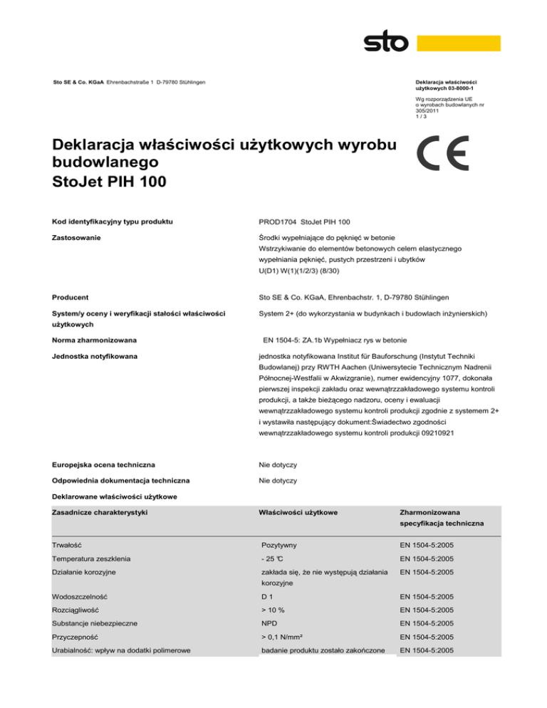 Sto SE & Co. KGaA Ehrenbachstraße 1 D-79780 Stühlingen Deklaracja właściwości użytkowych 03-8000-1 Wg rozporządzenia UE o wyrobach budowlanych nr 305/2011 1/3 Deklaracja właściwości użytkowych wyrobu budowlanego StoJet PIH 100 Kod identyfikacyjny typu produktu Zastosowanie PROD1704 StoJet PIH 100 Środki wypełniające do pęknięć w betonie Wstrzykiwanie do elementów betonowych celem elastycznego wypełniania pęknięć, pustych przestrzeni i ubytków U(D1) W(1)(1/2/3) (8/30) Producent Sto SE & Co. KGaA, Ehrenbachstr. 1, D-79780 Stühlingen System/y oceny i weryfikacji stałości właściwości System 2+ (do wykorzystania w budynkach i budowlach inżynierskich) użytkowych Norma zharmonizowana Jednostka notyfikowana EN 1504-5: ZA.1b Wypełniacz rys w betonie jednostka notyfikowana Institut für Bauforschung (Instytut Techniki Budowlanej) przy RWTH Aachen (Uniwersytecie Technicznym Nadrenii Północnej-Westfalii w Akwizgranie), numer ewidencyjny 1077, dokonała pierwszej inspekcji zakładu oraz wewnątrzzakładowego systemu kontroli produkcji, a także bieżącego nadzoru, oceny i ewaluacji wewnątrzzakładowego systemu kontroli produkcji zgodnie z systemem 2+ i wystawiła następujący dokument:Świadectwo zgodności wewnątrzzakładowego systemu kontroli produkcji 09210921 Europejska ocena techniczna Nie dotyczy Odpowiednia dokumentacja techniczna Nie dotyczy Deklarowane właściwości użytkowe Zasadnicze charakterystyki Właściwości użytkowe Zharmonizowana specyfikacja techniczna Trwałość Pozytywny EN 1504-5:2005 Temperatura zeszklenia - 25 °C EN 1504-5:2005 Działanie korozyjne zakłada się, że nie występują działania EN 1504-5:2005 korozyjne Wodoszczelność D1 EN 1504-5:2005 Rozciągliwość > 10 % EN 1504-5:2005 Substancje niebezpieczne NPD EN 1504-5:2005 Przyczepność > 0,1 N/mm² EN 1504-5:2005 Urabialność: wpływ na dodatki polimerowe badanie produktu zostało zakończone EN 1504-5:2005 Sto SE & Co. KGaA Ehrenbachstraße 1 D-79780 Stühlingen Deklaracja właściwości użytkowych 03-8000-1 Wg rozporządzenia UE o wyrobach budowlanych nr 305/2011 2/3 wynikiem pozytywnym Urabialność: możliwość wtryskiwania w suchym środowisku klasa iniekcyjności: 0,1 EN 1504-5:2005 Urabialność: możliwość wtryskiwania w wilgotne środowisko klasa iniekcyjności: 0,1 EN 1504-5:2005 Właściwości użytkowe wyrobu odpowiadają deklarowanym właściwościom użytkowym. Niniejsza deklaracja właściwości użytkowych wydana zostaje na wyłączną odpowiedzialność producenta. W imieniu producenta podpisał: 12.11.2014 Sto SE & Co. KGaA D-79780 Stühlingen Załącznik: Karta charakterystyki Z up. dr Hans Klein/Kierownik Działu Aprobat i Badań Sto SE & Co. KGaA Ehrenbachstraße 1 D-79780 Stühlingen Deklaracja właściwości użytkowych 03-8000-1 Wg rozporządzenia UE o wyrobach budowlanych nr 305/2011 3/3 Sto SE & Co. KGaA Ehrenbachstraße 1 D-79780 Stühlingen 03-8000-1 12 0921 PROD1704 StoJet PIH 100 EN 1504-5: ZA.1b Wypełniacz rys w betonie Środki wypełniające do pęknięć w betonie Wstrzykiwanie do elementów betonowych celem elastycznego wypełniania pęknięć, pustych przestrzeni i ubytków U(D1) W(1)(1/2/3) (8/30) Trwałość Pozytywny Temperatura zeszklenia - 25 °C Działanie korozyjne zakłada się, że nie występują działania korozyjne Wodoszczelność D1 Rozciągliwość > 10 % Substancje niebezpieczne NPD Przyczepność > 0,1 N/mm² Urabialność: wpływ na dodatki polimerowe badanie produktu zostało zakończone wynikiem pozytywnym Urabialność: możliwość wtryskiwania w suchym środowisku klasa iniekcyjności: 0,1 Urabialność: możliwość wtryskiwania w wilgotne środowisko klasa iniekcyjności: 0,1