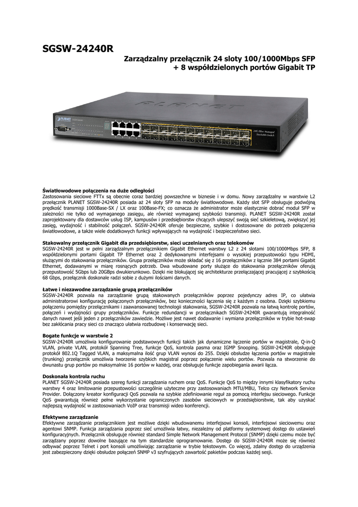 SGSW-24240R Zarządzalny przełącznik 24 sloty 100/1000Mbps SFP + 8 współdzielonych portów Gigabit TP Światłowodowe połączenia na duże odległości Zastosowania sieciowe FTTx są obecnie coraz bardziej powszechne w biznesie i w domu. Nowy zarządzalny w warstwie L2 przełącznik PLANET SGSW-24240R posiada aż 24 sloty SFP na moduły światłowodowe. Każdy slot SFP obsługuje podwójną prędkość transmisji 1000Base-SX / LX oraz 100Base-FX; co oznacza że administrator może elastycznie dobrać moduł SFP w zależności nie tylko od wymaganego zasięgu, ale również wymaganej szybkości transmisji. PLANET SGSW-24240R został zaprojektowany dla dostawców usług ISP, kampusów i przedsiębiorstw chcących ulepszyć swoją sieć szkieletową, zwiększyć jej zasięg, wydajność i stabilność połączeń. SGSW-24240R oferuje bezpieczne, szybkie i dostosowane do potrzeb połączenia światłowodowe, a także wiele dodatkowych funkcji wpływających na wydajność i bezpieczeństwo sieci. Stakowalny przełącznik Gigabit dla przedsiębiorstw, sieci uczelnianych oraz telekomów SGSW-24240R jest w pełni zarządzalnym przełącznikiem Gigabit Ethernet warstwy L2 z 24 slotami 100/1000Mbps SFP, 8 współdzielonymi portami Gigabit TP Ethernet oraz 2 dedykowanymi interfejsami o wysokiej przepustowości typu HDMI, służącymi do stakowania przełączników. Grupa przełączników może składać się z 16 przełączników z łącznie 384 portami Gigabit Ethernet, dodawanymi w miarę rosnących potrzeb. Dwa wbudowane porty służące do stakowania przełączników oferują przepustowość 5Gbps lub 20GBps dwukierunkowo. Dzięki nie blokującej się architekturze przełączającej pracującej z szybkością 68 Gbps, przełącznik doskonale radzi sobie z dużymi ilościami danych. Łatwe i niezawodne zarządzanie grupą przełączników SGSW-24240R pozwala na zarządzanie grupą stakowanych przełączników poprzez pojedynczy adres IP, co ułatwia administratorowi konfigurację połączonych przełączników, bez konieczności łączenia się z każdym z osobna. Dzięki szybkiemu połączeniu pomiędzy przełącznikami i zaawansowanej technologii stakowania, SGSW-24240R pozwala na łatwą kontrolę portów, połączeń i wydajności grupy przełączników. Funkcje redundancji w przełącznikach SGSW-24240R gwarantują integralność danych nawet jeśli jeden z przełączników zawiedzie. Możliwe jest nawet dodawanie i wymiana przełączników w trybie hot-swap bez zakłócania pracy sieci co znacząco ułatwia rozbudowę i konserwację sieci. Bogate funkcje w warstwie 2 SGSW-24240R umożliwia konfigurowanie podstawowych funkcji takich jak dynamiczne łączenie portów w magistrale, Q-in-Q VLAN, private VLAN, protokół Spanning Tree, funkcje QoS, kontrola pasma oraz IGMP Snooping. SGSW-24240R obsługuje protokół 802.1Q Tagged VLAN, a maksymalna ilość grup VLAN wynosi do 255. Dzięki obsłudze łączenia portów w magistrale (trunking) przełącznik umożliwia tworzenie szybkich magistral poprzez połączenie wielu portów. Pozwala na stworzenie do dwunastu grup portów po maksymalnie 16 portów w każdej, oraz obsługuje funkcje zapobiegania awarii łącza. Doskonała kontrola ruchu PLANET SGSW-24240R posiada szereg funkcji zarządzania ruchem oraz QoS. Funkcje QoS to między innymi klasyfikatory ruchu warstwy 4 oraz limitowanie przepustowości szczególnie użyteczne przy zastosowaniach MTU/MBU, Telco czy Network Service Provider. Dołączony kreator konfiguracji QoS pozwala na szybkie zdefiniowanie reguł za pomocą interfejsu sieciowego. Funkcje QoS gwarantują również pełne wykorzystanie ograniczonych zasobów sieciowych w przedsiębiorstwie, tak aby uzyskać najlepszą wydajność w zastosowaniach VoIP oraz transmisji wideo konferencji. Efektywne zarządzanie Efektywne zarządzanie przełącznikiem jest możliwe dzięki wbudowanemu interfejsowi konsoli, interfejsowi sieciowemu oraz agentowi SNMP. Funkcja zarządzania poprzez sieć umożliwia łatwy, niezależny od platformy systemowej dostęp do ustawień konfiguracyjnych. Przełącznik obsługuje również standard Simple Network Management Protocol (SNMP) dzięki czemu może być zarządzany poprzez dowolne bazujące na tym standardzie oprogramowanie. Dostęp do SGSW-24240R może się również odbywać poprzez Telnet i port konsoli umożliwiając zarządzanie w trybie tekstowym. Co więcej, zdalny dostęp do urządzenia jest zabezpieczony dzięki obsłudze połączeń SNMP v3 szyfrujących zawartość pakietów podczas każdej sesji. Wysokie bezpieczeństwo PLANET SGSW-24240R oferuje listę kontroli dostępu (ACL) L2 do L4 zapewniającą pełne bezpieczeństwo. Można ją wykorzystać do ograniczania dostępu do sieci blokując pakiety w oparciu o źródłowy i docelowy adres IP, porty TCP/UDP lub zdefiniowane aplikacje sieciowe. Mechanizmy bezpieczeństwa zawierają bazującą na portach i adresach MAC autoryzację użytkowników i urządzeń w standardzie 802.1x. Funkcja Private VLAN pozwala na blokowanie komunikacji między brzegowymi portami gwarantując zachowanie prywatności. Administratorzy mogą dużo łatwiej i szybciej konstruować sieci firmowe o wysokim stopniu bezpieczeństwa. Redundantne zasilanie AC / DC gwarantujące ciągłość pracy SGSW-24240R został wyposażony w jeden zasilacz 100~240V AC i jeden dodatkowy zasilacz DC -48V. Redundantny system zasilania zwiększa niezawodność pozwalając na zasilanie prądem zmiennym 100~240V lub stałym -48V. Taki system zapewnia ciągłość zasilania, która jest kluczowa w najbardziej zaawansowanych sieciach. Co więcej, dzięki zasilaczowi -48V DC przełącznik SGSW-24240R może być łatwo wykorzystanych w sieciach telekomów Podstawowe cechy Porty • • • • 24 sloty 100/1000Base-X mini-GBIC / SFP 8 portów 10/100/1000Base-T RJ-45, współdzielone ze slotami 1 do 8 2 porty typu HDMI o przepustowości 5Gbps do stakowania przełączników Port konsoli RS