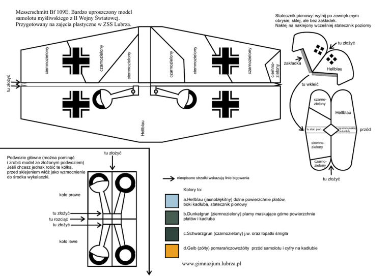 Messerschmitt Bf 109E. Bardzo uproszczony model samolotu myœliwskiego z II Wojny Œwiatowej. Przygotowany na zajêcia plastyczne w ZSS Lubrza. ciemnozielony czarnozielony ciemnozielony czarnozielony ciemnozielony czarnozielony tu z³o¿yæ tu z³o¿yæ ciemnozielony Statecznik pionowy: wytnij po zewnêtrznym obrysie, sklej, ale bez zak³adek. Naklej na naklejony wczeœniej statecznik poziomy zak³adka Hellblau tu wkleiæ czarnozielony Hellblau Hellblau t¹ stron¹ naklej na kad³ub tu stat. pion ciemnozielony tu z³o¿yæ Podwozie g³ówne (mo¿na pomin¹æ i zrobiæ model ze z³o¿onym podwoziem) Jeœli chcesz jednak robiæ te kó³ka, przed sklejeniem w³ó¿ jako wzmocnienie do œrodka wyka³aczki. czarnozielony nieopisane strza³ki wskazuj¹ linie bigowania Kolory to: ko³o prawe a.Hellblau (jasnob³êkitny) dolne powierzchnie p³atów, boki kad³uba, statecznik pionowy tu z³o¿yæ tu rozci¹æ tu z³o¿yæ b.Dunkelgrun (ziemnozielony) plamy maskuj¹ce górne powierzchnie p³atów i kad³uba c.Schwarzgrun (czarnozielony) j.w. oraz ³opatki œmig³a ko³o lewe d.Gelb (zó³ty) pomarañczowo¿ó³ty przód samolotu i cyfry na kad³ubie www.gimnazjum.lubrza.pl tu z³o¿yæ przód www.gimnazjum.lubrza.pl nieopisane strza³ki wskazuj¹ miejsca bigowania szare zak³adki do sklejenia oddzielamy od reszty bigowaniem - têpym no¿em robimy rowek, by siê lepeij zagina³y. Kolory kamufla¿u: cz: czarnozielony z: ciemnozielony Hellblau z cz tu z³o¿yæ cz z z z tu wklej ko³pak œmig³a ¿ó³ty z cz Statecznik cz cz Hellblau ¿ó³ty 12 He tu p Za kabin¹ pilota w miejscu oznaczonym mo¿na wkleiæ wyka³aczkê - antenê. cz z cz Œmig³o: wytnij po zewnêtrznym, obrysie, z³ó¿, sklej, wytnij œmig³o. Naklej miêdzy kad³ub a ko³pak œmig³a. cz ¿ó ³ ty sk l ej odk rzy llb la Kó ³ ko u d³o ¿ó³ty kó³ko podogonowe. Wytnij ca³oœæ, z³ó¿ symetrycznie, sklej (bez zak³adki), wytnij. ko³pak œmig³a