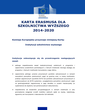 KARTA ERASMUSA DLA SZKOLNICTWA WYŻSZEGO 2014-2020 Komisja Europejska przyznaje niniejszą Kartę: Instytucji szkolnictwa wyższego Instytucja zobowiązuje się do przestrzegania następujących zasad: pełnego respektowania zasad niedyskryminacji ustalonych w programie i zapewnienia uczestnikom pochodzącym z różnych środowisk równego dostępu do programu i równych możliwości korzystania z jego oferty; zapewnienia pełnego uznania przyznanych punktów zaliczeniowych w ramach wszystkich pomyślnie ukończonych zajęć za granicą oraz, w miarę możliwości, praktyk zagranicznych (punktów ECTS lub punktów zaliczeniowych przyznanych w porównywalnym do ECTS systemie); uwzględnienia pomyślnie ukończonych zajęć za granicą/praktyki zagranicznej w jego dorobku w uczelni macierzystej (w suplemencie do dyplomu lub porównywalnym dokumencie); niepobierania od studentów przyjeżdżających w ramach mobilności w celu gromadzenia osiągnięć (credit mobility) żadnych opłat za naukę, rejestrację, egzaminy ani korzystanie z laboratoriów lub bibliotek. Karta Erasmusa dlaSzkolnictwa Wyższego 2014-2020 Instytucja zobowiązuje się również do: - w przypadku mobilności edukacyjnej przed rozpoczęciem okresu mobilności publikowania na swojej stronie internetowej oraz regularnego aktualizowania katalogów przedmiotów na długo przed rozpoczęciem okresu mobilności, aby zapewnić przejrzystość informacji dla wszystkich zainteresowanych i umożliwić studentom – kandydatom do wyjazdu – merytorycznego wyboru przedmiotów w ramach kształcenia za granicą; realizowania mobilności w oparciu o zawarte uprzednio umowy międzyinstytucjonalne. Umowy te określają rolę i obowiązki każdej ze stron i zobowiązują je do przestrzegania uzgodnionych kryteriów jakościowych stosowanych podczas naboru kandydatów, przygotowania uczestników mobilności, ich przyjęcia w instytucji zagranicznej oraz integracji z lokalną społecznością; zapewnienia uczestnikom mobilności dobrego przygotowania do wyjazdu, w tym przygotowania językowego pozwalającego na osiągnięcie odpowiedniego poziomu biegłości; realizowania mobilności edukacyjnej studentów i pracowników na podstawie przygotowanych i zatwierdzonych przed wyjazdem porozumień (o programie studiów/praktyki w przypadku studentów oraz o programie nauczania/szkolenia w przypadku pracowników), uzgodnionych przez instytucję wysyłającą, przyjmującą i uczestników mobilności; zapewnienia wyjeżdżającym i przyjeżdżającym uczestnikom mobilności pomocy związanej z uzyskaniem wizy, jeżeli jest ona wymagana; zapewnienia wyjeżdżającym i przyjeżdżającym uczestnikom mobilności pomocy związanej z uzyskaniem ubezpieczenia, jeżeli jest ono wymagane; zapewnienia przyjeżdżającym uczestnikom mobilności wsparcia związanego ze znalezieniem zakwaterowania; Strona 2 z 4 Karta Erasmusa dlaSzkolnictwa Wyższego 2014-2020 podczas okresu mobilności zapewnienia równego traktowania studentów i pracowników miejscowych oraz przyjeżdżających uczestników mobilności pod kątem akademickim i w odniesieniu do innych świadczonych usług; włączenia przyjeżdżających uczestników mobilności do codziennego życia instytucji przyjmującej; oferowania przyjeżdżającym uczestnikom mobilności odpowiedniego doradztwa i wsparcia; udzielania przyjeżdżającym uczestnikom mobilności odpowiedniego wsparcia językowego; po zakończeniu okresu mobilności uznania wszystkich działań studenta wymienionych w porozumieniach o programie studiów/praktyki – pod warunkiem ich pomyślnego zrealizowania – za część składową programu kształcenia prowadzącego do uzyskania dyplomu uczelni macierzystej; terminowego przekazania przyjeżdżającym uczestnikom mobilności oraz ich instytucjom macierzystym, na koniec okresu mobilności, pełnego i dokładnego wykazu zaliczeń; wspierania reintegracji powracających uczestników mobilności oraz umożliwiania im wykorzystania uzyskanych doświadczeń dla dobra instytucji i innych studentów/pracowników; uznania działań dydaktycznych i szkoleniowych podjętych przez pracowników podczas okresu mobilności zgodnie z wcześniej zawartym porozumieniem; - w przypadku udziału w europejskich i międzynarodowych projektach współpracy zadbania o to, by podejmowana współpraca prowadziła do trwałych rezultatów przynoszących korzyści wszystkim partnerom; Strona 3 z 4 Karta Erasmusa dlaSzkolnictwa Wyższego 2014-2020 udzielania odpowiedniego wsparcia uczestniczącym w projektach pracownikom i studentom; wykorzystywania rezultatów projektów w taki sposób, aby zapewnić jak największy ich wpływ na indywidualnych uczestników i instytucje, jak również popierania wzajemnej wymiany wiedzy i doświadczeń w obrębie szerszej wspólnoty akademickiej; - w celu propagowania informacji zamieszczenia niniejszej Karty wraz z deklaracją polityki uczelni Erasmusa w eksponowanym miejscu na stronie internetowej Instytucji; konsekwentnego promowania działań podejmowanych w programie i ich rezultatów. W imieniu instytucji przyjmuję do wiadomości, że wdrażanie postanowień Karty będzie monitorowane przez Komisję Europejską i że naruszenie którejkolwiek z wyżej wymienionych zasad lub któregokolwiek z zobowiązań może prowadzić do anulowania Karty przez Komisję Europejską. Podpis IMIĘ I NAZWISKO Przedstawiciel prawny Kod Erasmusa Strona 4 z 4