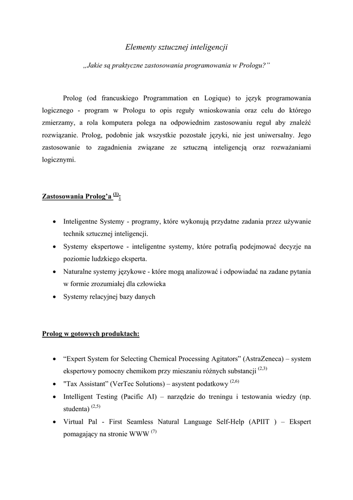 Elementy sztucznej inteligencji „Jakie są praktyczne zastosowania programowania w Prologu?” Prolog (od francuskiego Programmation en Logique) to język programowania logicznego - program w Prologu to opis reguły wnioskowania oraz celu do którego zmierzamy, a rola komputera polega na odpowiednim zastosowaniu reguł aby znaleźć rozwiązanie. Prolog, podobnie jak wszystkie pozostałe języki, nie jest uniwersalny. Jego zastosowanie to zagadnienia związane ze sztuczną inteligencją oraz rozważaniami logicznymi. Zastosowania Prolog’a (1): • Inteligentne Systemy - programy, które wykonują przydatne zadania przez używanie technik sztucznej inteligencji. • Systemy ekspertowe - inteligentne systemy, które potrafią podejmować decyzje na poziomie ludzkiego eksperta. • Naturalne systemy językowe - które mogą analizować i odpowiadać na zadane pytania w formie zrozumiałej dla człowieka • Systemy relacyjnej bazy danych Prolog w gotowych produktach: • “Expert System for Selecting Chemical Processing Agitators” (AstraZeneca) – system ekspertowy pomocny chemikom przy mieszaniu różnych substancji (2,3) • "Tax Assistant” (VerTec Solutions) – asystent podatkowy (2,6) • Intelligent Testing (Pacific AI) – narzędzie do treningu i testowania wiedzy (np. studenta) (2,5) • Virtual Pal - First Seamless Natural Language Self-Help (APIIT ) – Ekspert pomagający na stronie WWW (7) • "Geoinformatyczny System Sigma" (RIAC INTEK) - jest to system optymalizujący wykorzystanie środków finansowych, bazy transportowej, zasobów ludzkich w celu przeciwdziałania żywiołom przyrody jak np. powodzie, pożary, trzęsienia ziemi, awarie zakładów chemicznych itp. • Ziggy the Navigator – Internetowa wyszukiwarka ludzi, firm, obrazków, muzyki, etc.(10) • Breast Cancer Decision Guide – Internetowy doradca w sprawach raka piersi (11) • Configuration Advice (Xircom Inc.) – Doradca w sprawach konfiguracji sprzętu komputerowego (12) • FleetPlan – system ekspercki dla sieci lotniczych, który ostatecznie ma „zwiększyć” zyski firmy lotniczej (13) • PDC-Booking - system skutecznego zarządzania zasobami całego szpitala (wykorzystanie personelu, sprzętu, pokojów,etc.) (14) Prolog w edukacji: • Powstały (powstają) prace dyplomowe z wykorzystaniem prolog’a, m.in. temat jednej z pracy: „Jednym z zastosowań języka Prolog jest przetwarzanie baz danych. Dzięki możliwości dodawania do bazy reguł wnioskowania, mogą stać się bazami inteligentnymi (dedukcyjnymi). Należy zaprogramować w języku SWI-Prolog bazę telefonów komórkowych, która wspomagałaby użytkownika w wyborze aparatu. Baza powinna być wyposażona wygodny interfejs graficzny opracowany z wykorzystaniem biblioteki XPCE/SWI-Prolog.” (8) • Również były (są) wykonywane badania naukowe z wykorzystaniem Prolog’a „Komputerowe tłumaczenie z języka polskiego na język angielski tekstów informatycznych umieszczonych na stronach WWW” (9) Bibliografia: 1. Zastosowanie Prolog’a http://www.engin.umd.umich.edu/CIS/course.des/cis400/prolog/prolog.html 2. Delphi i Prolog - zastosowania http://www.delphizine.com/opinion/2003/01/di200301fn_o/di200301fn_o.asp 3. “Expert System for Selecting Chemical Processing Agitators” http://www.amzi.com/customers/zeneca_agitator.htm 4. Amzi! Prolog+Logic Server http://www.delphizine.com/productreviews/2003/01/di200301pl_p/di200301pl_p.asp 5. Intelligent Testing http://www.amzi.com/customers/pacificai_testing.htm 6. Asystent Podatkowy http://www.amzi.com/customers/vertec.htm 7. First Seamless Natural Language Self-Help (APIIT ) http://www.amzi.com/customers/virtual_pal.htm 8. Prace dyplomowe http://prz-rzeszow.pl/~kwiktor/prdyplom.htm 9. Badania naukowe (SYNABA II) http://bazy.opi.org.pl/raporty/opisy/synaba/81000/sn81580.htm 10. Ziggy the Navigator http://www.amzi.com/customers/zigzag_web.htm 11. Breast Cancer Decision Guide http://www.amzi.com/customers/bcdg.htm 12. Configuration Advice http://www.amzi.com/customers/xircom_configure.htm 13. FleetPlan http://www.pdc.dk/aviation-uk/airline-dss.htm 14. PDC-Booking http://www.pdc.dk/health-uk/booking.htm
