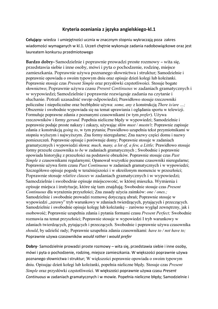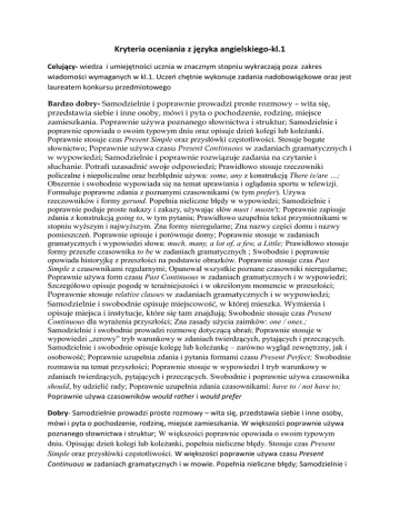 Kryteria oceniania z języka angielskiego-kl.1 Celujący- wiedza i umiejętności ucznia w znacznym stopniu wykraczają poza zakres wiadomości wymaganych w kl.1. Uczeń chętnie wykonuje zadania nadobowiązkowe oraz jest laureatem konkursu przedmiotowego Bardzo dobry- Samodzielnie i poprawnie prowadzi proste rozmowy – wita się, przedstawia siebie i inne osoby, mówi i pyta o pochodzenie, rodzinę, miejsce zamieszkania. Poprawnie używa poznanego słownictwa i struktur; Samodzielnie i poprawnie opowiada o swoim typowym dniu oraz opisuje dzień kolegi lub koleżanki. Poprawnie stosuje czas Present Simple oraz przysłówki częstotliwości. Stosuje bogate słownictwo; Poprawnie używa czasu Present Continuous w zadaniach gramatycznych i w wypowiedzi; Samodzielnie i poprawnie rozwiązuje zadania na czytanie i słuchanie. Potrafi uzasadnić swoje odpowiedzi; Prawidłowo stosuje rzeczowniki policzalne i niepoliczalne oraz bezbłędnie używa: some, any z konstrukcją There is/are …; Obszernie i swobodnie wypowiada się na temat uprawiania i oglądania sportu w telewizji. Formułuje poprawne zdania z poznanymi czasownikami (w tym prefer). Używa rzeczowników i formy gerund. Popełnia nieliczne błędy w wypowiedzi; Samodzielnie i poprawnie podaje proste nakazy i zakazy, używając słów must / mustn't; Poprawnie zapisuje zdania z konstrukcją going to, w tym pytania; Prawidłowo uzupełnia tekst przymiotnikami w stopniu wyższym i najwyższym. Zna formy nieregularne; Zna nazwy części domu i nazwy pomieszczeń. Poprawnie opisuje i porównuje domy; Poprawnie stosuje w zadaniach gramatycznych i wypowiedzi słowa: much, many, a lot of, a few, a Little; Prawidłowo stosuje formy przeszłe czasownika to be w zadaniach gramatycznych ; Swobodnie i poprawnie opowiada historyjkę z przeszłości na podstawie obrazków. Poprawnie stosuje czas Past Simple z czasownikami regularnymi; Opanował wszystkie poznane czasowniki nieregularne; Poprawnie używa form czasu Past Continuous w zadaniach gramatycznych i w wypowiedzi; Szczegółowo opisuje pogodę w teraźniejszości i w określonym momencie w przeszłości; Poprawnie stosuje relative clauses w zadaniach gramatycznych i w wypowiedzi; Samodzielnie i swobodnie opisuje miejscowość, w której mieszka. Wymienia i opisuje miejsca i instytucje, które się tam znajdują; Swobodnie stosuje czas Present Continuous dla wyrażenia przyszłości; Zna zasady użycia zaimków: one / ones.; Samodzielnie i swobodnie prowadzi rozmowę dotyczącą ubrań; Poprawnie stosuje w wypowiedzi „zerowy” tryb warunkowy w zdaniach twierdzących, pytających i przeczących. Samodzielnie i swobodnie opisuje kolegę lub koleżankę – zarówno wygląd zewnętrzny, jak i osobowość; Poprawnie uzupełnia zdania i pytania formami czasu Present Perfect; Swobodnie rozmawia na temat przyszłości; Poprawnie stosuje w wypowiedzi I tryb warunkowy w zdaniach twierdzących, pytających i przeczących. Swobodnie i poprawnie używa czasownika should, by udzielić rady; Poprawnie uzupełnia zdania czasownikami: have to / not have to; Poprawnie używa czasowników would rather i would prefer Dobry- Samodzielnie prowadzi proste rozmowy – wita się, przedstawia siebie i inne osoby, mówi i pyta o pochodzenie, rodzinę, miejsce zamieszkania. W większości poprawnie używa poznanego słownictwa i struktur; W większości poprawnie opowiada o swoim typowym dniu. Opisując dzień kolegi lub koleżanki, popełnia nieliczne błędy. Stosuje czas Present Simple oraz przysłówki częstotliwości. W większości poprawnie używa czasu Present Continuous w zadaniach gramatycznych i w mowie. Popełnia nieliczne błędy; Samodzielnie i poprawnie rozwiązuje zadania na czytanie i słuchanie. W większości poprawnie opisuje czynności czasu wolnego. Popełnia nieliczne błędy językowe. Stosuje poznane słowa łączące. Stosuje w wypowiedzi rzeczowniki policzalne i niepoliczalne, popełnia sporadyczne błędy przy użyciu: some, any w konstrukcji z There is/are .. Obszernie wypowiada się na temat uprawiania i oglądania sportu w telewizji. Formułuje poprawne zdania z poznanymi czasownikami. Używa rzeczowników i formy gerund. Popełnia nieliczne błędy w wypowiedzi. W większości poprawnie podaje proste nakazy i zakazy, używając słów must / mustn't. Poprawnie zapisuje zdania z konstrukcją going to. W większości poprawnie uzupełnia zdania przymiotnikami w stopniu wyższym i najwyższym. Zna formy nieregularne. Zwykle wie, którego stopnia użyć. Zna nazwy części domu i nazwy pomieszczeń. W większości poprawnie opisuje i porównuje domy. Popełnia niewiele błędów w wypowiedzi. Stosuje w zadaniach gramatycznych i wypowiedzi słowa: much, many, a lot of, a few, a little. Popełnia nieliczne błędy. Prawidłowo stosuje formy przeszłe czasownika to be w zadaniach gramatycznych; W większości poprawnie opowiada historyjkę z przeszłości na podstawie obrazków – stosuje czas Past Simple z czasownikami regularnymi; Opanował większość poznanych czasowników nieregularnych. W większości poprawnie używa form czasu Past Continuous w zadaniach gramatycznych i w wypowiedzi W prosty sposób opisuje pogodę w teraźniejszości i w określonym momencie w przeszłości. Zna ogólne zasady użycia who, which, where w zdaniach typu relative clauses; Swobodnie opisuje miejscowość, w której mieszka. Wymienia i opisuje miejsca i instytucje W większości poprawnie stosuje czas Present Continuous dla wyrażenia przyszłości Zna zasady użycia zaimków: one / ones Prowadzi rozmowę dotyczącą ubrań Zna większość wprowadzonych przymiotników opisujących osobowość Poprawnie stosuje „zerowy” tryb warunkowy W większości poprawnie uzupełnia zdania i pytania formami czasu Present Perfect, W większości poprawnie stosuje czasownik will Poprawnie stosuje I tryb warunkowy w zdaniach twierdzących, popełnia sporadyczne błędy w pytaniach W większości poprawnie używa 