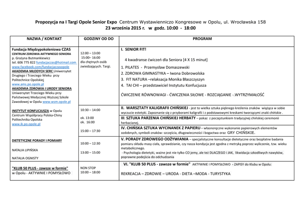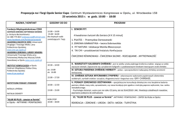 Propozycja na I Targi Opole Senior Expo Centrum Wystawienniczo Kongresowe w Opolu, ul. Wrocławska 158 23 września 2015 r. w godz. 10:00 - 18:00 NAZWA / KONTAKT Fundacja Międzypokoleniowa CZAS CENTRUM ZDROWIA AKTYWNEGO SENIORA p. Grażyna Butmankiewicz tel. 606 775 822 [email protected] www.facebook.com/fundacjaczasopole AKADEMIA MŁODYCH SERC Uniwersytet Drugiego i Trzeciego Wieku przy Politechnice Opolskiej www.ams.po.opole.pl AKADEMIA ZDROWIA I URODY SENIORA Uniwersytet Trzeciego Wieku przy Państwowej Medycznej Wyższej Szkole Zawodowej w Opolu www.wsm.opole.pl INSTYTUT KONFUCJUSZA w Opolu Centrum Współpracy Polska-Chiny Politechnika Opolska www.ik.po.opole.pl GODZINY OD DO 12:00 – 13:00 15:00– 16:00 dla chętnych osób zwiedzających. Targi. NATALIA LIPIŃSKA 10:30 – 14:00 ok. 13:00 ok. 16:00 4 kwadranse ćwiczeń dla Seniora [4 X 15 minut] 1. PILATES - Przemysław Domaszewski 2. ZDROWA GIMNASTYKA – Iwona Dobrowolska 3. FIT NATURA –relaksacja Monika Błaszczyszyn 4. TAI CHI – przedstawiciel Instytutu Konfucjusza II. WARSZTATY KALIGRAFII CHIŃSKIEJ - jest to wielka sztuka pięknego kreślenia znaków wiążąca w sobie wyczucie estetyki. Zapoznanie się z przyborami kaligrafii i z podstawowymi kreskami tworzącymi znaki chińskie . III. SZTUKA PARZENIA CHIŃSKIEJ HERBATY – pokaz z poczęstunkiem tradycyjnej chińskiej ceremonii herbacianej. IV. CHIŃSKA SZTUKA WYCINANEK Z PAPIERU – własnoręczne wykonanie papierowych elementów ozdobnych, symboli-znaków: szczęścia, długowieczności i bogactwa oraz GRY CHIŃSKIE. V. PORADY ZDROWEGO ODŻYWIANIA – specjalistyczne konsultacje dietetyczne oraz bezpłatne badania 10:00 – 12:30 13:00 – 15:00 NATALIA OGNISTY "KLUB 50 PLUS - zawsze w formie" w Opolu - AKTYWNIE I POMYSŁOWO I. SENIOR FIT! ĆWICZENIE RÓWNOWAGI - ĆWICZENIA SIŁOWE - ROZCIĄGANIE -.WYTRZYMAŁOŚĆ 15:00 – 17:30 DIETETYCZNE PORADY I POMIARY PROGRAM NON STOP 10:00 – 18:00 pomiaru składu masy ciała, sprawdzianie, czy nasza kondycja jest zgodna z metryką poprzez wyliczenie, tzw. wieku metabolicznego. - Psychologia dietetyki, ważne jest nie tylko CO jemy, ale też DLACZEGO i JAK, likwidacja szkodliwych nawyków, poprawne podejścia do odchudzania VI. "KLUB 50 PLUS - zawsze w formie" AKTYWNIE I POMYSŁOWO - ZAPISY do Klubu w Opolu: REKREACJA – ZDROWIE – URODA - DIETA –MODA - TURYSTYKA