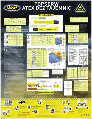 TOPSERW ATEX BEZ TAJEMNIC www.topserw.com.pl Urządzenie Ex OZNACZENIE ATEX I 1180 Znak CE oznacza deklarację producenta o zgodności produktu ze wszystkimi stosownymi Dyrektywami UE M1 II Numer Jednostki Notyfikowanej Specjalny Kategoria Grupa Instytucji Urządzeń Urządzeń odpowiedzialnej znak Ochrony Przeciwwybuchowej (Górnictwo) (Górnictwo) w UE za monitorowanie jakości produktów 1 Grupa Urządzeń (Przemysł) Kategoria Urządzeń (Przemysł) NUMER CERTYFIKATU BADANIA TYPU WE NUMER CERTYFIKATU BADANIA TYPU WE OZNACZENIE ATEX Numer seryjny/partia, zawierający rok produkcji Dodatkowe dopuszczenie, Numer certyfikatu IECEx GD Jednostka notyfikowana odpowiedzialna za Badanie Typu WE (instytucja testująca) Znak przeciwwybuchowości (znak ATEX) Definicja odpowiedniości urządzeń Grupy II do użycia w atmosferach gazowych i/lub pyłowych Rok wydania certyfikatu Certyfikat ATEX JEDNOSTKI NOTYFIKOWANE UE Środki ostrożności, które należy stosować w pracy KOD CERTYFIKACJI KOD CERTYFIKACJI gazy, pary i mgły wybuchowe pyły wybuchowe Specyfikacja części zamiennych Jednostki Notyfikowane są mianowane przez rządy państw WE jako odpowiedzialne za realizowanie wszystkich lub niektórych funkcji określonych w Dyrektywie Urządzeń UE, takich jak kontrola typu WE urządzeń oraz ocena systemu zapewnienia jakości w procesie ich produkcji. OZNACZENIE DLA OCHRONY PRZED ZAPŁONEM PYŁÓW wg EN 61241-0 i EN 61241-1 gazy, pary i mgły zgodnie z EN60079 Ex ia I/IIC T4 Ex (Ta=50°C) GRUPY I KATEGORIE URZĄDZEŃ Górnictwo II 1 2 3 Przemysł Ochrona bardzo wysoka - - Ochrona wysoka - Ochrona G bardzo wysoka - Możliwość pracy w atmosferze Ex Wyłączać w atmosferze Ex Ochrona wysoka G Ochrona normalna G Metan Górnictwo Strefy 0, 1, 2 D I Maksymalna bezpieczna energia iskrzenia Urządzenia iskrobezpieczne Ex ia/ib Strefy 20, 21, 22 IIA Propan IIB Etylen Strefy 21, 22 Strefy 2 D IIC Wodór/Acetylen II Wszystkie gazy Przemysł Strefy 22 Grupa i Kategoria Urządzeń określają obszary, gdzie urządzenie może być bezpiecznie użytkowane. Stosowane koncepcje OZNACZENIE „CE” ORAZ DYREKTYWA 94/9/WE ATEX DOTYCZĄCA URZĄDZEŃ I SYSTEMÓW OCHRONY PRZEZNACZONYCH DO UŻYCIA W PRZESTRZENIACH ZAGROŻONYCH WYBUCHEM. OBOWIĄZUJE W PAŃSTWACH UE. Symbol - Ognioszczelne Ex d Produkty noszące znak „CE”, podlegające określonym obostrzeniom, mogą być sprzedawane w całej UE bez wymogu dopuszczenia przez instytucje regulacyjne poszczególnych państw. Dyrektywy zostały wprowadzone w celu zniesienia sztucznych barier w handlu w obrębie Unii Europejskiej, które wcześniej były tworzone przez normy państw-członków UE, a także w celu wprowadzenia regulacji w zakresie bezpieczeństwa. Nadciśnieniowe Dyrektywa Przestrzeni Zagrożonych Wybuchem 94/9/WE ATEX (Urządzenia) weszła w życie 1 lipca 2003 roku. Tego samego dnia zostały uchylone istniejące wcześniej Dyrektywy dla Atmosfer Wybuchowych i Kopalni Gazowych. Od tej daty tylko urządzenia oznaczone „CE” jako zgodne z Dyrektywą Sprzętową ATEX (oraz wszelkimi odnośnymi Dyrektywami) mogą być sprzedawane na rynkach UE. Ex p Ex q W osłonie olejowej Zgodność produktów z Dyrektywą Urządzeń ATEX, oceniana poprzez spełniania wymagań tej normy, jest sprawdzana dwustopniowo: w fazach projektowania i produkcji. O podwyższonym poziomie bezpieczeństwa Ex e Iskrobezpieczne Ex ia Ex ib Ex ic Procedury kontroli spełniania norm w fazie produkcji zapewniają ciągłe kontrolowanie produktów w procesie produkcji. Zwykle producent powinien posiadać certyfikat ISO 9000 dla systemu zapewnienia jakości oraz spełniać jedną z części Dyrektywy Urządzeń ATEX, aczkolwiek kwestia ta wygląda różnie dla różnych kategorii produktów; urządzenia użytkowane w obszarach o zwiększonym ryzyku będą wymagały stosowania ściślejszej zgodności z normami. Poza Dyrektywą 94/9/WE ATEX (Urządzenia), produkty przeznaczone do użycia w przestrzeniach zagrożonych wybuchem mogą wymagać zgodności z innymi dyrektywami, włącznie z Dyrektywą Kompatybilności Elektromagnetycznej 2004/108/WE (Dyrektywa EMC). Dyrektywa ta dotyczy prawie każdego urządzenia elektrycznego, mogącego generować zakłócenia lub wykazywać nadmierną wrażliwość na zakłócenia. Po stwierdzeniu zgodności z dyrektywami i wydaniu Deklaracji Zgodności WE przez producenta, można stosować na danym produkcie znak „CE” i skierować produkt do sprzedaży na rynek. Pełny tekst Dyrektywy Urządzeń ATEX oraz zalecenia Komisji Europejskiej dotyczące tej Dyrektywy można znaleźć w Internecie, pod adresem: http://ec.europa.eu/enterprise/atex/direct/text94-9-en.pdf DYREKTYWA 99/92/WE ATEX (MIEJSCE PRACY) DOTYCZĄCA MINIMALNYCH WYMAGAŃ DLA POPRAWY BEZPIECZEŃSTWA I OCHRONY ZDROWIA PRACOWNIKÓW ZATRUDNIONYCH W MIEJSCACH NARAŻONYCH NA ZAGROŻENIE WYBUCHEM. OBOWIĄZUJE W PAŃSTWACH UE. Dyrektywa ta obejmuje czynności Grupy i i Grupy II, wykonywane zarówno w instalacjach lądowych, jak i morskich, w obrębie UE, i jej celem jest zapewnienie wyższego stopnia bezpieczeństwa i ochrony zdrowia pracowników w przestrzeniach zagrożonych wybuchem zawierających gazy, pary, mgły i pyły. Wymienia ona obowiązki i środki bezpieczeństwa dla pracowników, wymagające przyjęcia zasad oceny ryzyka w celu zapobiegania wybuchom. Obowiązki te obejmują: • Opracowanie dokumentu ochrony przeciwwybuchowej, oceniającego ryzyko wybuchu, obejmującego: prawdopodobieństwo obecności atmosfer wybuchowych, obecność źródeł zapłonu (włącznie z ładunkami elektrostatycznymi), określenie używanych substancji i stosowanych procesów, definicję konkretnych środków podejmowanych w celu ochrony życia i zdrowia pracowników. • Klasyfikację obszarów z podziałem na strefy i oznaczenie punktów wejścia do tych stref znakami ostrzegawczymi. • Prawidłowe przeszkolenie i nadzór pracowników. • Stosowanie pisemnych instrukcji i pozwoleń na pracę. • Spe