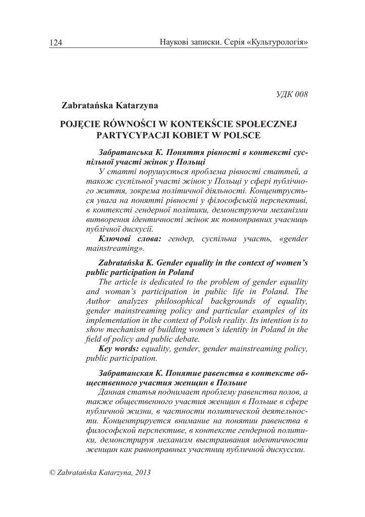 Наукові записки. Серія «Культурологія» 124 Zabratańska Katarzyna УДК 008 Pojęcie równości w kontekście społecznej partycypacji kobiet w Polsce Забратанська К. Поняття рівності в контексті суспільної участі жінок у Польщі У статті порушується проблема рівності статтей, а також суспільної участі жінок у Польщі у сфері публічного життя, зокрема політичної діяльності. Концентрується увага на понятті рівності у філософській перспективі, в контексті гендерної політики, демонструючи механізми витворення ідентичності жінок як повноправних учасниць публічної дискусії. Ключові слова: гендер, суспільна участь, «gender mainstreaming». Zabratańska K. Gender equality in the context of women’s public participation in Poland The article is dedicated to the problem of gender equality and woman’s participation in public life in Poland. The Author analyzes philosophical backgrounds of equality, gender mainstreaming policy and particular examples of its implementation in the context of Polish reality. Its intention is to show mechanism of building women’s identity in Poland in the field of policy and public debate. Key words: equality, gender, gender mainstreaming policy, public participation. Забратанская К. Понятие равенства в контексте общественного участия женщин в Польше Данная статья поднимает проблему равенства полов, а также общественного участия женщин в Польше в сфере публичной жизни, в частности политической деятельности. Концентрируется внимание на понятии равенства в философской перспективе, в контексте гендерной политики, демонстрируя механизм выстраивания идентичности женщин как равноправных участниц публичной дискуссии. © Zabratańska Katarzyna, 2013 Випуск 12 125 Ключевые слова: гендер,общественное участие, gender mainstreaming. «Wszystkie istoty ludzkie rodzą się wolne i równe w godności i prawach. Są one obdarzone rozumem i sumieniem oraz powinny postępować w stosunku do siebie wzajemnie w duchu braterstwa»1. 1. Kategoria równości w perspektywie semantycznej i filozoficznej Pojęcie równości zarówno w perspektywie filozoficznej, jak i aksjonormatywnej generuje gros kontrowersji i polemik. To jakże wzniosłe hasło niesione na ustach Rewolucji Francuskiej znacznie rozszerza swój zakres znaczeniowy i staje się w coraz mniejszym stopniu definiowalne i jednoznaczne. Naturalnym stanem rzeczy jest jego silna etymologiczna asocjacja z rewolucyjną triadą «Wolność-Równość-Braterstwo (fr. Liberté-Égalité-Fraternité). Sięgając po esencjonalne komponenty pojęcia równości można operować następującymi egzemplifikacjami. «Równość w teorii nauki społecznej oznacza identyczność w pewnym określonym aspekcie, np. równość szans lub dochodów, równość wobec prawa2». Równość definiowana jest także jako jednakowość, tożsamość pod względem wielkości, ilości, jakości etc.; równe, jednakowe położenie społeczne ludzi; równość wobec prawa3. W teorii polityki wywoływane pytanie polega na tym czy da się zrealizować ideał równości społecznej, politycznej i gospodarczej, czy też próba stworzenia takiej równości narusza inne wartości np. wolność albo wywiera negatywny wpływ na zbyt liczne gospodarcze i kulturowe czynniki, warunkujące społeczną sprawiedliwość4. Dokonując reinterpretacji tego pojęcia możemy wnioskować, iż rolą równości jest jedynie dzierżenie statusu kryterium definicyjnego czy też indykatywnego dla zoperacjonalizowania pojęcia sprawiedliwości dystrybutywnej (sprawiedliwego podziału)5. 1 Powszechna Deklaracja Praw Człowieka, art. l. W: Prawa człowieka. Dokumenty międzynarodowe, oprac. i przekł. B. Gronowska, T. Jasudowicz, C. Mik. Toruń 1993, s. 20. 2 G. Vesey, P. Foulkes, Słownik encyklopedyczny. Filozofia, Warszawa 1997, s. 287. 3 Nowy słownik języka polskiego PWN, red., E. Sobol, Warszawa 2002, s. 879. 4 S. Blackburn, Oksfordzki słownik filozoficzny. Warszawa 1997, s. 353. 5 S. Konstańczak, Równość jako kategoria filozoficzna, «Słupskie 126 Наукові записки. Серія «Культурологія» Pojęcie równości ma zdecydowanie ewolucyjny i dynamiczny charakter. W epoce antyku funkcjonowały jego dyferencyjne wymiary. Za przykład posłużyć może poniższa kategoryzacja: izotymia – równe znaczenie wszystkich ludzi; izonomia – równość wobec prawa; izogoria – równa wolność słowa i działania politycznego; izokracja – równość mocy politycznej; izopsefia – równe prawo głosu; izopoliteia – równość w prawach obywatelskich; izodaimonia – równość w dostatku i szczęściu; izomoria – równy udział w spółkach wszelkiego rodzaju1 Pojawiająca się konkluzja daje inklinuje wniosek, że egalitaryzacja stanowiła immanentną cechę kultury starożytnej w sferze myśli naukowej, kulturalnej i życia codziennego, choć naturalnie konfrontowano opozycyjne ryty i nurty myśli równościowej2. Abstrahując jednak od tego zróżnicowania można skonstatować, że okres ten zamyka i syntetyzuje refleksja stoicka, która dokonuje ekspozycji sofickiej idei równości naturalnej tzn.