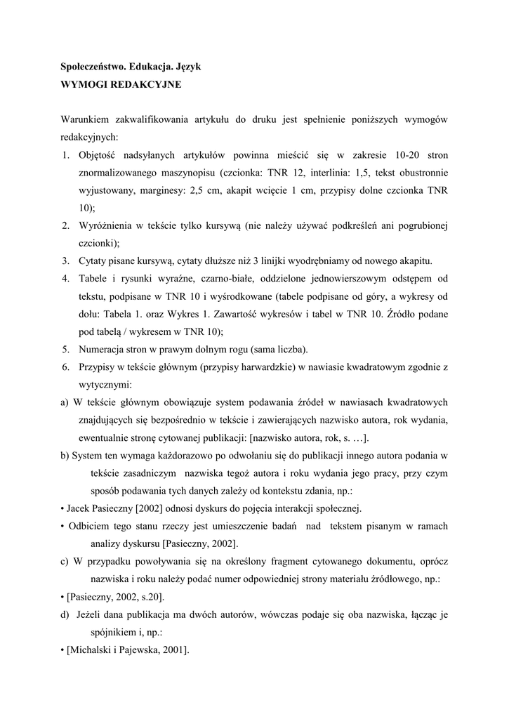 Społeczeństwo. Edukacja. Język WYMOGI REDAKCYJNE Warunkiem zakwalifikowania artykułu do druku jest spełnienie poniższych wymogów redakcyjnych: 1. Objętość nadsyłanych artykułów powinna mieścić się w zakresie 10-20 stron znormalizowanego maszynopisu (czcionka: TNR 12, interlinia: 1,5, tekst obustronnie wyjustowany, marginesy: 2,5 cm, akapit wcięcie 1 cm, przypisy dolne czcionka TNR 10); 2. Wyróżnienia w tekście tylko kursywą (nie należy używać podkreśleń ani pogrubionej czcionki); 3. Cytaty pisane kursywą, cytaty dłuższe niż 3 linijki wyodrębniamy od nowego akapitu. 4. Tabele i rysunki wyraźne, czarno-białe, oddzielone jednowierszowym odstępem od tekstu, podpisane w TNR 10 i wyśrodkowane (tabele podpisane od góry, a wykresy od dołu: Tabela 1. oraz Wykres 1. Zawartość wykresów i tabel w TNR 10. Źródło podane pod tabelą / wykresem w TNR 10); 5. Numeracja stron w prawym dolnym rogu (sama liczba). 6. Przypisy w tekście głównym (przypisy harwardzkie) w nawiasie kwadratowym zgodnie z wytycznymi: a) W tekście głównym obowiązuje system podawania źródeł w nawiasach kwadratowych znajdujących się bezpośrednio w tekście i zawierających nazwisko autora, rok wydania, ewentualnie stronę cytowanej publikacji: [nazwisko autora, rok, s. …]. b) System ten wymaga każdorazowo po odwołaniu się do publikacji innego autora podania w tekście zasadniczym nazwiska tegoż autora i roku wydania jego pracy, przy czym sposób podawania tych danych zależy od kontekstu zdania, np.: • Jacek Pasieczny [2002] odnosi dyskurs do pojęcia interakcji społecznej. • Odbiciem tego stanu rzeczy jest umieszczenie badań nad tekstem pisanym w ramach analizy dyskursu [Pasieczny, 2002]. c) W przypadku powoływania się na określony fragment cytowanego dokumentu, oprócz nazwiska i roku należy podać numer odpowiedniej strony materiału źródłowego, np.: • [Pasieczny, 2002, s.20]. d) Jeżeli dana publikacja ma dwóch autorów, wówczas podaje się oba nazwiska, łącząc je spójnikiem i, np.: • [Michalski i Pajewska, 2001]. e) Podobnie można postąpić w przypadku trzech autorów, np.: • [Malinowski, Nowak i Kowalski, 2001]. Jeżeli autorów jest więcej niż trzech, podaje się tylko pierwszego z nich z dodatkiem skrótu i in. (= i inni) np.: • [Malinowski i in., 2004]. f) Gdy cytuje się kilka publikacji autora opublikowanych w tym samym roku, po dacie należy dodać (bez spacji) kolejne małe litery, np.: • [Nowak, 2000a, 2000b, 2000c]. Oznaczenia te powtarza się wówczas w bibliografii zamieszczonej po tekście głównym. g) Kiedy powołujemy się na pracę zbiorową, należy w tekście zasadniczym podać nazwisko redaktora naukowego publikacji oraz skrót red. w nawiasie, np.: • [Grzywacz i Kowalski (red.), 2015]. W bibliografii szereguje się wówczas taką pozycję według nazwiska redaktora. h) Przyjmuje się również zasadę, że kilka publikacji cytowanych razem (w jednym nawiasie) szereguje się w kolejności chronologicznej, a nie według alfabetu, np.: • [Nowak, 1984; Malinowski, 1986; Kowalski, 2000]. Wyjątek stanowi sytuacja, gdy zachodzi potrzeba powołania się na prace kilku autorów pochodzące z różnych lat. Aby uniknąć konieczności powtarzania w nawiasie tego samego nazwiska z kolejnymi datami, szereguje się prace chronologicznie w obrębie poszczególnych autorów, np.: • [Nowak, 1997, 2000, 2001; Malinowski, 1993, 1998, 2000]. i) Odwołania do stron internetowych powstają na podstawie bibliografii, w której szeregujemy je alfabetycznie, nadając im kolejne skróty z numerem: [www 1] [www 2] [www 3] j) W przypadku odwołania się do aktów prawnych, należy podać początek jego nazwy: [Ustawa o rachunkowości] [Kodeks karny] [Prawo bankowe] [Ustawa o świadczeniach opieki zdrowotnej...] k) W przypadku odwołania się do dokumentów nie posiadających określonego autora należy podać początek jego nazwy: [Uchwała Komisji Krajowej NSZZ Solidarność w sprawie] 7. Bibliografia wykorzystanych źródeł na końcu tekstu przygotowana alfabetycznie według wzoru stylu Chicago (The Chicago Manual of Style) Zapis bibliograficzny książki: Sawicka Katarzyna. 2010. Socjoterapia. Warszawa: Kompendium. Michalski Tomasz, Pajewska Renata. 2001. Ubezpieczenia gospodarcze. Warszawa: Wydawnictwa Szkolne i Pedagogiczne. Zapis bibliograficzny artykułu z pracy zbiorowej: Kotliński Grzegorz. 2012. Dylematy marketingu banków spółdzielczych. W Współczesna bankowość spółdzielcza, red. Anna Szelągowska. Warszawa: CeDeWu. Zapis bibliograficzny artykułu z czasopisma: Kluczyńska Marta, Grzywacz Jacek. 2015. „System finansowania publicznej opieki zdrowotnej w Polsce w świetle doświadczeń niemieckich”. Zeszyty Naukowe PWSZ w Płocku. Nauki Ekonomiczne tom XXII. Zapis bibliograficzny aktu prawnego: Ustawa z dnia 16 września 1982 roku. Prawo spółdzielcze. Dz.U. 2003, nr 188, poz. 1848 z późn. zm. Zapis bibliograficzny strony internetowej: [www 1] http://www.msz.gov.pl (dostęp: 17.02.2012) Zapis bibliograficzny dokumentu, programu itp.: Uchwała Komisji Krajowej NSZZ Solidarność w sprawie strategii związku 9.05.1991 r. 8. Układ tekstu: Imię, nazwisko autora/autorów (pogrubiona czcionka) w lewym górnym rogu TNR 14, od nowego wersu miejsce pracy (bez pogrubienia TNR 12) Tytuł tekstu w języku polskim i angielskim (, czcionka TNR 14 pogrubiona) Streszczenie w języku polskim i angielskim (odpowiednio nagłówki: Streszczenie, Abstract; czcionka TNR 10, objętość maksymalnie 500 znaków) Słowa kluczowe, Keywords (do 7 pojedynczych słów w języku polskim i 7- w j. angielskim) Tekst właściwy (podział na poszczególne sekcje opatrzone standardowymi numerowanymi nagłówkami; tytuły oddzielone jednowierszowym odstępem od tekstu z góry i z dołu, czcionka pogrubiona) Bibliografia (ułożona alfabetycznie nienumerowana) Informacje dla Autorów tekstów przesyłanych do druku: 1. Materiały należy przesy