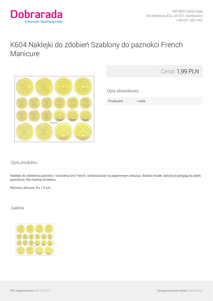 INFOBIS Rafał Głąb Mickiewicza 42a, 43-331 Dankowice +48 601 662 442 K604 Naklejki do zdobień Szablony do paznokci French Manicure Cena: 1,99 PLN Opis słownikowy Producent i-nails Opis produktu Naklejki do zdobienia paznokci i tworzenia linii French. Umieszczone na papierowym arkuszu. Bardzo trwałe, dobrze przylegają do płytki paznokcia. Nie mokną od lakieru. Wymiary arkusza: 9 x 7.5 cm. Galeria Plik wygenerowano: 02-03-2017 Powered by TCPDF (www.tcpdf.org) Oprogramowanie sklepu: AptusShop