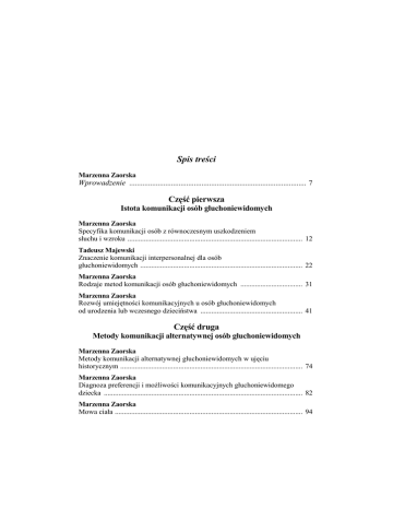 Spis treści Marzenna Zaorska Wprowadzenie ............................................................................................. 7 Część pierwsza Istota komunikacji osób głuchoniewidomych Marzenna Zaorska Specyfika komunikacji osób z równoczesnym uszkodzeniem słuchu i wzroku ................................................................................................ 12 Tadeusz Majewski Znaczenie komunikacji interpersonalnej dla osób głuchoniewidomych ......................................................................................... 22 Marzenna Zaorska Rodzaje metod komunikacji osób głuchoniewidomych .................................. 31 Marzenna Zaorska Rozwój umiejętności komunikacyjnych u osób głuchoniewidomych od urodzenia lub wczesnego dzieciństwa ........................................................ 41 Część druga Metody komunikacji alternatywnej osób głuchoniewidomych Marzenna Zaorska Metody komunikacji alternatywnej głuchoniewidomych w ujęciu historycznym .................................................................................................... 74 Marzenna Zaorska Diagnoza preferencji i moŜliwości komunikacyjnych głuchoniewidomego dziecka ............................................................................................................. 82 Marzenna Zaorska Mowa ciała ....................................................................................................... 94 Marzenna Zaorska System jednoznacznych symboli ................................................................... 101 Anna Maria Florek Narządy artykulacyjne we wczesnym okresie rozwoju i ich rola w procesie komunikacji ................................................................................. 120 Bogdan Szczepankowski Język migowy jako środek porozumiewania się z osobami głuchoniewidomymi z zespołem Ushera ....................................................... 128 Krystyna Klugiewicz, Hanna Rudomska Daktylografia do ręki ..................................................................................... 142 Zofia Krzemkowska Alfabet brajlowski .......................................................................................... 145 Krystyna Klugiewicz, Hanna Rudomska Jednoręczny i dwuręczny brajl do palców ..................................................... 152 Krystyna Klugiewicz, Hanna Rudomska Kreślenie na dłoni liter drukowanych ............................................................ 155 Marzenna Zaorska Alfabet punktowy do dłoni ............................................................................ 157 Joanna Celmer-Domańska Metoda Lorma ................................................................................................ 162 Marzenna Zaorska Metoda Tadoma ............................................................................................. 171 Anna Maria Florek System Komunikacji Obrazkowej PCS ......................................................... 175 Marzenna Zaorska Totalna komunikacja ...................................................................................... 190 Marzenna Zaorska Dobór metody komunikacji dla małego całkowicie głuchoniewidomego dziecka ........................................................................................................... 197 Michał Ostrowski Komputer w procesie komunikacji osób głuchoniewidomych ...................... 202 Wykaz wybranej literatury dostępnej w języku polskim na temat edukacji, rehabilitacji, wspomagania rozwoju osób głuchoniewidomych ............................................................................. 213