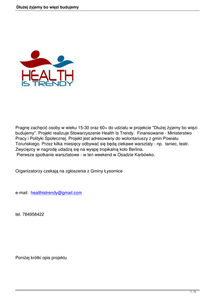 Dłużej żyjemy bo więzi budujemy Pragnę zachęcić osoby w wieku 15-30 oraz 60+ do udziału w projekcie "Dłużej żyjemy bo więzi budujemy". Projekt realizuje Stowarzyszenie Health Is Trendy. Finansowanie - Ministerstwo Pracy i Polityki Społecznej. Projekt jest adresowany do wolontariuszy z gmin Powiatu Toruńskiego. Przez kilka miesięcy odbywać się będą ciekawe warsztaty - np. taniec, teatr. Zwycięzcy w nagrodę udadzą się na wyspę tropikalną koło Berlina. Pierwsze spotkanie warsztatowe - w ten weekend w Osadzie Karbówko. Organizatorzy czekają na zgłoszenia z Gminy Łysomice e-mail: [email protected] tel. 784958422 Poniżej krótki opis projektu 1/5 Dłużej żyjemy bo więzi budujemy Projekt : Dłużej żyjemy bo więzi budujemy Realizator: Stowarzyszenie Health is Trendy Projekt dofinansowany przez Ministerstwo Pracy i Polityki Społecznej Okres realizacji: 20 październik 2012 – 29 czerwiec 2013 Krótka charakterystyka zadania publicznego Celem projektu jest integracja wewnątrz i międzypokoleniowa oraz poprawa jakości i poziomu życia osób starszych oraz zagospodarowanie potencjału osób starszych poprzez aktywność społeczną tych osób. Projekt pozwoli również zagospodarować czas wolny młodych ludzi, wykształci postawy prospołeczne a także zwiększy świadomość zdrowotną. Projekt ma charakter powiatowy, realizowany będzie na obszarze powiatu toruńskiego, działaniami objętych zostanie 9 gmin (Chełmża, Czernikowo, Lubicz, Łubianka, Łysomice, Obrowo, Wielka Nieszawka, Zławieś Wielka) i miasto Chełmża. Pierwszy etap: obejmował będzie stworzenie koalicji na rzecz godnego starzenia się . Zorganizowana zostanie konferencja w której udział wezmą przedstawiciele samorządów terytorialnych, szkół, organizacji seniorskich, domów kultury, trenerzy sportowi. Podczas konferencji omówiona zostanie problematyka starzenia się społeczeństwa oraz przedstawione zostaną założenia projektu. Spotkanie zakończy się podpisaniem listu intencyjnego na rzecz 2/5 Dłużej żyjemy bo więzi budujemy poprawy jakości życia osób starszych. Drugi etap: w gminach przeprowadzony zostanie nabór liderów - wolontariuszy do projektu (6 osób w każdym samorządzie – 3 seniorów + 3 młodzieżowych liderów, razem 54 osoby). Trzeci etap: zorganizowane zostanie 2-dniowe szkolenie liderów, które obejmowało będzie edukację zdrowotną, zajęcia z zakresu komunikacji interpersonalnej, zajęcia aktywności fizycznej, zajęcia teatralne, założenia projektu – cele i ich realizacja. Duży nacisk podczas spotkania położony zostanie na integrację uczestników. Szkolenie zakończy się wręczeniem certyfikatów „Wolontariusza Stowarzyszenia Health is Trendy”. Uczestnicy szkolenia wyposażeni zostaną w identyfikatory, koszulki oraz materiały edukacyjne. Podpisane zostaną porozumienia o wykonywaniu świadczeń wolontarystycznych. Czwarty etap: w każdej gminie wolontariusze przeprowadzą nabór uczestników projektu, zapukają do drzwi osób starszych, samotnych, zachęcą do skorzystania z propozycji zajęć w grupie teatralno-wokalnej i grupie aktywności fizycznej z elementami tańca. Zajęcia w grupach prowadzone będą przez wykwalifikowaną kadrę przez okres od stycznia do 30 maja 2013 r. Reprezentacja każdej gmina zobowiązana będzie do prowadzenia własnego internetowego bloga. Podczas zajęć w grupach młodzi uczestnicy projektu nauczą seniorów obsługi multimediów, seniorzy nauczą młodzież przygotowywania potraw tradycyjnych, korzystnych dla dobrej kondycji zdrowotnej, opiekę merytoryczną sprawowali będą wykwalifikowani trenerzy (dietetycy, informatycy). Grupy w okresie styczeń - maj przygotują się do turnieju o tytuł Gminy/Miasta Przyjaznego Seniorom . Piąty etap: zawody powiatowe w poszczególnych dyscyplinach o tytuł miasta/gminy przyjaznej seniorom. Podczas turnieju poszczególne gminy rywalizują ze sobą w następujących konkurencjach: taniec, zawody sportowe, scenka teatralna o tematyce zdrowotnej, śpiew, przygotowanie potraw tradycyjnych przez młodych uczestników projektu, którzy do konkurencji przygotowani zostaną przez seniorów. Dodatkowe punkty przyznane będą za prowadzony blog internetowy. Dla zwycięskiej drużyny zorganizowana zostanie integracyjna wycieczka do Tropical Island. Przeprowadzony zostanie również konkurs na najsympatyczniejszego wolontariusza. Wartością dodaną projektu będzie „know how”, który będzie mógł być przekazany innym 3/5 Dłużej żyjemy bo więzi budujemy podmiotom. Partnerem Stowarzyszenia Health is Trendy jest Stowarzyszenie CEESTAHC, którego misją jest integracja postępowych środowisk krajów Europy Środkowej i Wschodniej w celu wymiany informacji, przekazywania doświadczeń oraz realizacji wspólnych programów naukowych. Stowarzyszenie dokona oceny realizowanego projektu i zaangażuje się do implementacji projektu w innych środowiskach. Stowarzyszenie CEESTAHC w ramach współpracy z Jednostkami Samorządu Terytorialnego prowadzi działalność edukacyjną skierowaną na doskonalenie jakości tworzenia i realizowania programów zdrowotnych, a co za tym idzie – lepszą alokację środków publicznych. Stowarzyszenie CEESTAHC prowadzi również portal internetowy www.dobreprogramyzdrowotne.pl Zakładane cele realizacji zadania: 1. Integracja wewnątrz i międzypokoleniowa – realizacja wspólnych zadań – osoby starsze przygotowują młodych uczestników projektu do zawodów kulinarnych, młodzież uczy osoby starsze obsługi multimediów, wspólnie prowadzą internetowego bloga, młodzież uczy starszych piosenek współczesnych wykonawców, osoby starsze uczą młodzież piosenek z lat 70 – tych, osoby starsze tańczą hip – hop, młode – walca, tango, organizacja wyjazdów integracyjnych (wspólne szkolenie dla wolontariuszy, integracyjna wycieczka dla uczestników projektu ze zwycięskiej gminy do Tropical Island. 2. Poprawa 