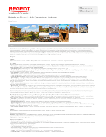 061 851-31-18 [email protected] Majówka we Florencji - 4 dni (samolotem z Krakowa) Włochy Florencja Program Michał Anioł twierdził, iż "Toskania to ogród Italii, a Florencja jest jej kwiatem"! To malownicze miasto przepełnione jest duchem renesansu, śladami wielkiego rodu Medyceuszy, gdzie w powietrzu wyczuwalny jest zapach pobliskich winnic i gajów oliwnych. Za dnia zachwyca zielonymi parkami, zadziwiającymi zabytkami, efektownymi fontannami, a wieczorem pięknie oświetlona oczarowuje malowniczymi zaułkami i eleganckimi ulicami oraz kusi niezliczonymi barami, knajpkami i eleganckimi restauracjami. Warto swój czas poświecić również Pizie – gdzie znajduje się jeden z cudów Świata – Krzywa Wieża. Zapraszamy w piękną podróż w czasie do miasta Leonarda da Vinci, Michała Anioła i Dantego, które na długo pozostanie w sercu. Program: 1 dzień: Odprawa na lotnisku i przelot do Włoch. Przejazd do hotelu. Zakwaterowanie, czas wolny w zależności od godzin przylotu. 2 - 3 dzień: Kolejne dwa dni to czas na poznanie niesamowitej atmosfery stolicy Toskanii, jej najważniejszych miejsc i najsłynniejszych zabytków, takich jak - Plac Duomo – religijne centrum miasta z najsłynniejszymi zabytkami takimi jak Baptysterium San Giovanni, do którego prowadzą „rajskie drzwi” oraz Katedra Santa Maria del Fiore z imponującą kopułą i Dzwonnicą Giotta - Pałac Medyceuszy pochodzący z XV wieku pierwowzór architektury florenckiej ze słynną Kaplicą Trzech Króli - Bazylika San Lorenzo zaprojektowana przez słynnych włoskich architektów: Filippo Brunelleschiego oraz Michała Anioła, który zaprojektował także przepiękny przedsionek Biblioteki Medicea Laurenziana - Plac Republiki z Kolumną Obfitości, usiany kawiarniami i restauracjami, będący miejscem spotkań mieszkańców i turystów - Pałac Strozzi – ostatni i największy pałac renesansowy w mieście - Piazza Santa Trinita – trójkątny plac z Kościołem Świętej Trójcy, kolumną sprawiedliwości i XIV-wiecznymi pałacami - Loggia del Mercato Nuovo – florencki targ, na którym znajduje się posąg dzika, legenda głosi że potarcie jego pyska zapewnia powrót do Florencji - Orsanmichele – przepiękny piętrowy kościół San Michele, na zewnątrz ozdobiony posągami wykonanymi między innymi przez samego Donatello - Piazza della Signoria z Pałacem Vecchio będącym największą budowlą na całym placu, fontanną Neptuna przedstawiającą władcę mórz ciągniętego przez zaprzęg koni morskich, kopią słynnej rzeźby Dawida pierwotnie stworzoną przez Michała Anioła, rzeźbą Herkulesa i Kasus wykonaną przez przyjaciela Leonardo da Vinci - Bandinelliego - Uffizi – jedno z najbardziej znanych muzeów na świecie, którego pomieszczenia ozdobione są dziełami takich znamienitych artystów jak Michał Anioł, Botticelli, Leonardo da Vinci, czy Rafael - Most Vecchio - Most Złotników – najstarszy most we Florencji zabudowany kramikami i warsztatami rzemieślników, łączy w najwęższym miejscu brzegi rzeki Arno - Piazza Santa Croce z Kościołem Świętego Krzyża – miejsce gdzie zostali pochowani m.in. Michał Anioł, Dante Alighieri, Galileusz czy Machiavelli, znajduje się tam także tablica nagrobna ukochanej Juliusza Słowackiego, która zmarła w wieku 22 lat W przerwach podczas zwiedzania proponujemy czas wolny na posiłek, podczas którego będzie możliwość spróbowania lokalnych potraw takich jak tradycyjna focaccia, zupa ribollita, czy klasyczny specjał tego regionu - frittata di carciofi (płatne indywidualnie wg zamówienia). Perła Toskanii oferuje ponadto szeroki wybór dodatkowych atrakcji, możliwych do zrealizowania fakultatywnie w czasie wolnym: - Szpital Niewiniątek - renesansowa budowla, zaprojektowana przez znamienitego florenckiego architekta, który zaprojektował również kopułę w kościele Santa Maria del Fiore, dawniej był przytułkiem dla porzuconych dzieci, a obecnie znajduje się tam galeria sztuki renesansowej (ok. 9 euro/os.) - Pałac Pitti – przepełniony sztuką Tycjana, Rafaela, Tintoretta, zachwyca zarówno wnętrzem jak i ogrodami, jest także największym kompleksem muzealnym we Florencji (ok. 8-10 euro/os.) - Bazylika Santo Spirito z 38 ołtarzami zdobionymi XV-wiecznymi obrazami i rzeźbami słynnych florenckich artystów - Ogród Botaniczny przepełniony ogromem różnorodnych gatunków roślin zarówno tych toskańskich, jak i egzotycznych (ok. 5 euro/os.) - Palazzo del Bargello – dawne miejsce prefektury i więzienie, które obecnie jest Muzeum Narodowym, w którym goszczą dzieła m.in. Michała Anioła Bonarottiego, Donatella, czy Filippo Brunelleschiego (ok. 5 euro/os.) - Dom Dantego Alighieri - miejsce, w którym urodził się i wychował „ojciec języka włoskiego” oraz twórca dzieła literackiego „Boska Komedia” (ok. 5 euro/os.) 4 dzień: Wymeldowanie z hotelu, czas wolny w zależności od godzin wylotu, transfer na lotnisko, przelot do Polski. Zakwaterowanie podstawowe: Hotele 3* - położone w pobliżu środków komunikacji miejskiej, w odległości kilku przystanków od największych atrakcji Florencji. Wszystkie hotele oferują wygodnie urządzone pokoje 2 osobowe (z możliwością 1 dostawki) z łazienkami, TV i telefonem. Wyżywienie - śniadania kontynentalne Informacje dodatkowe: - Spotkanie z pilotem nastąpi na lotnisku w Polsce lub po przylocie we Florencji. - Transfery z/na lotnisko są realizowane busem/autokarem lub komunikacją miejską i/lub podmiejską w zależności od wielkości grupy, natomiast przejazdy podczas zwiedzania komunikacją miejską i/lub podmiejską. - Kolejność dni zwiedzania może ulec zmianie. - Pilot nie oprowadza wewnątrz obiektów. - W przypadku wylotu w godzinach porannych zamiast śniadania może być wydany pakiet śniadaniowy. - Linia lotnicza i godziny przelotów mogą ulec zmianie. - „Single” - bez dopłaty, przy dokwaterowaniu do pokoju 2 lub 3 osobowego 