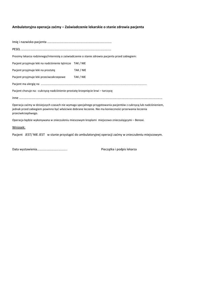 Ambulatoryjna operacja zaćmy – Zaświadczenie lekarskie o stanie zdrowia pacjenta Imię i nazwisko pacjenta ……………………………………………………………………… PESEL ………………………………………………………………………………………………….. Prosimy lekarza rodzinnego/internistę o zaświadczenie o stanie zdrowia pacjenta przed zabiegiem: Pacjent przyjmuje leki na nadciśnienie tętnicze TAK / NIE Pacjent przyjmuje leki na prostatę TAK / NIE Pacjent przyjmuje leki przeciwzakrzepowe TAK / NIE Pacjent ma alergię na …………………………………………………………………………………………………………………………………. Pacjent choruje na: -cukrzycę-nadciśnienie-prostatę-krzepnięcie krwi – tarczycę inne ……………………………………………………………………………………………………………………………………………………………… Operacja zaćmy w dzisiejszych czasach nie wymaga specjalnego przygotowania pacjentów z cukrzycą lub nadciśnieniem, jednak przed zabiegiem powinno być właściwie dobrane leczenie. Nie ma konieczności przerwania leczenia przeciwkrzepliwego. Operacja będzie wykonywana w znieczuleniu miescowym kroplami miejscowo znieczulającymi – Benoxi. Wniosek: Pacjent JEST/ NIE JEST w stanie przystąpić do ambulatoryjnej operacji zaćmy w znieczuleniu miejscowym. Data wystawienia……………………………….. Pieczątka i podpis lekarza