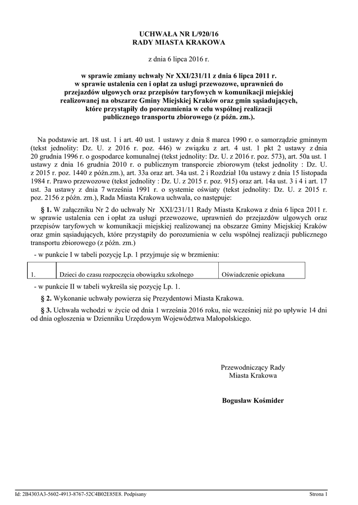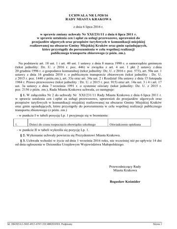 UCHWAŁA NR L/920/16 RADY MIASTA KRAKOWA z dnia 6 lipca 2016 r. w sprawie zmiany uchwały Nr XXI/231/11 z dnia 6 lipca 2011 r. w sprawie ustalenia cen i opłat za usługi przewozowe, uprawnień do przejazdów ulgowych oraz przepisów taryfowych w komunikacji miejskiej realizowanej na obszarze Gminy Miejskiej Kraków oraz gmin sąsiadujących, które przystąpiły do porozumienia w celu wspólnej realizacji publicznego transportu zbiorowego (z późn. zm.). Na podstawie art. 18 ust. 1 i art. 40 ust. 1 ustawy z dnia 8 marca 1990 r. o samorządzie gminnym (tekst jednolity: Dz. U. z 2016 r. poz. 446) w związku z art. 4 ust. 1 pkt 2 ustawy z dnia 20 grudnia 1996 r. o gospodarce komunalnej (tekst jednolity: Dz. U. z 2016 r. poz. 573), art. 50a ust. 1 ustawy z dnia 16 grudnia 2010 r. o publicznym transporcie zbiorowym (tekst jednolity : Dz. U. z 2015 r. poz. 1440 z późn.zm.), art. 33a oraz art. 34a ust. 2 i Rozdział 10a ustawy z dnia 15 listopada 1984 r. Prawo przewozowe (tekst jednolity : Dz. U. z 2015 r. poz. 915) oraz art. 14a ust. 3 i 4 i art. 17 ust. 3a ustawy z dnia 7 września 1991 r. o systemie oświaty (tekst jednolity: Dz. U. z 2015 r. poz. 2156 z późn. zm.), Rada Miasta Krakowa uchwala, co następuje: § 1. W załączniku Nr 2 do uchwały Nr XXI/231/11 Rady Miasta Krakowa z dnia 6 lipca 2011 r. w sprawie ustalenia cen i opłat za usługi przewozowe, uprawnień do przejazdów ulgowych oraz przepisów taryfowych w komunikacji miejskiej realizowanej na obszarze Gminy Miejskiej Kraków oraz gmin sąsiadujących, które przystąpiły do porozumienia w celu wspólnej realizacji publicznego transportu zbiorowego (z późn. zm.) - w punkcie I w tabeli pozycję Lp. 1 przyjmuje się w brzmieniu: 1. Dzieci do czasu rozpoczęcia obowiązku szkolnego Oświadczenie opiekuna - w punkcie II w tabeli wykreśla się pozycję Lp. 1. § 2. Wykonanie uchwały powierza się Prezydentowi Miasta Krakowa. § 3. Uchwała wchodzi w życie od dnia 1 września 2016 roku, nie wcześniej niż po upływie 14 dni od dnia ogłoszenia w Dzienniku Urzędowym Województwa Małopolskiego. Przewodniczący Rady Miasta Krakowa Bogusław Kośmider Id: 2B4303A3-5602-4913-8767-52C4B02E85E8. Podpisany Strona 1