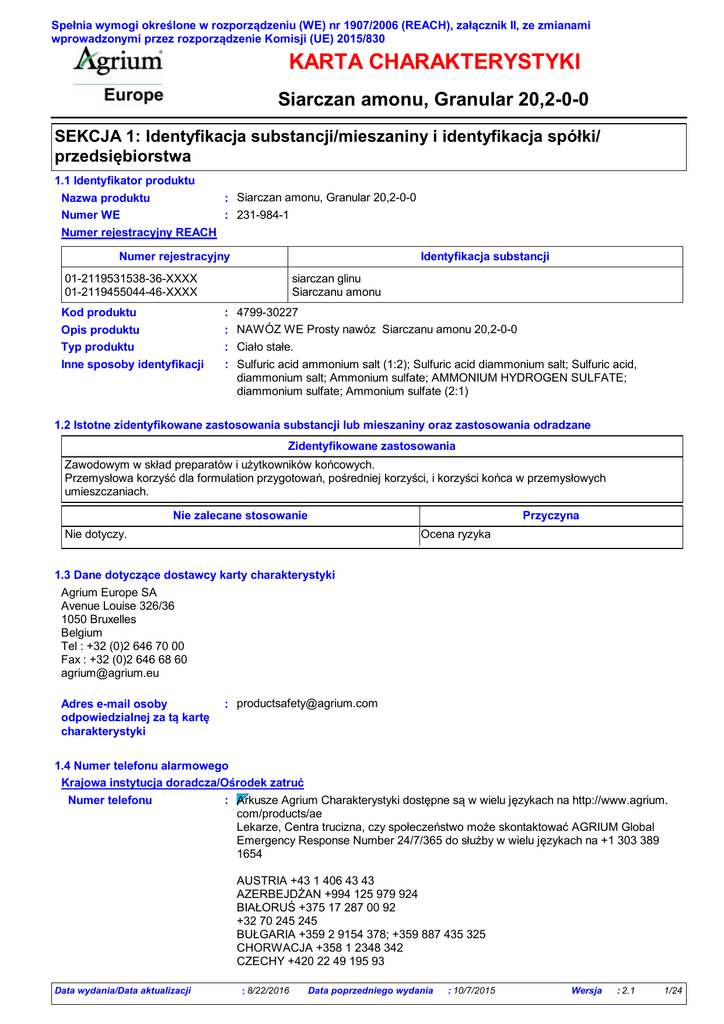 Spełnia wymogi określone w rozporządzeniu (WE) nr 1907/2006 (REACH), załącznik II, ze zmianami wprowadzonymi przez rozporządzenie Komisji (UE) 2015/830 KARTA CHARAKTERYSTYKI Siarczan amonu, Granular 20,2-0-0 SEKCJA 1: Identyfikacja substancji/mieszaniny i identyfikacja spółki/ przedsiębiorstwa 1.1 Identyfikator produktu Nazwa produktu : Siarczan amonu, Granular 20,2-0-0 Numer WE : 231-984-1 Numer rejestracyjny REACH Numer rejestracyjny Identyfikacja substancji 01-2119531538-36-XXXX 01-2119455044-46-XXXX Kod produktu Opis produktu Typ produktu Inne sposoby identyfikacji siarczan glinu Siarczanu amonu : 4799-30227 : NAWÓZ WE Prosty nawóz Siarczanu amonu 20,2-0-0 : Ciało stałe. : Sulfuric acid ammonium salt (1:2); Sulfuric acid diammonium salt; Sulfuric acid, diammonium salt; Ammonium sulfate; AMMONIUM HYDROGEN SULFATE; diammonium sulfate; Ammonium sulfate (2:1) 1.2 Istotne zidentyfikowane zastosowania substancji lub mieszaniny oraz zastosowania odradzane Zidentyfikowane zastosowania Zawodowym w skład preparatów i użytkowników końcowych. Przemysłowa korzyść dla formulation przygotowań, pośredniej korzyści, i korzyści końca w przemysłowych umieszczaniach. Nie zalecane stosowanie Przyczyna Nie dotyczy. Ocena ryzyka 1.3 Dane dotyczące dostawcy karty charakterystyki Agrium Europe SA Avenue Louise 326/36 1050 Bruxelles Belgium Tel : +32 (0)2 646 70 00 Fax : +32 (0)2 646 68 60 [email protected] Adres e-mail osoby odpowiedzialnej za tą kartę charakterystyki : [email protected] 1.4 Numer telefonu alarmowego Krajowa instytucja doradcza/Ośrodek zatruć Numer telefonu : Arkusze Agrium Charakterystyki dostępne są w wielu językach na http://www.agrium. com/products/ae Lekarze, Centra trucizna, czy społeczeństwo może skontaktować AGRIUM Global Emergency Response Number 24/7/365 do służby w wielu językach na +1 303 389 1654 AUSTRIA +43 1 406 43 43 AZERBEJDŻAN +994 125 979 924 BIAŁORUŚ +375 17 287 00 92 +32 70 245 245 BUŁGARIA +359 2 9154 378; +359 887 435 325 CHORWACJA +358 1 2348 342 CZECHY +420 22 49 195 93 Data wydania/Data aktualizacji : 8/22/2016 Data poprzedniego wydania : 10/7/2015 Wersja : 2.1 1/24 Spełnia wymogi określone w rozporządzeniu (WE) nr 1907/2006 (REACH), załącznik II, ze zmianami wprowadzonymi przez rozporządzenie Komisji (UE) 2015/830 Siarczan amonu, Granular 20,2-0-0 SEKCJA 1: Identyfikacja substancji/mieszaniny i identyfikacja spółki/ przedsiębiorstwa DANIA +45 82 12 12 12 ESTONIA 16662; +372 62 69 379 FINLANDIA +358 9 471977 FRANCJA Angers +33 (0) 2 41 48 21 21 Bordeaux +33 (0) 5 56 96 40 80 Lille 0800 59 59 59 (dzwoniący krajowe) Lyon +33 (0) 4 72 11 69 11 Marseille +33 (0) 4 91 75 25 25 Nancy +33 (0) 3 83 22 50 50 Paris +33 (0) 1 40 05 48 48 Rennes +33 (0) 2 99 59 22 22 Strasbourg +33 (0) 3 88 37 37 37 Toulouse +33 (0) 5 61 77 74 47 GRUZJA +995 99 53 33 20 NIEMCY Berlin +49 30 192 40 Bonn +49 228 192 40 Erfurt +49 361 730 730 Freiburg +49 761 192 40 Goettingen +49 551 192 40 Homburg (Saar) +49 6841 192 40 Mainz +49 6131 192 40 Monachium +49 89 192 40 GRECJA +30 21 07 79 37 77 WĘGRY +36 80 20 11 99 ISLANDIA +354 543 22 22 IRLANDIA +353 1 837 9964 (lekarzy) +353 1 809 2166 (publiczne) IZRAEL +972 4 854 19 00 WŁOCHY Bergamo +39 800 883 300 Firenze +39 55 794 7819 Foggia +39 881 732 326 Genua +39 10 563 62 45 Milan +39 02 6610 1029 Padova +39 49 827 50 78 Pawia +39 38 224 444 Rzym +39 06 305 43 43 Turyn +39 011 663 7637 KAZACHSTAN +7 3272 925 868 LITWA +370 5 236 20 52; +370 687 533 78 HOLANDIA +31 30 274 88 88 NORWEGIA +47 22 59 13 00 POLSKA Gdańsk +48 58 682 04 04 Kraków +48 12 411 99 99 ŁÓDŹ +48 42 63 14 724 Sosnowiec +48 32 266 11 45 Warszawa +48 22 619 66 54 Wrocław +48 71 343 30 08 PORTUGALIA 808 250 143 (dzwoniący krajowe) RUMUNIA +402 212 106 282 FEDERACJA ROSYJSKA Jekaterynburg +7 343 229 98 57 Moskwa +7 495 628 1687 Saint-Petersburg +7 921 757 3228 SERBIA +381 11 3608 440 SŁOWACJA +421 2 5477 4166 SŁOWENIA +386 41 635 500 HISZPANIA +34 91 562 0420 SZWECJA 112 (dzwoniący krajowe); +46 (0) 10 456 6700 SZWAJCARIA +41 44 251 51 51 (w Szwajcarii numerem 145) Byłej Jugosławii +38 923 147 635 TURCJA +90 0312 433 70 01 lub 0 800 314 7900 Data wydania/Data aktualizacji : 8/22/2016 Data poprzedniego wydania : 10/7/2015 Wersja : 2.1 2/24 Spełnia wymogi określone w rozporządzeniu (WE) nr 1907/2006 (REACH), załącznik II, ze zmianami wprowadzonymi przez rozporządzenie Komisji (UE) 2015/830 Siarczan amonu, Granular 20,2-0-0 SEKCJA 1: Identyfikacja substancji/mieszaniny i identyfikacja spółki/ przedsiębiorstwa ZJEDNOCZONE KRÓLESTWO Belfast 844 892 0111 Birmingham 844 892 0111 Edynburg 844 892 0111 Newcastle Upon Tyne +44 191 2606182; +44 191 2606180 Penarth 844 892 0111 Dostawca Numer telefonu Godziny pracy : Agrium Europe SA PRZECIWAWARYJNY TELEFON LICZBY: Przewóz: 00-1-303-389-1654 Medyczny: 00-1-303-389-1654 : 24/7/365 SEKCJA 2: Identyfikacja zagrożeń 2.1 Klasyfikacja substancji lub mieszaniny Definicja produktu : Substancja jednoskładnikowa Klasyfikacja według rozporządzenia (EC) Nr 1272/2008 [CLP/GHS] Eye Irrit. 2, H319 Produkt został sklasyfikowany jako niebezpieczny według rozporządzenia (WE) 1272/2008 ze zmianami. 2.2 Elementy oznakowania Piktogramy zagrożeń Hasło ostrzegawcze Zwroty wskazujące rodzaj zagrożenia : : Uwaga : H319 Działa drażniąco na oczy. Zwroty wskazujące środki ostrożności Zapobieganie : P280.6 Nosić okulary ochronne lub ochronę twarzy. P264 Umyć dokładnie ręce po użyciu. Reagowanie : P305+P351+P338 Ostrożnie płukać wodą przez kilka minut. Wyjąć soczewki kontaktowe, jeżeli są i można je łatwo usunąć. Nadal płukać. P337 + P313 W przypadku utrzymywania się działania drażniącego na oczy: Zasięgnąć porady/zgłosić się pod opiekę lekarza. Przechowywanie : Nie dotyczy. Usuwanie : Nie dotyczy. Niebezpieczne składniki : Siarczanu amonu Specjalne wymagania dotyczące pakowania : Nie dotyczy. Pojemniki powinny być wyposażone w zamknięcia unie