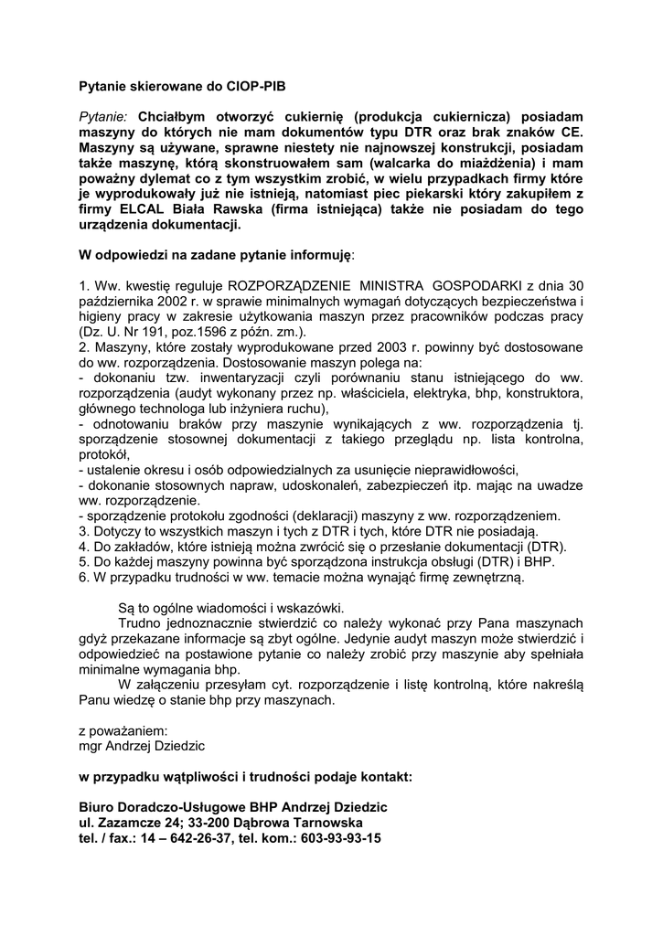 Pytanie skierowane do CIOP-PIB Pytanie: Chciałbym otworzyć cukiernię (produkcja cukiernicza) posiadam maszyny do których nie mam dokumentów typu DTR oraz brak znaków CE. Maszyny są używane, sprawne niestety nie najnowszej konstrukcji, posiadam także maszynę, którą skonstruowałem sam (walcarka do miażdżenia) i mam poważny dylemat co z tym wszystkim zrobić, w wielu przypadkach firmy które je wyprodukowały już nie istnieją, natomiast piec piekarski który zakupiłem z firmy ELCAL Biała Rawska (firma istniejąca) także nie posiadam do tego urządzenia dokumentacji. W odpowiedzi na zadane pytanie informuję: 1. Ww. kwestię reguluje ROZPORZĄDZENIE MINISTRA GOSPODARKI z dnia 30 października 2002 r. w sprawie minimalnych wymagań dotyczących bezpieczeństwa i higieny pracy w zakresie użytkowania maszyn przez pracowników podczas pracy (Dz. U. Nr 191, poz.1596 z późn. zm.). 2. Maszyny, które zostały wyprodukowane przed 2003 r. powinny być dostosowane do ww. rozporządzenia. Dostosowanie maszyn polega na: - dokonaniu tzw. inwentaryzacji czyli porównaniu stanu istniejącego do ww. rozporządzenia (audyt wykonany przez np. właściciela, elektryka, bhp, konstruktora, głównego technologa lub inżyniera ruchu), - odnotowaniu braków przy maszynie wynikających z ww. rozporządzenia tj. sporządzenie stosownej dokumentacji z takiego przeglądu np. lista kontrolna, protokół, - ustalenie okresu i osób odpowiedzialnych za usunięcie nieprawidłowości, - dokonanie stosownych napraw, udoskonaleń, zabezpieczeń itp. mając na uwadze ww. rozporządzenie. - sporządzenie protokołu zgodności (deklaracji) maszyny z ww. rozporządzeniem. 3. Dotyczy to wszystkich maszyn i tych z DTR i tych, które DTR nie posiadają. 4. Do zakładów, które istnieją można zwrócić się o przesłanie dokumentacji (DTR). 5. Do każdej maszyny powinna być sporządzona instrukcja obsługi (DTR) i BHP. 6. W przypadku trudności w ww. temacie można wynająć firmę zewnętrzną. Są to ogólne wiadomości i wskazówki. Trudno jednoznacznie stwierdzić co należy wykonać przy Pana maszynach gdyż przekazane informacje są zbyt ogólne. Jedynie audyt maszyn może stwierdzić i odpowiedzieć na postawione pytanie co należy zrobić przy maszynie aby spełniała minimalne wymagania bhp. W załączeniu przesyłam cyt. rozporządzenie i listę kontrolną, które nakreślą Panu wiedzę o stanie bhp przy maszynach. z poważaniem: mgr Andrzej Dziedzic w przypadku wątpliwości i trudności podaje kontakt: Biuro Doradczo-Usługowe BHP Andrzej Dziedzic ul. Zazamcze 24; 33-200 Dąbrowa Tarnowska tel. / fax.: 14 – 642-26-37, tel. kom.: 603-93-93-15 e-mail: [email protected] www: www.bhpdziedzic.pl