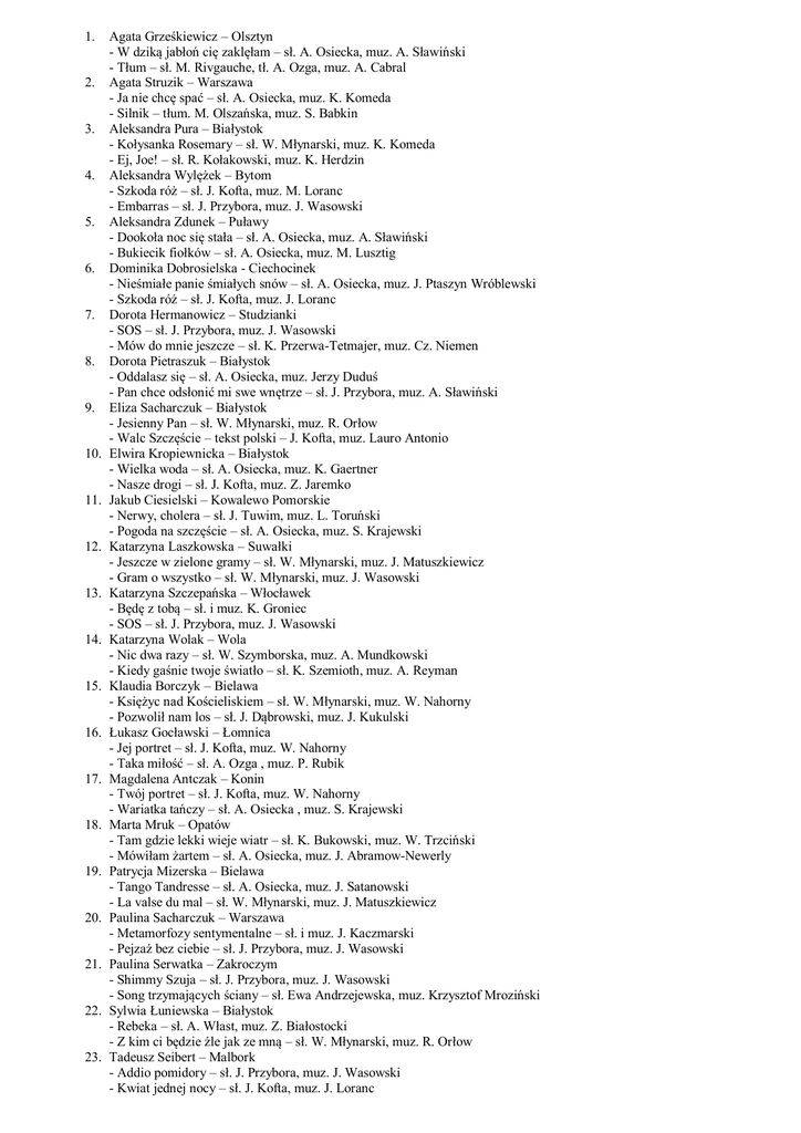 1. 2. 3. 4. 5. 6. 7. 8. 9. 10. 11. 12. 13. 14. 15. 16. 17. 18. 19. 20. 21. 22. 23. Agata Grześkiewicz – Olsztyn - W dziką jabłoń cię zaklęłam – sł. A. Osiecka, muz. A. Sławiński - Tłum – sł. M. Rivgauche, tł. A. Ozga, muz. A. Cabral Agata Struzik – Warszawa - Ja nie chcę spać – sł. A. Osiecka, muz. K. Komeda - Silnik – tłum. M. Olszańska, muz. S. Babkin Aleksandra Pura – Białystok - Kołysanka Rosemary – sł. W. Młynarski, muz. K. Komeda - Ej, Joe! – sł. R. Kołakowski, muz. K. Herdzin Aleksandra Wylężek – Bytom - Szkoda róż – sł. J. Kofta, muz. M. Loranc - Embarras – sł. J. Przybora, muz. J. Wasowski Aleksandra Zdunek – Puławy - Dookoła noc się stała – sł. A. Osiecka, muz. A. Sławiński - Bukiecik fiołków – sł. A. Osiecka, muz. M. Lusztig Dominika Dobrosielska - Ciechocinek - Nieśmiałe panie śmiałych snów – sł. A. Osiecka, muz. J. Ptaszyn Wróblewski - Szkoda róż – sł. J. Kofta, muz. J. Loranc Dorota Hermanowicz – Studzianki - SOS – sł. J. Przybora, muz. J. Wasowski - Mów do mnie jeszcze – sł. K. Przerwa-Tetmajer, muz. Cz. Niemen Dorota Pietraszuk – Białystok - Oddalasz się – sł. A. Osiecka, muz. Jerzy Duduś - Pan chce odsłonić mi swe wnętrze – sł. J. Przybora, muz. A. Sławiński Eliza Sacharczuk – Białystok - Jesienny Pan – sł. W. Młynarski, muz. R. Orłow - Walc Szczęście – tekst polski – J. Kofta, muz. Lauro Antonio Elwira Kropiewnicka – Białystok - Wielka woda – sł. A. Osiecka, muz. K. Gaertner - Nasze drogi – sł. J. Kofta, muz. Z. Jaremko Jakub Ciesielski – Kowalewo Pomorskie - Nerwy, cholera – sł. J. Tuwim, muz. L. Toruński - Pogoda na szczęście – sł. A. Osiecka, muz. S. Krajewski Katarzyna Laszkowska – Suwałki - Jeszcze w zielone gramy – sł. W. Młynarski, muz. J. Matuszkiewicz - Gram o wszystko – sł. W. Młynarski, muz. J. Wasowski Katarzyna Szczepańska – Włocławek - Będę z tobą – sł. i muz. K. Groniec - SOS – sł. J. Przybora, muz. J. Wasowski Katarzyna Wolak – Wola - Nic dwa razy – sł. W. Szymborska, muz. A. Mundkowski - Kiedy gaśnie twoje światło – sł. K. Szemioth, muz. A. Reyman Klaudia Borczyk – Bielawa - Księżyc nad Kościeliskiem – sł. W. Młynarski, muz. W. Nahorny - Pozwolił nam los – sł. J. Dąbrowski, muz. J. Kukulski Łukasz Gocławski – Łomnica - Jej portret – sł. J. Kofta, muz. W. Nahorny - Taka miłość – sł. A. Ozga , muz. P. Rubik Magdalena Antczak – Konin - Twój portret – sł. J. Kofta, muz. W. Nahorny - Wariatka tańczy – sł. A. Osiecka , muz. S. Krajewski Marta Mruk – Opatów - Tam gdzie lekki wieje wiatr – sł. K. Bukowski, muz. W. Trzciński - Mówiłam żartem – sł. A. Osiecka, muz. J. Abramow-Newerly Patrycja Mizerska – Bielawa - Tango Tandresse – sł. A. Osiecka, muz. J. Satanowski - La valse du mal – sł. W. Młynarski, muz. J. Matuszkiewicz Paulina Sacharczuk – Warszawa - Metamorfozy sentymentalne – sł. i muz. J. Kaczmarski - Pejzaż bez ciebie – sł. J. Przybora, muz. J. Wasowski Paulina Serwatka – Zakroczym - Shimmy Szuja – sł. J. Przybora, muz. J. Wasowski - Song trzymających ściany – sł. Ewa Andrzejewska, muz. Krzysztof Mroziński Sylwia Łuniewska – Białystok - Rebeka – sł. A. Włast, muz. Z. Białostocki - Z kim ci będzie źle jak ze mną – sł. W. Młynarski, muz. R. Orłow Tadeusz Seibert – Malbork - Addio pomidory – sł. J. Przybora, muz. J. Wasowski - Kwiat jednej nocy – sł. J. Kofta, muz. J. Loranc