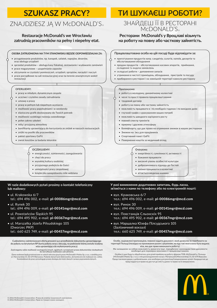 SZUKASZ PRACY? ZNAJDZIESZ JĄ W McDONALD’S ТИ ШУКАЄШ РОБОТИ? ® ЗНАЙДЕШ ЇЇ В РЕСТОРАНІ McDONALD’S ® Restauracje McDonald’s we Wrocławiu zatrudnią pracowników na pełny i niepełny etat. Ресторани McDonald’s у Вроцлаві візьмуть на роботу на повну або часткову зайнятість. OSOBA ZATRUDNIONA NA TYM STANOWISKU BĘDZIE ODPOWIEDZIALNA ZA: Працевлаштована особа на цій посаді буде відповідати за: • przygotowanie produktów, np. kanapek, sałatek, napojów, deserów, oraz obsługa urządzeń • приготування продуктів напр. сандвічів, салатів, напоїв, десертів та обслуговування обладнання • sprzedaż produktów – obsługa kasy fiskalnej, zestawianie i wydawanie zamówień • продаж продуктів – обслуговування касових апаратів, приймання, складення та видача замовлень • prace magazynowe – uzupełnianie zapasów • utrzymanie w czystości pomieszczeń, urządzeń, sprzętów, narzędzi i naczyń • складські роботи – доповнення запасів • prace porządkowe na sali restauracyjnej oraz na terenie zewnętrznym wokół restauracji • прибирання в ресторані і на зовнішній території навколо ресторану • утримання в чистоті приміщень, обладнання, пристроїв та посуду OFERUJEMY: Пропонуємо: • pracę w młodym, dynamicznym zespole • роботу в молодому, динамічному колективі • uczciwe i czytelne zasady zatrudniania • чесні та прості правила працевлаштування • umowę o pracę • трудовий договір • pracę w pełnym lub niepełnym wymiarze • роботу на повну або часткову зайнятість • możliwość pracy popołudniami i w weekendy • можливість працювати в післяобідніх годинах і по вихідних днях • elastyczny grafik dostosowany do Twoich potrzeb • гнучкий графік з урахуванням ваших потреб • możliwość szybkiego rozwoju zawodowego • можливість швидкого кар’єрного росту • pełen zakres szkoleń • повний спектр тренінгів • miłą i przyjazną atmosferę • приємну і дружню атмосферу • bonifikartę uprawniającą do korzystania ze zniżek w naszych restauracjach • Бонифікарту, що дає право на отримання знижок в наших ресторанах • zniżki na posiłki dla pracowników • Знижки на їжу для працівників • pakiet sportowy GoFit • Спортивний пакет GoFit • zwrot kosztów za badania lekarskie • Повернення коштів за медичний огляд OCZEKUJEMY: Очікуємо: • energiczności, sumienności, zaangażowania • енергійності, сумлінності, активності • chęci do pracy • бажання працювати • wysokiej kultury osobistej • високий рівень особистої культури • przyjaznego podejścia do Gości • доброзичливого підходу до Гостей • umiejętności pracy zespołowej • вміння працювати в колективі • książeczka sanepidowska mile widziana • вітається медична книжка W razie dodatkowych pytań prosimy o kontakt telefoniczny lub mailowy: У разі виникнення додаткових запитань, будь ласка, зв’яжіться з нами по телефону або по електронній пошті: • ul. Krakowska 6/7 tel.: 694 496 002, e-mail: [email protected] • в ул. Краковська 6/7 тел.: 694 496 002, e-mail: [email protected] • ul. Rynek 30 tel.: 694 496 009, e-mail: [email protected] • в ул. Ринок 30 тел.: 694 496 009, e-mail: [email protected] • ul. Powstańców Śląskich 95 tel.: 694 495 902, e-mail: [email protected] • в ул. Повстанців Сльонскіх 95 тел.: 694 495 902, e-mail: [email protected] • ul. Marszałka Józefa Piłsudskiego 105 (Dworzec PKP) tel.: 660 625 749, e-mail: [email protected] • в ул. Маршалка Юзефа Пілсудського 105 (Залізничний вокзал) тел.: 660 625 749, e-mail: [email protected] Cudzoziemcy zainteresowani ofertą proszeni są o przedłożenie dokumentu uprawniającego do pobytu na terytorium RP (karta pobytu wraz z decyzją, na podstawie której została wydana; wiza uprawniająca do wykonywania pracy). Zastrzegamy sobie możliwość wymagania innych, zgodnych z przepisami prawa dokumentów niezbędnych do weryfikacji możliwości zatrudnienia. Dane osobowe będą przetwarzane w celach rekrutacyjnych przez McDonald’s Polska Sp. z o.o. z siedzibą przy ul. Marynarskiej 15, 02-674 Warszawa. Podanie danych jest dobrowolne, ale konieczne do realizacji ww. celów. Kandydatowi do pracy przysługuje prawo dostępu do treści danych i prawo poprawiania danych. © 2016 McDonald’s Corporation. Prawa do znaków towarowych zastrzeżone. © 2016 McDonald’s Corporation. Прав на товарні знаки захищені. Особи, зацікавлені пропозицією, повинні надати документ, який дозволяє їм перебувати на території Польщі (посвідка на проживання разом з рішенням, на підставі якого вона була видана; віза, яка дає пр