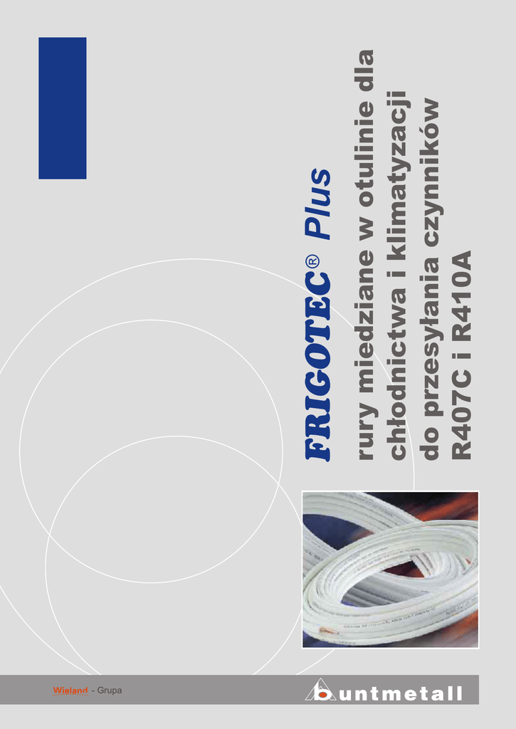- Grupa rury miedziane w otulinie dla chłodnictwa i klimatyzacji do przesyłania czynników R407C i R410A FRIGOTEC ® Plus FRIGOTEC ® Plus rury miedziane w otulinie dla chłodnictwa i klimatyzacji do przesyłania czynników R407C i R410A Własności rury FRIGOTEC® - rura miedziana, zgodna z normą EN 12735-1, ASTM B280, z miedzi odtlenionej fosforem Cu-DHP, stan miękki FRIGOTEC® - to rura z czystą i suchą powierzchnią wewnętrzną wg normy EN 12735-1 Znakowanie rur: FRIGOTEC® BMA 1/4" x 0,03" x 50' 6,35 mm x 0,76 mm x 15,25 m EN 12735-1 year/quarter Własności otuliny: m polietylen sieciowany, o zamkniętych porach m nietrujący, odporny na działanie promieniowania UV m kolor: biały m współczynnik przewodzenia ciepła przy 0°C > 0,36 W/m °K m zakres temperatur od -80° C do +105° C m klasa palności: DIN 4102-B2 m kondensacja pary wodnej: > 5000 my m grubość płaszcza: 9 mm m końcówki rur zamknięte nakładkami z PVC m Znakowanie otuliny: FRIGOTEC® Plus 1/4" x 0,8 mm, R220, EN12735-1, DIN4102-B2 Dostępne są następujące wymiary: wymiar rury długość kręgów opakowanie 1/4" 6,35 x 0,8 mm 25 / 50 m 650 / 850 m / paletę 3/8" 9,53 x 0,8 mm 25 / 50 m 500 / 850 m / paletę 1/2" 12,7 x 0,8 mm 25 / 50 m 450 / 800 m / paletę 5/8" 15,88 x 1,0 mm 25 / 50 m 400 / 750 m / paletę 3/4" 19,05 x 1,0 mm 25 m 400 m / paletę 7/8" 22,23 x 1,2 mm* 25 m 400 m / paletę * na razie nie jest wymiarem magazynowym Opakowanie: każdy krąg owinięty w folię, na paletach buntmetall amstetten GesmbH, Fabrikstr, 4, A-3300 Amstetten, Tel. +43(0)7472/606-284, Fax +43(0)7472/61604-402, E-Mail: [email protected], http://www.buntmetall.at - Grupa Numer druku 0.489-BMA 03/2006 - zastrzegamy sobie możliwość zmian. Ta wersja zastępuje poprzednią.