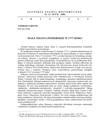 S Ł U P S K I Małe E Smiasta T U pomorskie D I A Hw I1777 S Troku ORYCZNE Nr 12 R O K 2006 A R T Y K U Ł 9 Y ANDRZEJ GROTH PAP SŁUPSK MAŁE MIASTA POMORSKIE W 1777 ROKU Artykuł dotyczy małych miast, które w czasach Rzeczypospolitej wchodziły w skład województwa pomorskiego. Po podpisaniu traktatu rozbiorowego (5 sierpnia 1772 r.) pruska administracja na polecenie Fryderyka II natychmiast przystąpiła do wprowadzania w Ŝycie traktatowych postanowień. Dnia 13 września 1772 r. pruska komisja do formalnego przejęcia władzy, złoŜona z cywilnych urzędników, w asyście wojskowej przekroczyła granice północnej części Rzeczypospolitej. Tu podzieliwszy się na podkomisje działające w róŜnych rejonach, dokonała aktu przejęcia władzy. Aneksja odbywała się według jednolitego schematu. Rozlepiano lub odczytywano patent królewski mówiący o zaborze Prus Królewskich, zajmowano dotychczasowe urzędy oraz pieczętowano kasy i archiwa. Przejęcie ziem województwa pomorskiego nastąpiło w dniach 13-23 września 1772 roku1. Jednym z pierwszych posunięć władz pruskich było wprowadzenie nowej administracji. NajwyŜszą władzą prowincji była zlokalizowana w Kwidzynie Kamera Wojny i Domen. Był to organ kolegialny, zarządzający aparatem administracyjnym Prus Zachodnich, dobrami państwowymi (domenami), sprawami wojskowymi, podatkami i niektórymi działami sądownictwa. Kamera sprawowała takŜe nadzór nad miastami. W tym celu podzielona była na cztery okręgi podatkowe: kwidzyńsko-malborski, chełmińsko-michałowski, chojnicki i tczewsko-starogardzki. Okręg chojnicki obejmował miasta: Chojnice, Tucholę, Świecie, Biały Bór, Czarne, Człuchów, Debrzno i Lędyczek, tczewsko-starogardzki: Tczew, Puck, Wejherowo, Starogard, Nowe, Skarszewy, Kościerzynę i Gniew. Na czele okręgu podatkowego stał radca podatkowy (Steuerrat). Do jego obowiązków naleŜał nadzór nad kasą miejską, handlem i rzemiosłem, troska o rozwój gospodarczy miast i podnoszenie ich moŜliwości podatkowych2. Podporządkowanie miast Kamerze oznaczało likwidację dawnego samorządu i autonomii i poddanie ich silnej kontroli państwowej. ——————— 1 2 M. Bär, Westpreussen unter Friedrich dem Grossen, Bd. 2, Leipzig 1909, s. 551-558. TenŜe, Die Behördenverfassung in Westpreussen seit der Ordenzeit, Danzig 1912, s. 94-95.