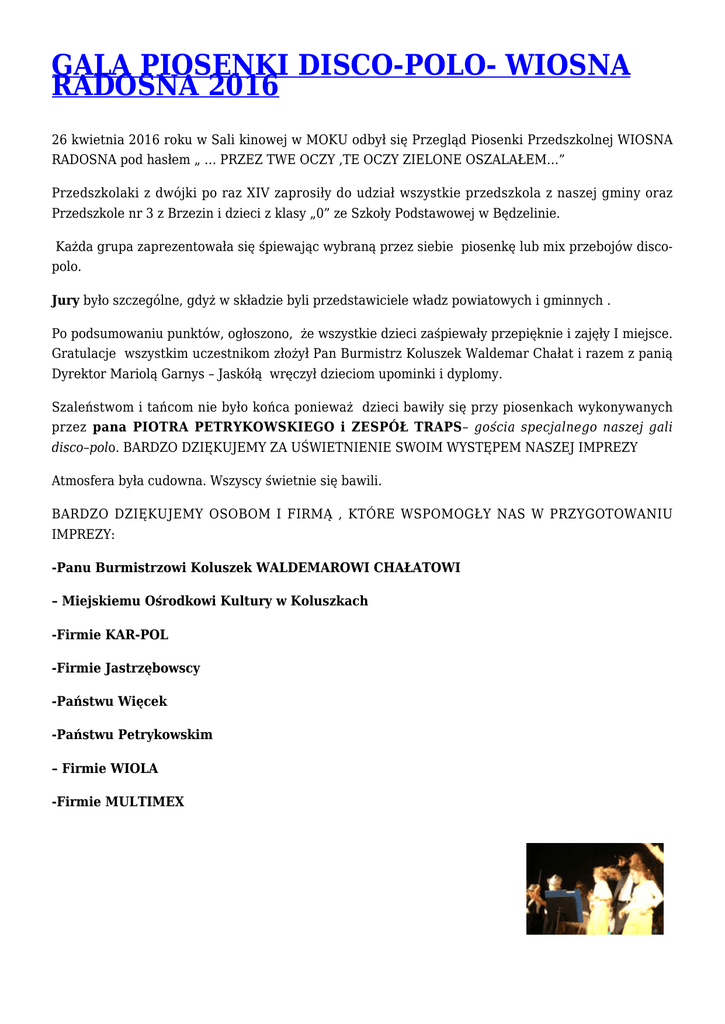 GALA PIOSENKI DISCO-POLO- WIOSNA RADOSNA 2016 26 kwietnia 2016 roku w Sali kinowej w MOKU odbył się Przegląd Piosenki Przedszkolnej WIOSNA RADOSNA pod hasłem „ … PRZEZ TWE OCZY ,TE OCZY ZIELONE OSZALAŁEM…” Przedszkolaki z dwójki po raz XIV zaprosiły do udział wszystkie przedszkola z naszej gminy oraz Przedszkole nr 3 z Brzezin i dzieci z klasy „0” ze Szkoły Podstawowej w Będzelinie. Każda grupa zaprezentowała się śpiewając wybraną przez siebie piosenkę lub mix przebojów discopolo. Jury było szczególne, gdyż w składzie byli przedstawiciele władz powiatowych i gminnych . Po podsumowaniu punktów, ogłoszono, że wszystkie dzieci zaśpiewały przepięknie i zajęły I miejsce. Gratulacje wszystkim uczestnikom złożył Pan Burmistrz Koluszek Waldemar Chałat i razem z panią Dyrektor Mariolą Garnys – Jaskółą wręczył dzieciom upominki i dyplomy. Szaleństwom i tańcom nie było końca ponieważ dzieci bawiły się przy piosenkach wykonywanych przez pana PIOTRA PETRYKOWSKIEGO i ZESPÓŁ TRAPS– gościa specjalnego naszej gali disco–polo. BARDZO DZIĘKUJEMY ZA UŚWIETNIENIE SWOIM WYSTĘPEM NASZEJ IMPREZY Atmosfera była cudowna. Wszyscy świetnie się bawili. BARDZO DZIĘKUJEMY OSOBOM I FIRMĄ , KTÓRE WSPOMOGŁY NAS W PRZYGOTOWANIU IMPREZY: -Panu Burmistrzowi Koluszek WALDEMAROWI CHAŁATOWI – Miejskiemu Ośrodkowi Kultury w Koluszkach -Firmie KAR-POL -Firmie Jastrzębowscy -Państwu Więcek -Państwu Petrykowskim – Firmie WIOLA -Firmie MULTIMEX